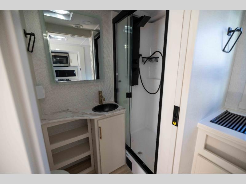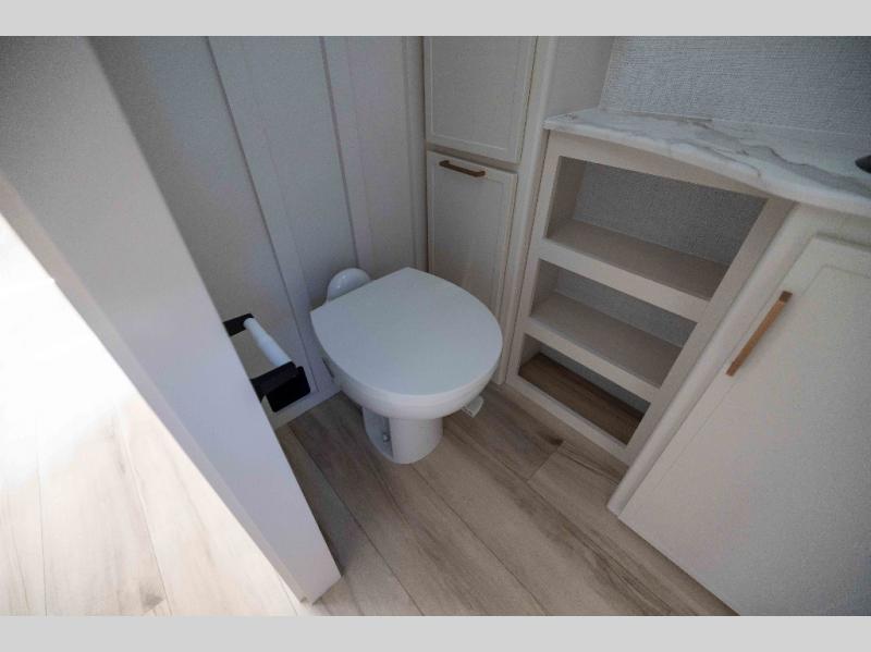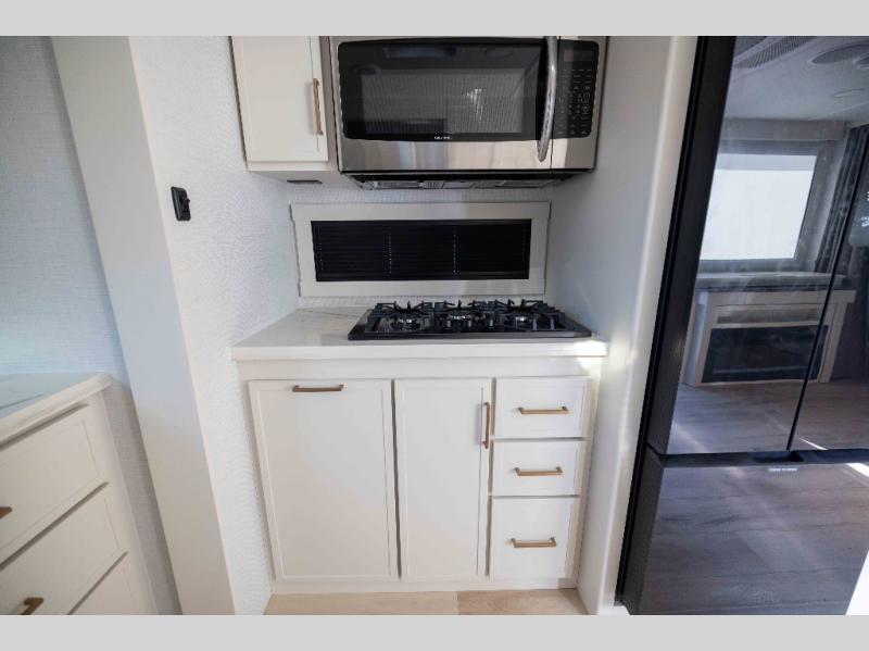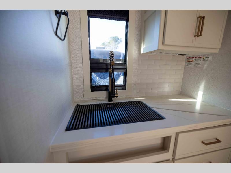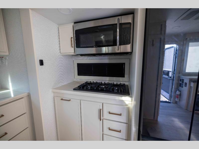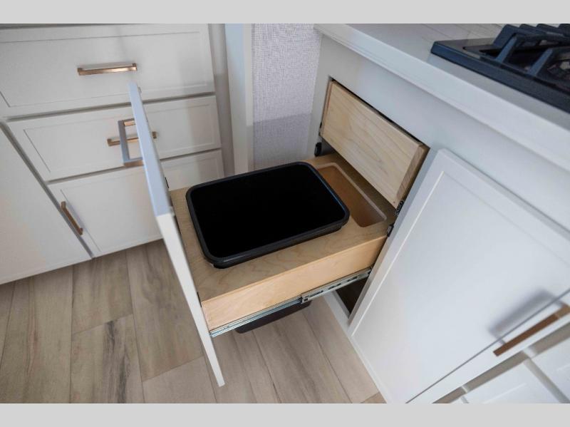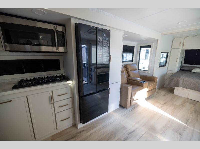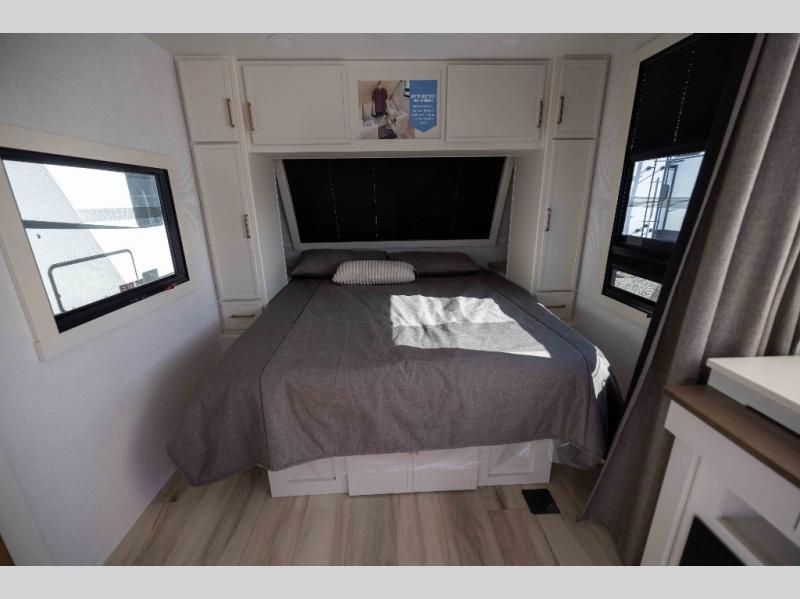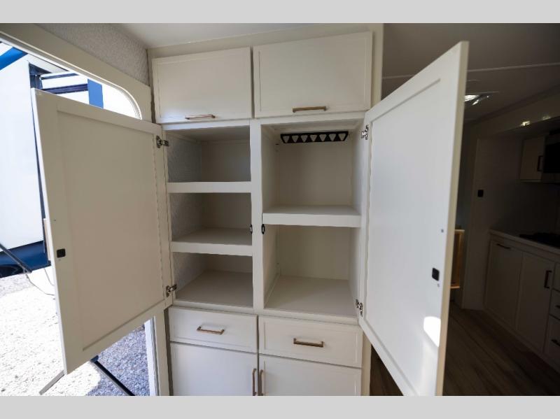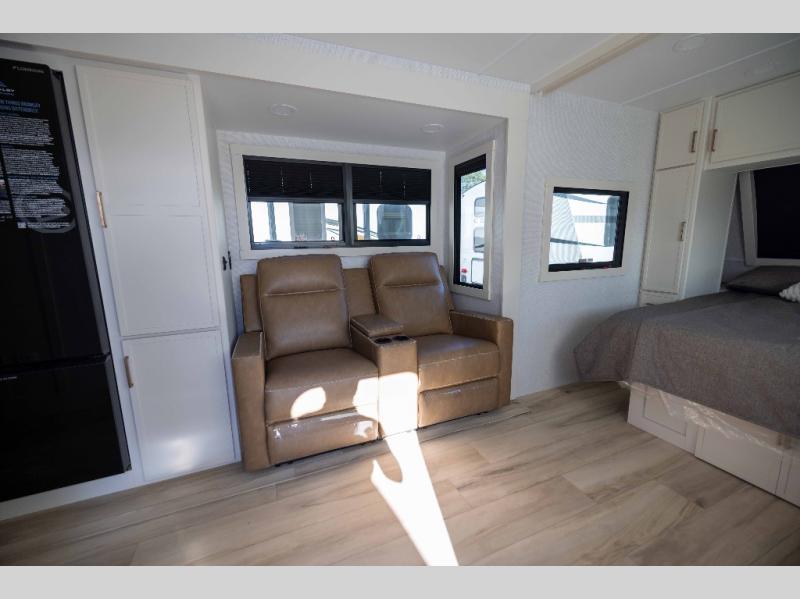 You'll love the amount of space you have in this travel trailer thanks to the large slide out in the main living area. There is comfy theater seating here, along with the kitchen appliances plus a pantry with drawers and an outlet. And a tri-fold sofa option can be chosen in place of theater seating if you're needing sleeping space for guests. You can dine at the pull-out dining table with a drawer, which is right in front of the pull-down interior/exterior screen. A full bath with a 36" x 30" shower will let you freshen up each day, and the king bed in the front bedroom includes a room divider in front for added privacy!