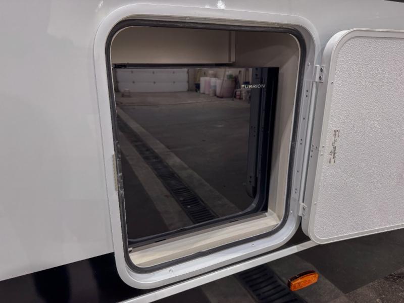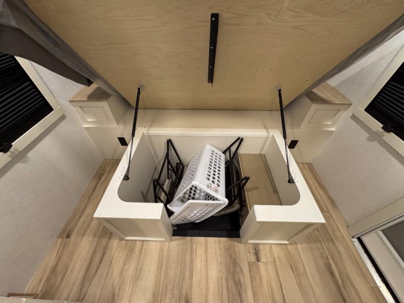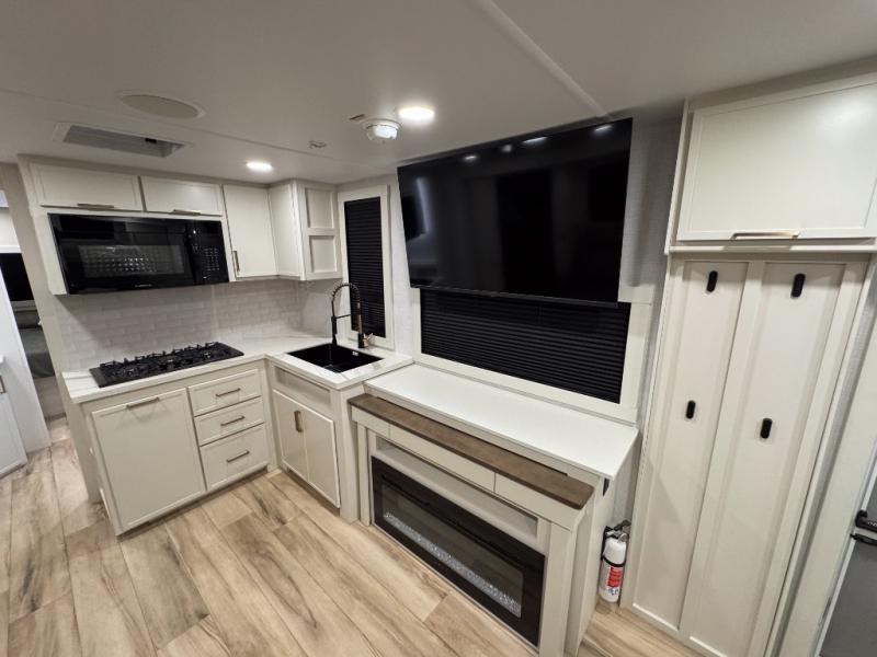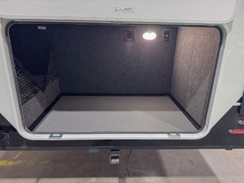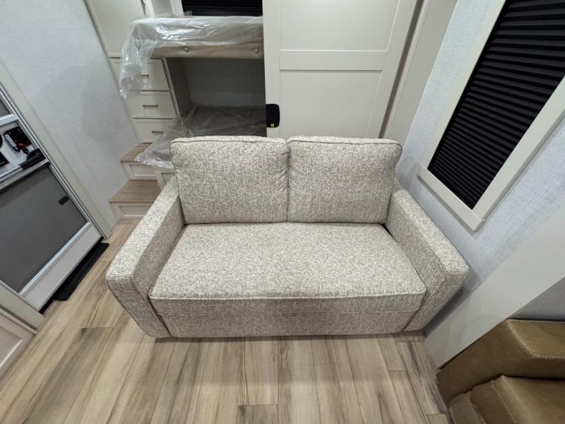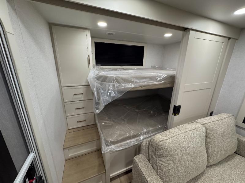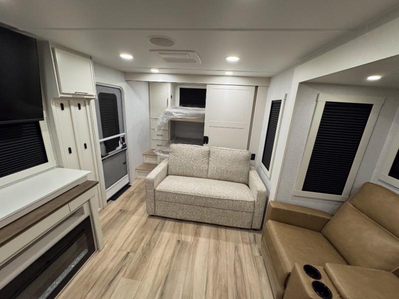 Grab the whole gang and head to the campground in this bunkhouse travel trailer! The 48" x 74" bunks can sleep two to four, and there is a floor to ceiling storage cabinet with drawers, a top bunk window, outlets and USB ports, plus double space-saving pocket doors. Up front you'll find the master bedroom with a 66" x 80" king bed and a MaxSpace Split-Level Wardrobe, TV prep, your own exterior entry door, plus quick access to the walk-thru bath. Everyone can meet in the combined kitchen and living room to relax on the theater seating or tri-fold sofa, and there is pull-out dining table with a drawer and a window above for great outdoor views. The outside is just as accommodating as the inside with its exterior speakers, LED chassis lighting, rear storage compartment with dual access doors, and exterior 12V refrigerator for cold drinks!