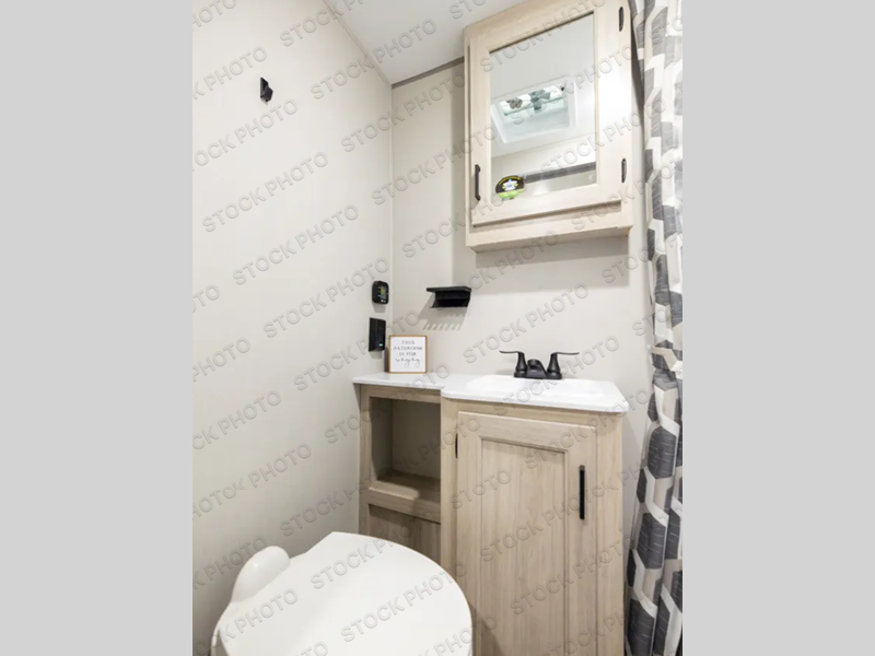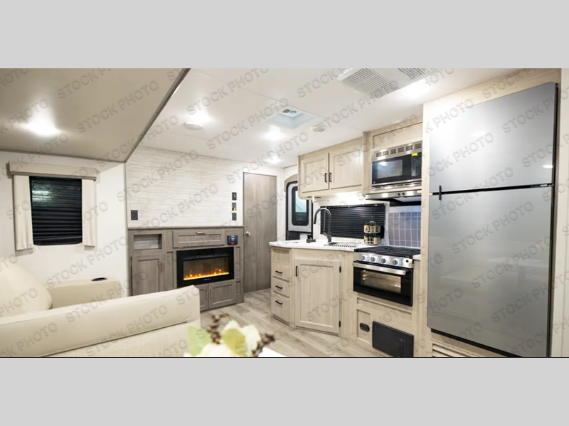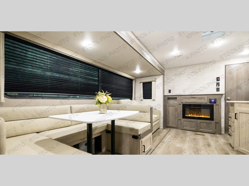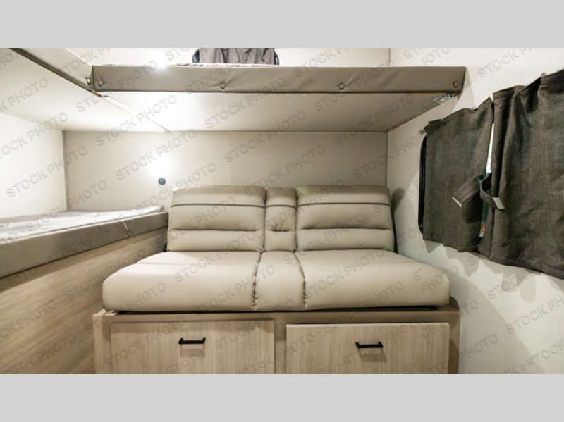 Not only will you be comfortable in this trailer, but your friends will also have comfort and privacy thanks to having their own bunkhouse, and you'll have a front bedroom where you can sleep like royalty! There are three bunk beds and a jack knife sofa with storage totes below plus a TV cabinet if you want to add a television here. The combined living and kitchen is spacious thanks to the slide out U-shaped dinette and sofa with drink holders. You can even add the fireplace option if you want that feature. The cook will have full amenities to whip up meals including overhead cabinets for dishes and snacks. And the exterior camper kitchen allows the cook to visit with everyone outside under the 18' electric awning that includes multicolor LED lights with a remote.