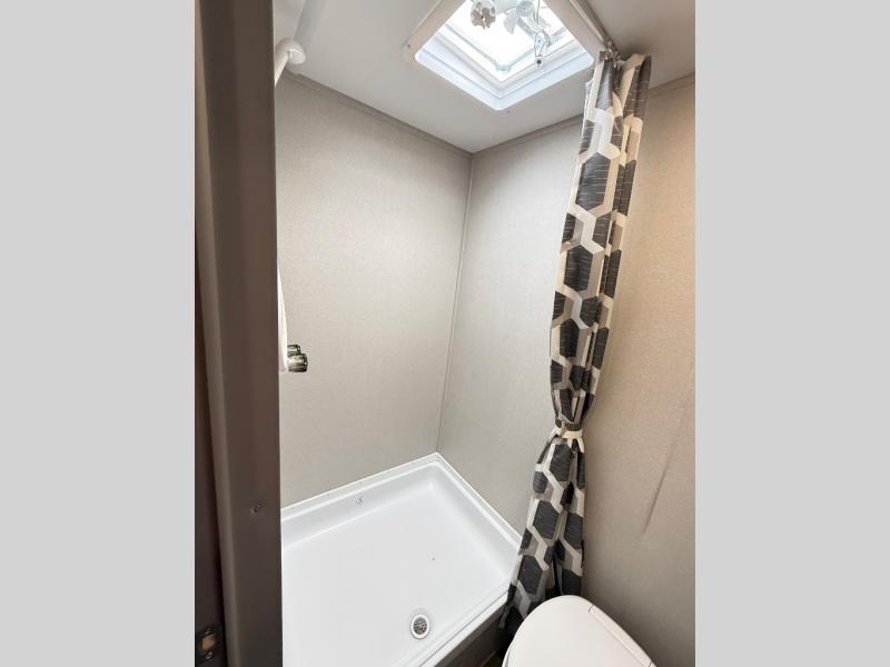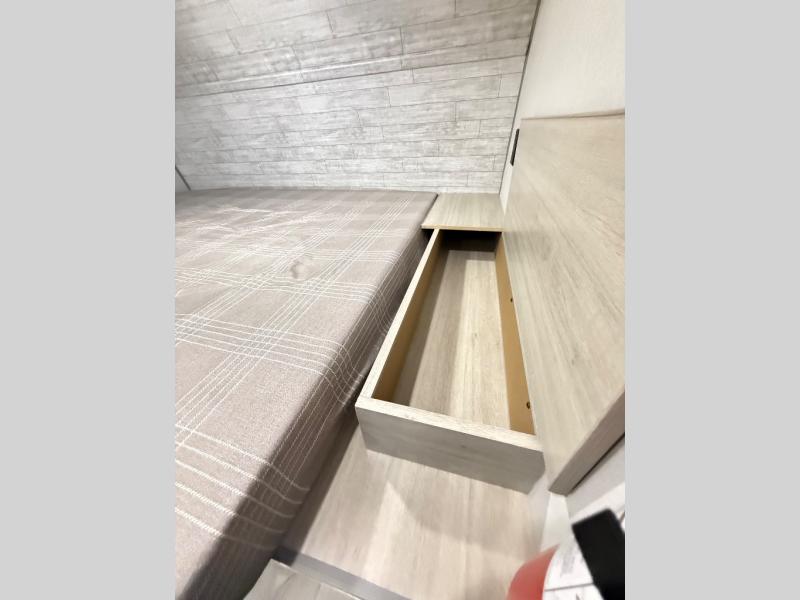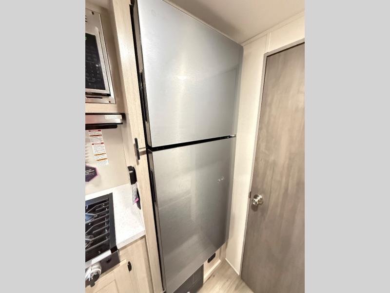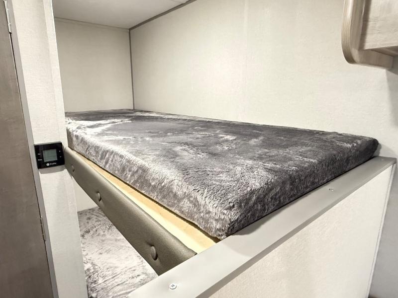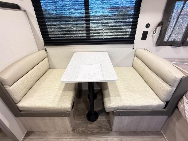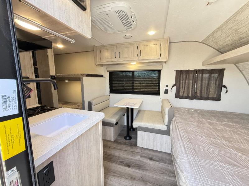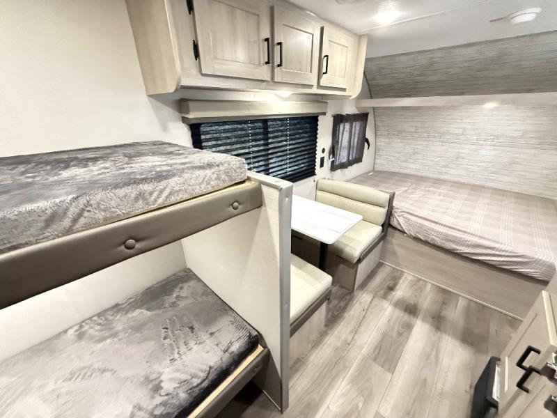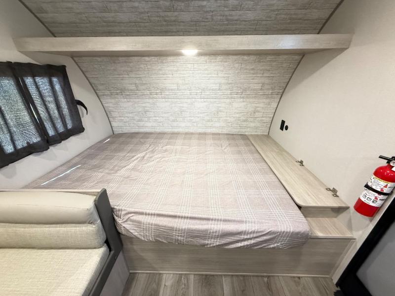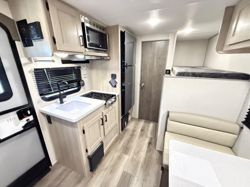 This travel trailers is perfect for a young family or smaller group. You can easily sleep four or more with the rear set of bunk beds and queen bed up front. There is also a booth dinette for inside down-time, as well as complete kitchen and bath amenities so you can cook and stay clean while traveling. The rear corner bath features a toilet and 36" x 30" shower, and it's conveniently located next to the bunk beds which is great for little ones at night. Cooking inside will be easy with a GE stainless two-burner cooktop and single sink, plus there is also a GE microwave oven for snacks and things that you can easily warm up. If you plan to spend most of your time outdoors, you will find plenty of storage space in the front exterior storage compartment, and there is also plenty of storage inside as well.