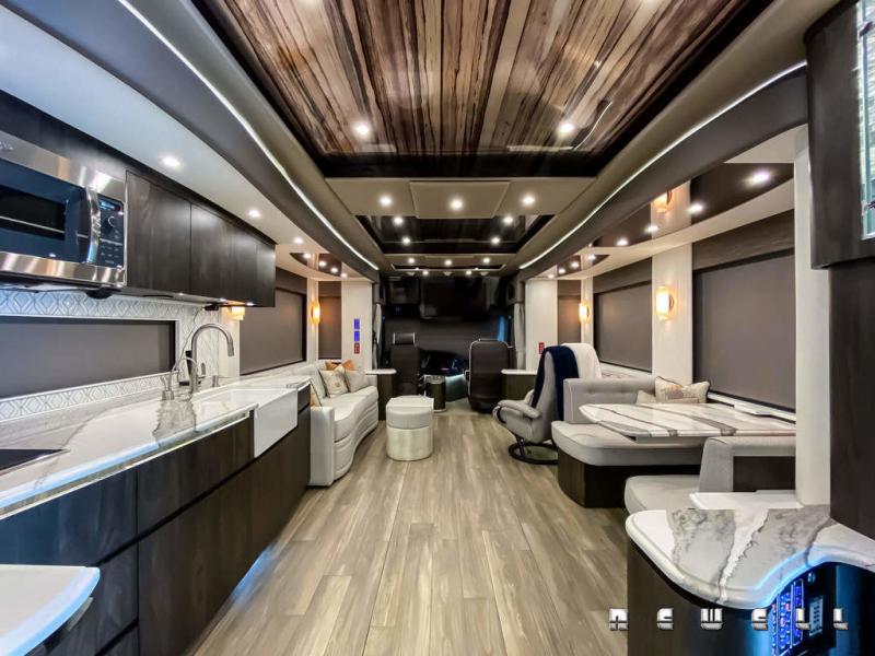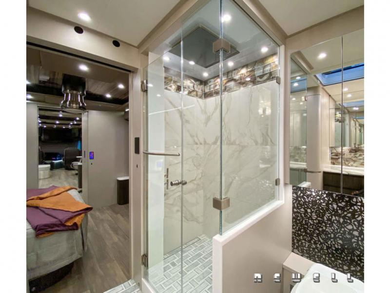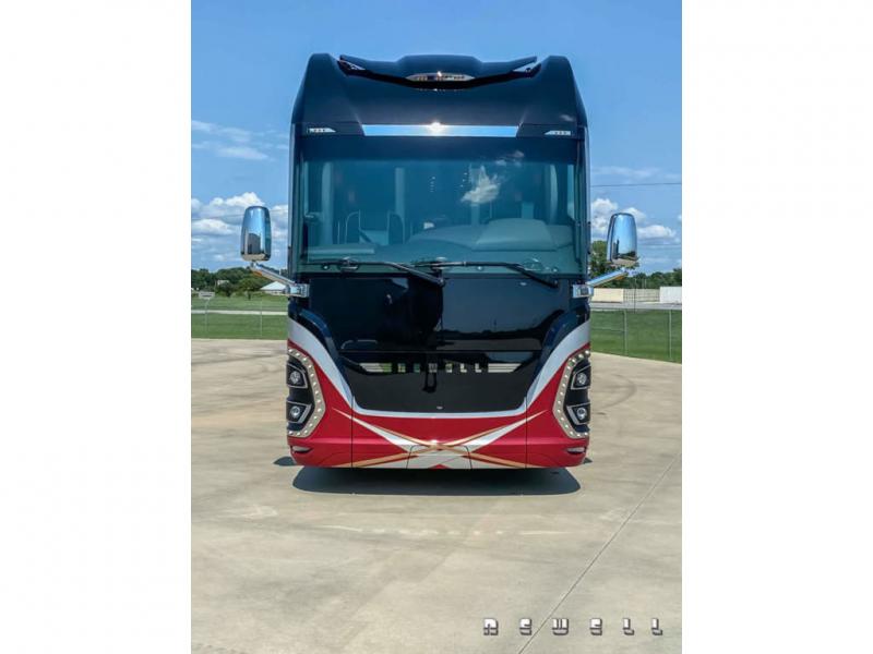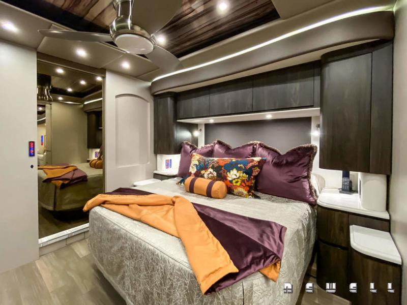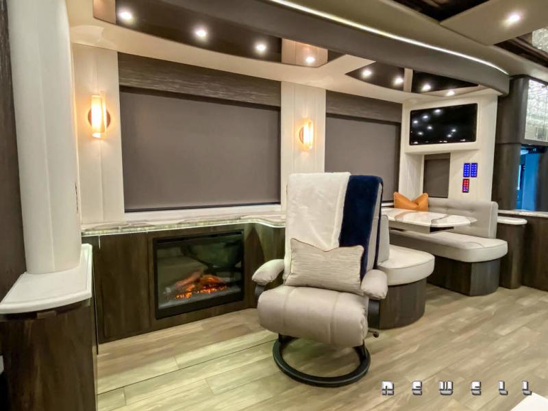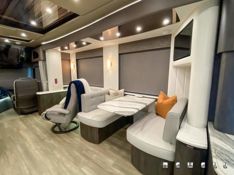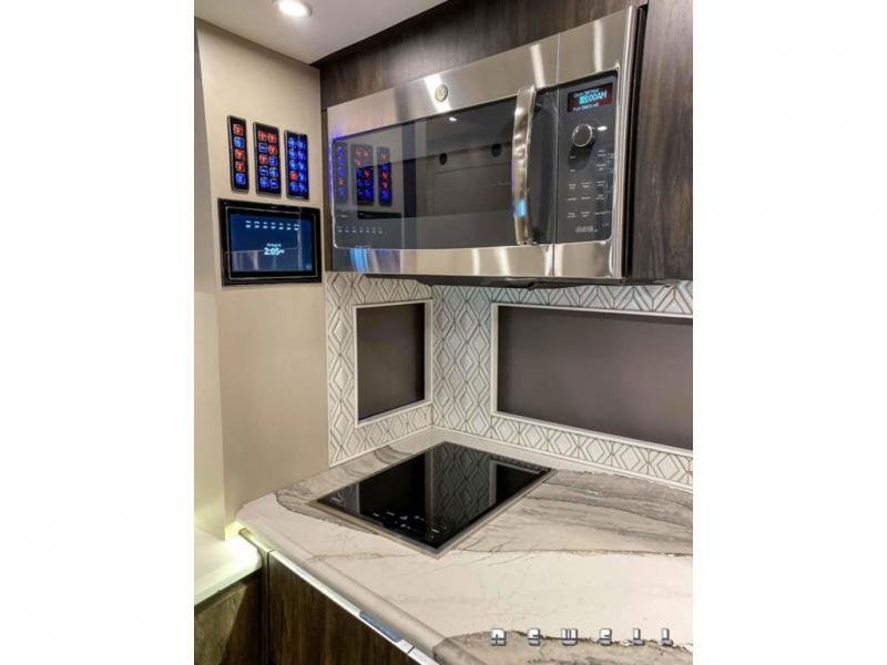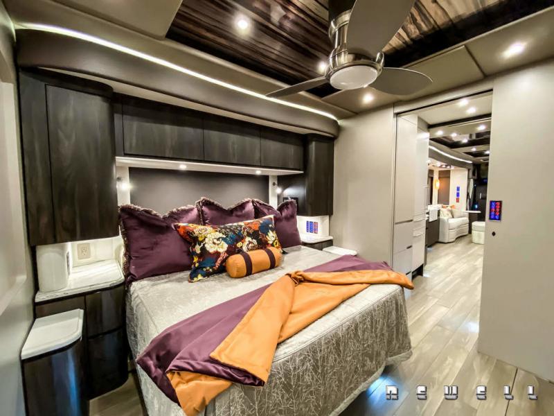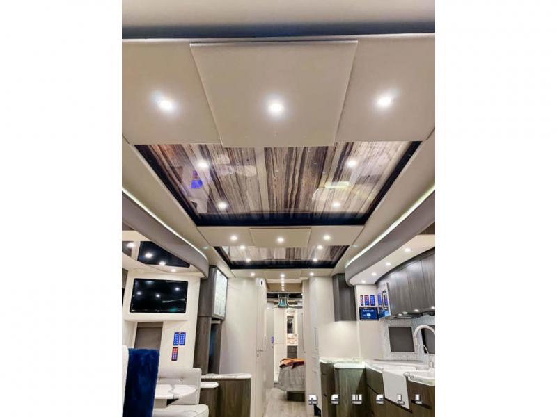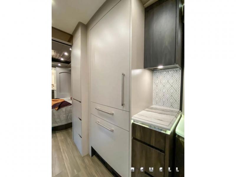 Come travel the state or country in this cozy coach! Once you arrive at your destination, the reclining/swivel pilot seats can become a part of the living area where your crew is relaxing on the sofa and two chairs with a table. You'll find an induction cooktop in the kitchen to prepare meals, plus a stainless steel double door refrigerator and a pantry to hold food for the whole week. A king bed slide out in the rear corner bedroom will have you feeling right at home, and there is a bedroom TV to watch movies in bed plus power outlets on both sides of the bed to charge your phone at night. Having a full bath onboard is sure to come in handy, especially with its glass shower door, skylight, and on-demand water heater. This model also includes two closets, one with washer and dryer prep to keep your clothes wrinkle-free plus more storage space throughout for camp gear and necessities!