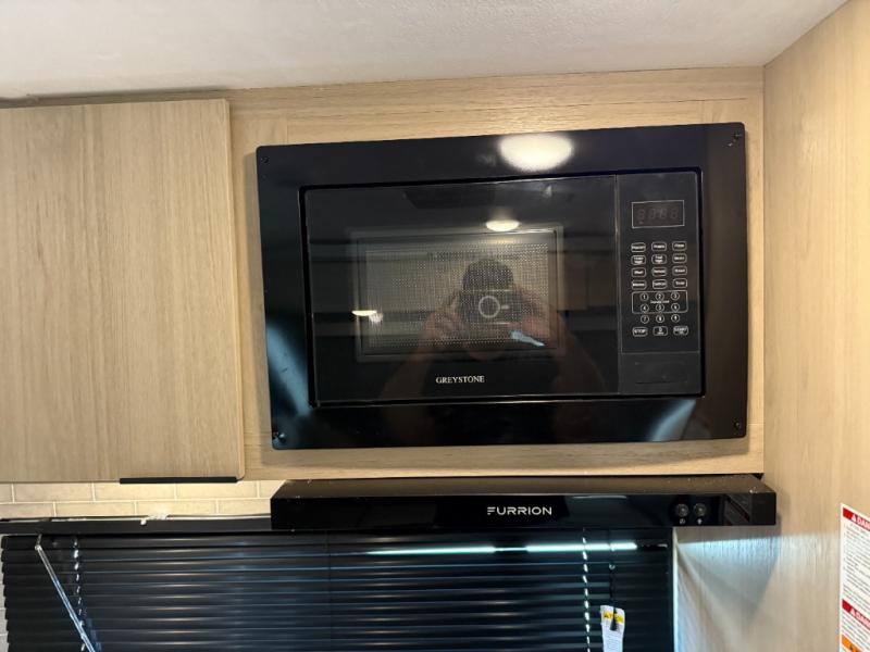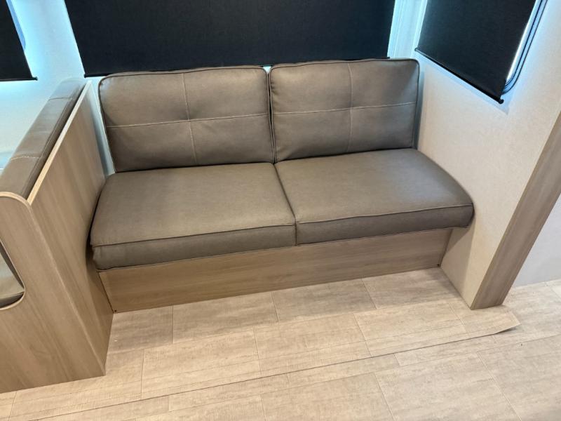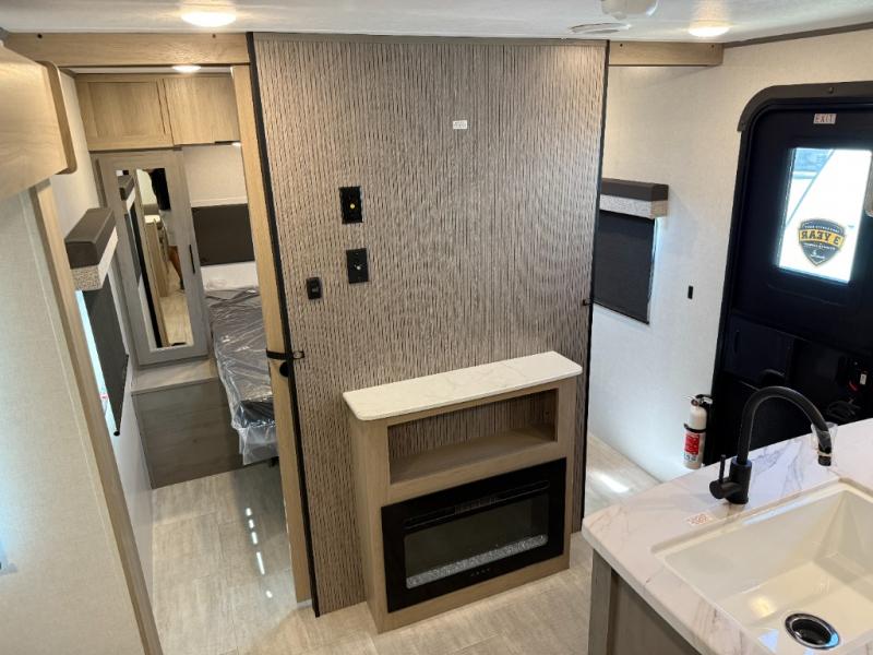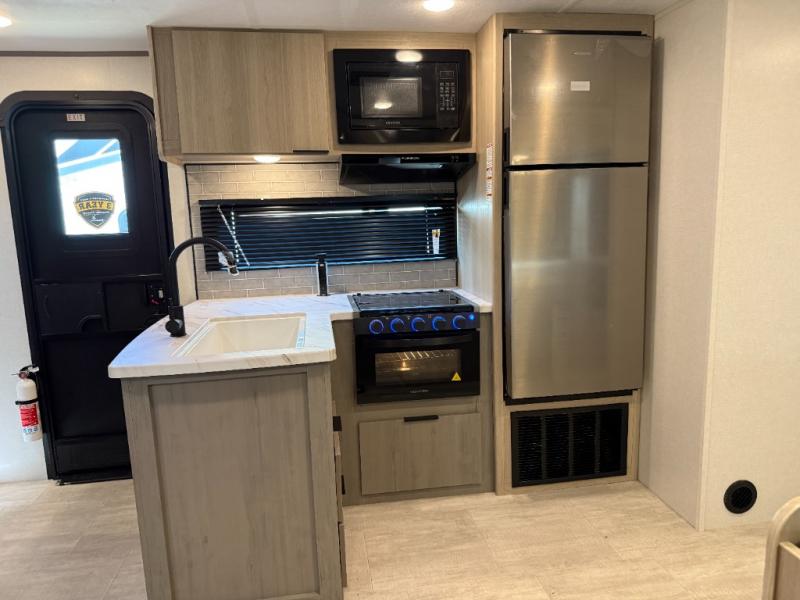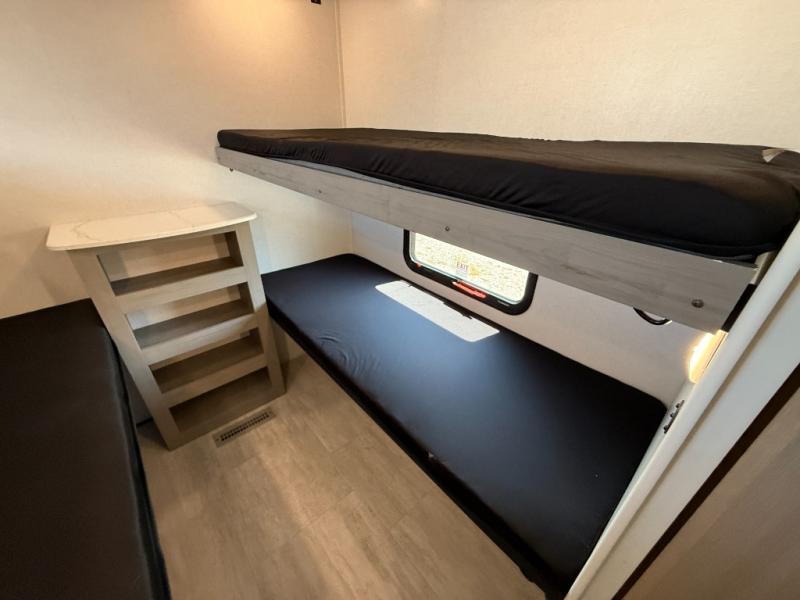 This travel trailer is perfect for weekend excursions or extended getaways at your favorite state park. You will have your own queen bed up front with storage space for your things, and the rear private bunkhouse will be perfect for guests. Here, you'll find a set of bunk beds plus a fold-up bunk over a booth dinette so there is a place to eat or play games back here. The full kitchen will let you cook meals each day, and the 10 cu. ft. refrigerator will keep your food fresh. Outside, a 14' power awning will provide some shade, and an outdoor refrigerator will keep cold drinks close by!
