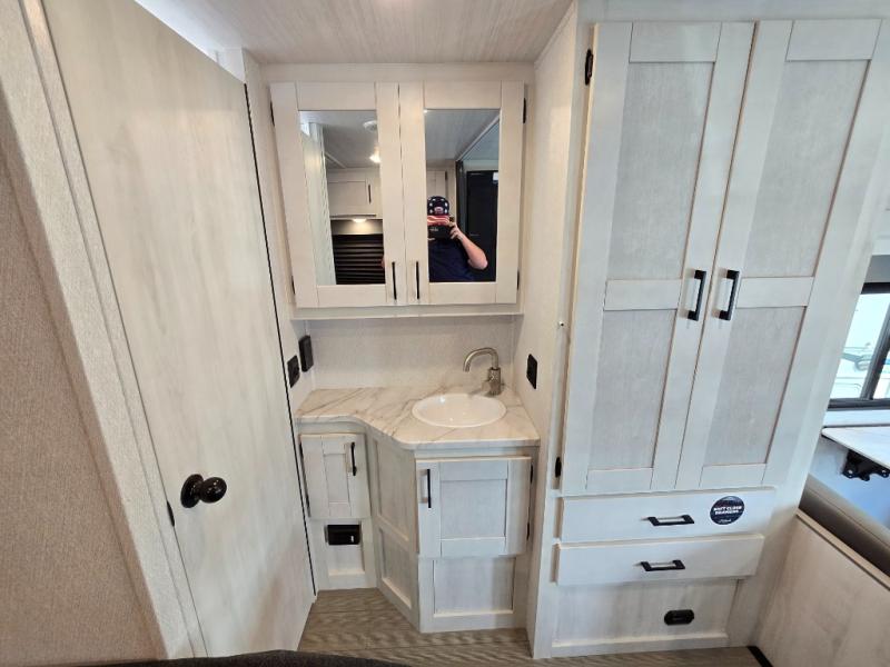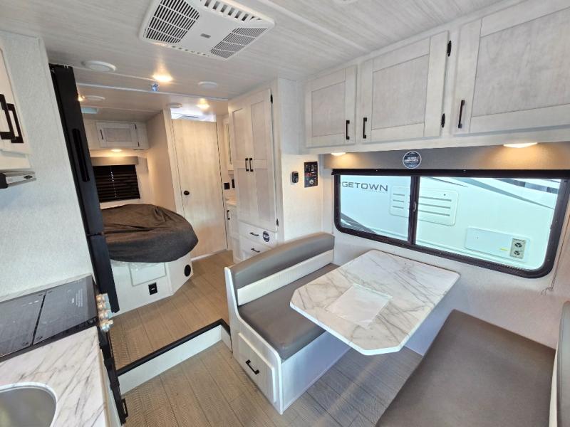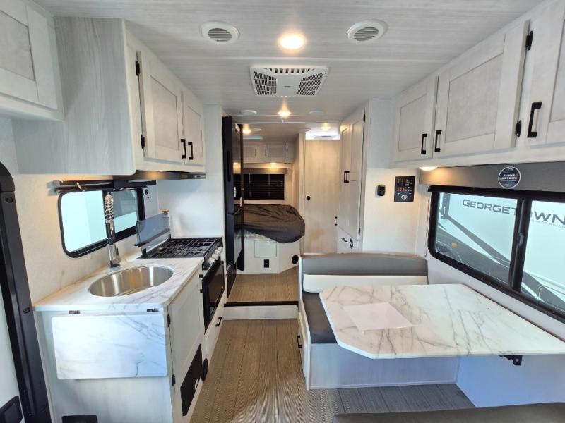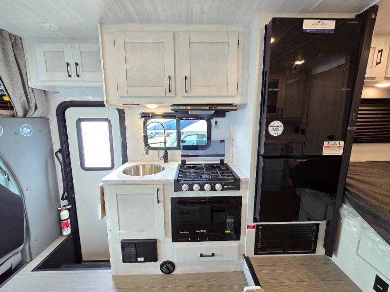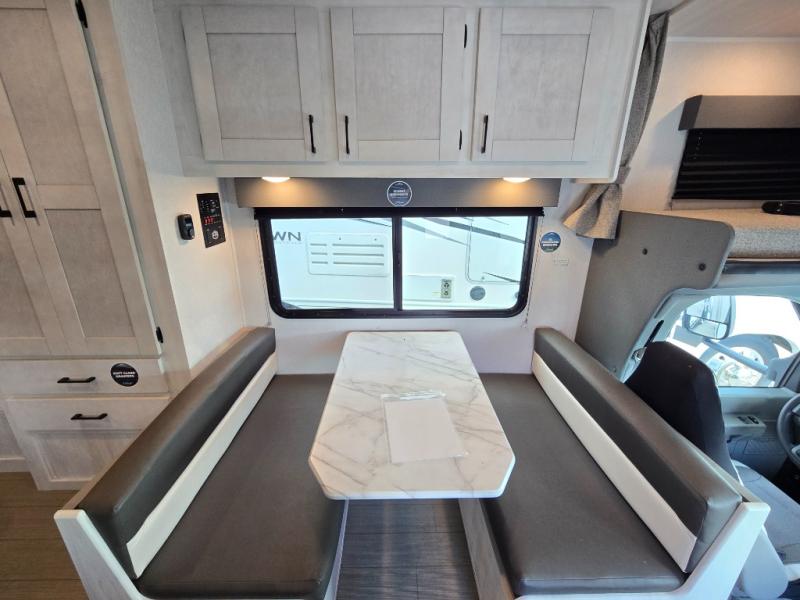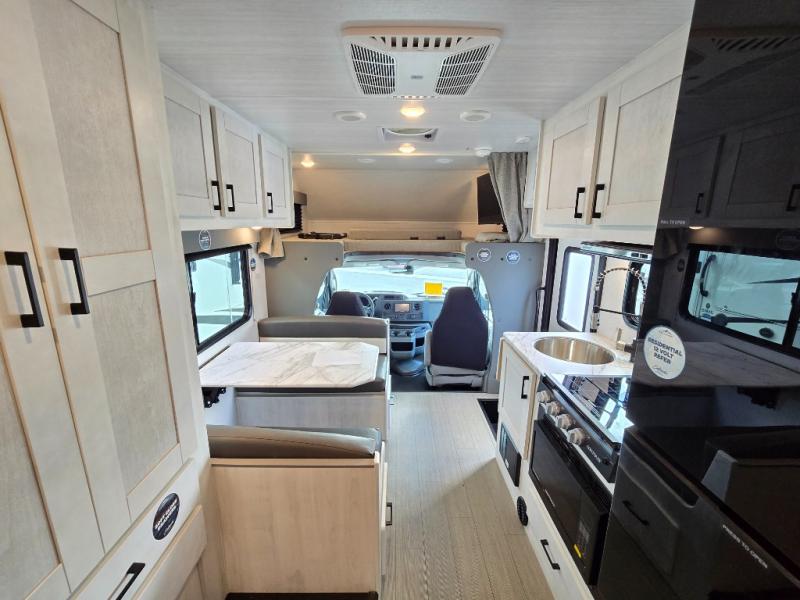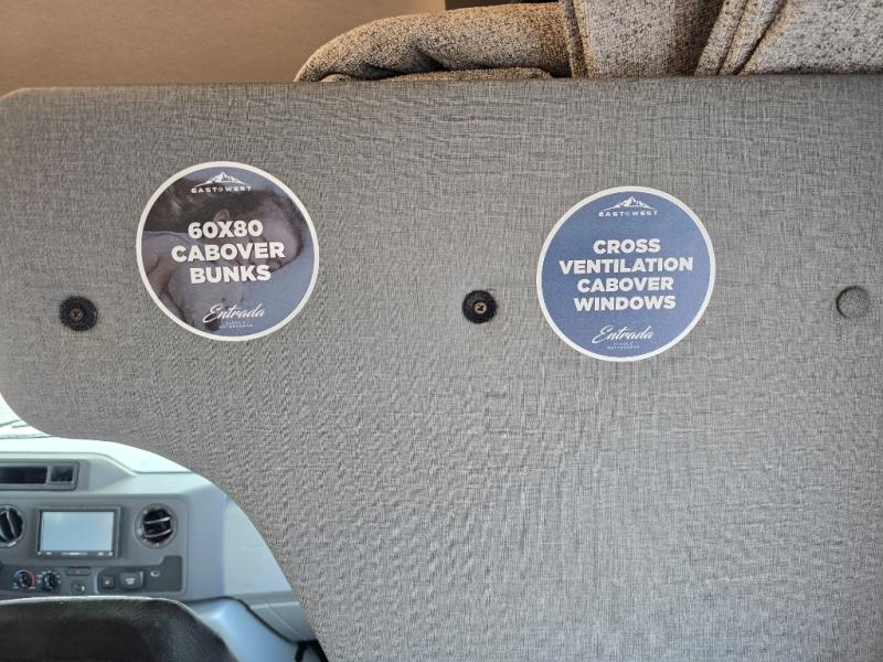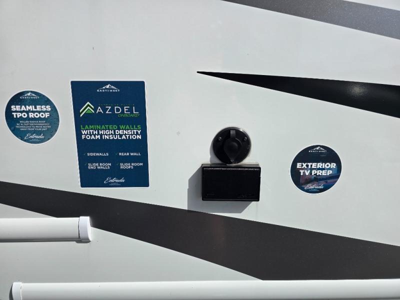With any Entrada Class C gas motorhome from EAST TO WEST, the construction consists of a one-piece painted fiberglass front cap, a TPO roof membrane, and 2" Azdel composite sidewalls for added durability. There are rotocast exterior storage compartments with slam latch doors, along with an exterior LP Quick Connect, and a power awning with an LED light strip. You will also find rear and sideview cameras to help make maneuvering and parking your RV easier than ever. Inside, you'll feel right at home with soft close hardwood cabinet doors and drawers, a high-altitude tankless water heater, plus a 12V smart TV and USB ports to keep your electronics charged up!