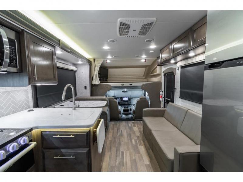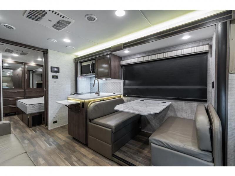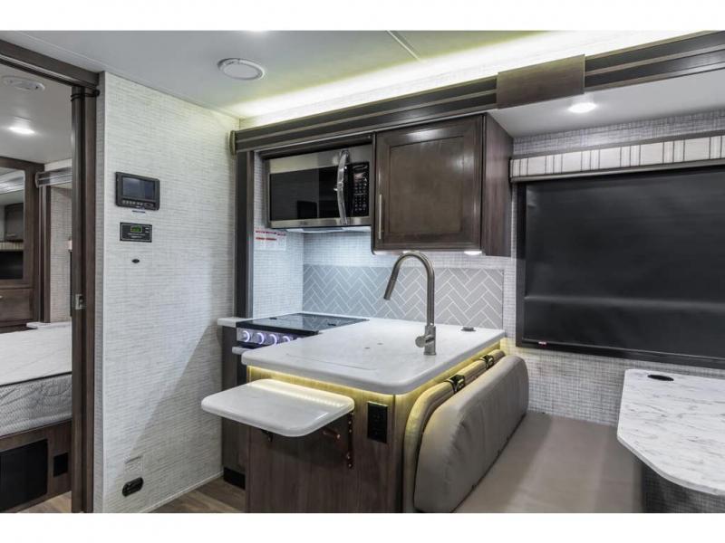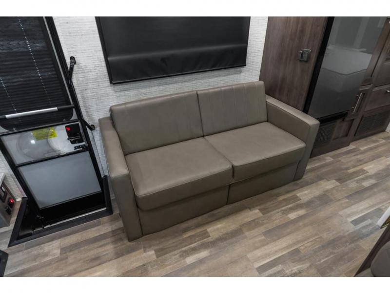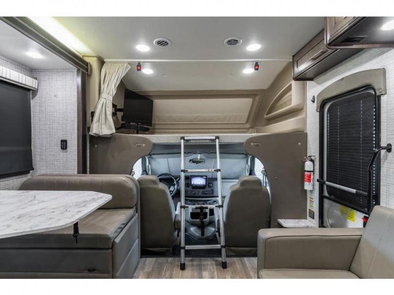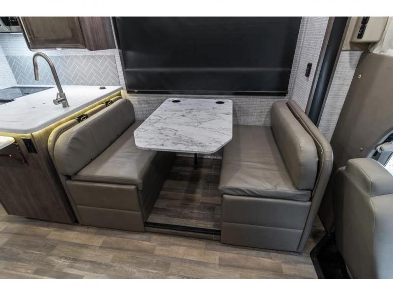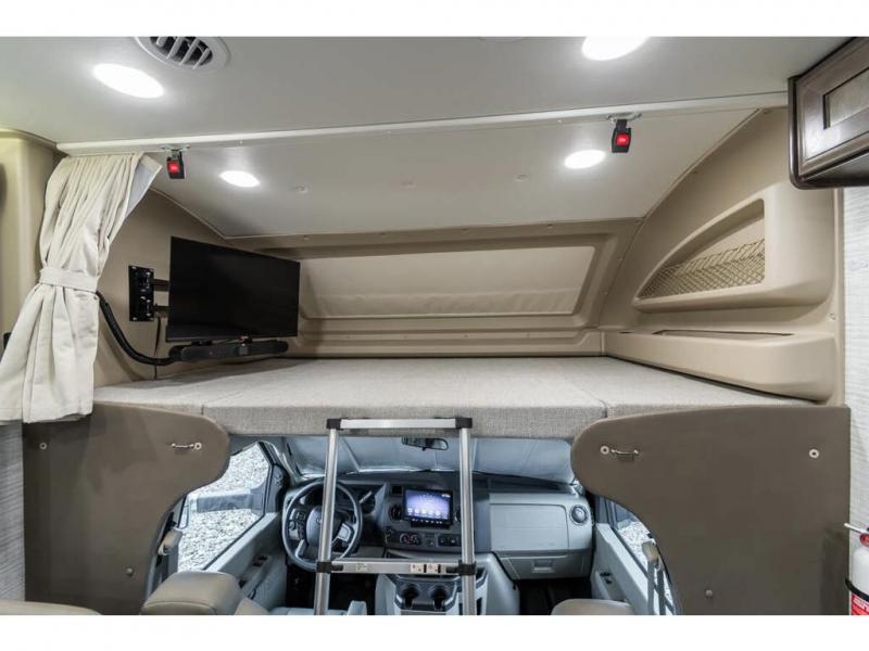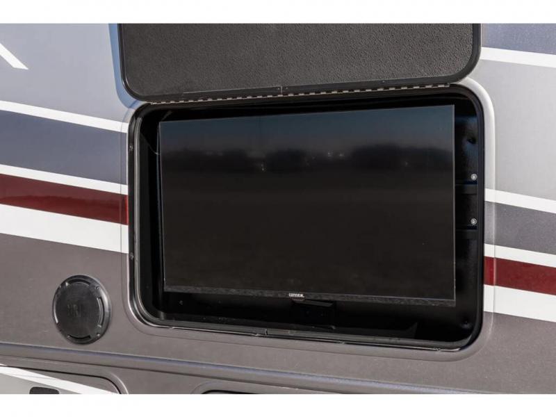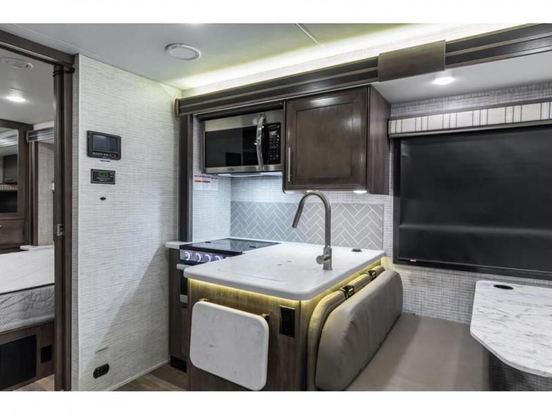 You can bring a few guests to join in on the fun with this motorhome! The bunk over cab and 66" x 76" king bed offer comfortable places to sleep, plus you can transform the booth dinette and the sofa into extra sleeping spaces if needed. Everyone can freshen up each morning with the 30" x 36" shower in the rear corner bathroom, and keep their bellies full with a Furrion all-in-one cooktop and oven plus a residential microwave. There is even a countertop extension to make meal prepping easier. Take the fun outside and watch movies on the exterior LED HD Smart TV while staying protected by the 18' electric awning with LED lights!