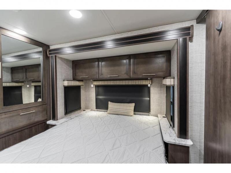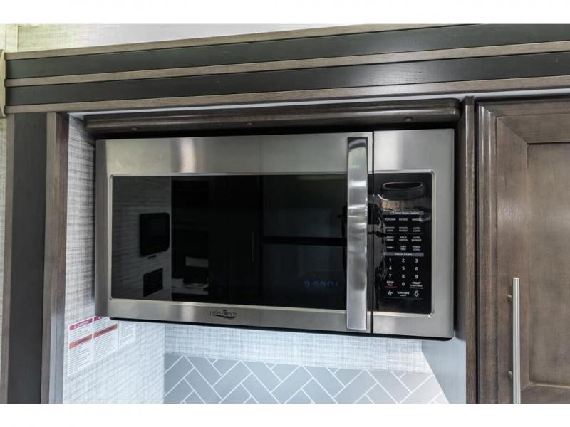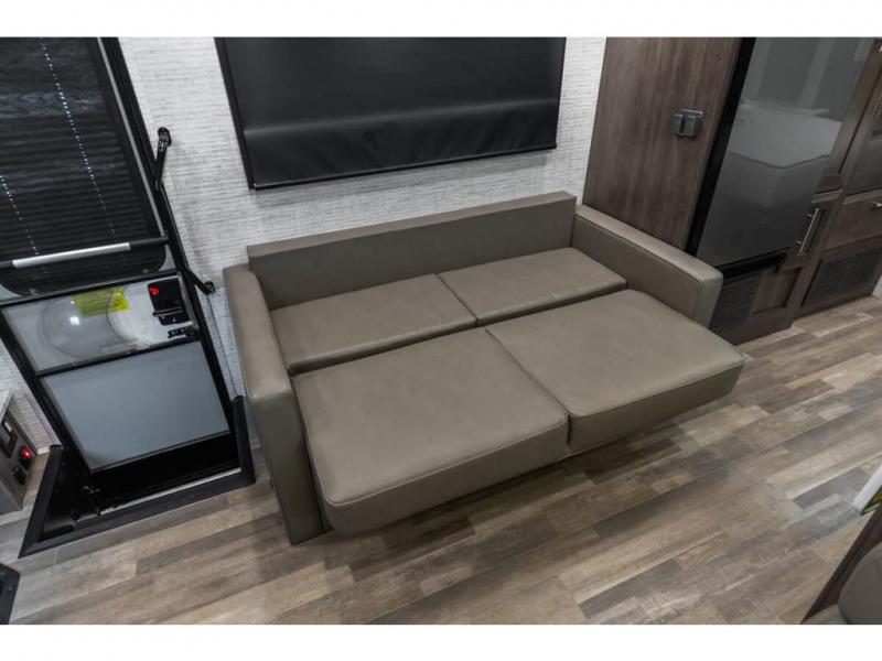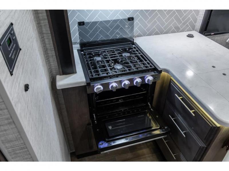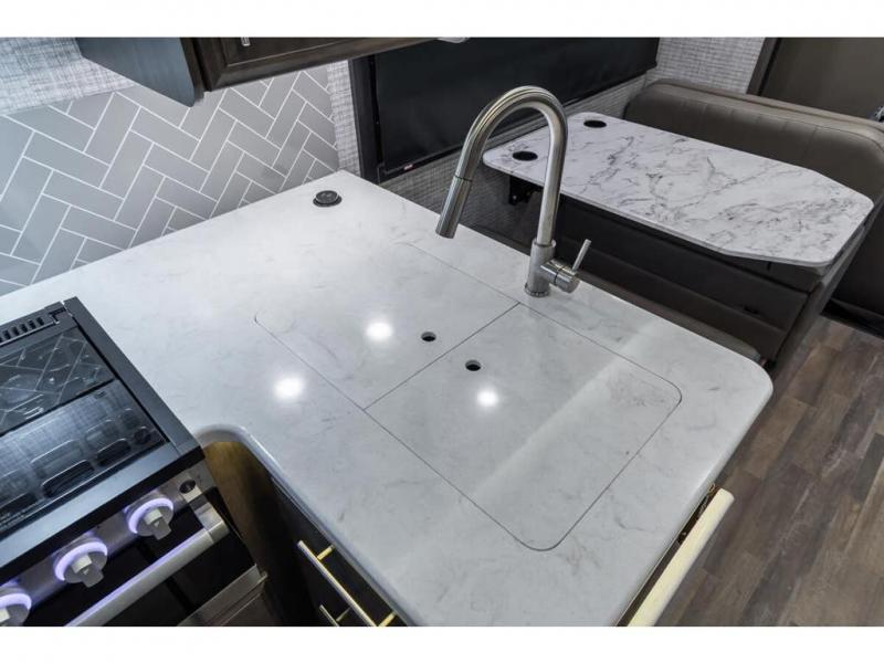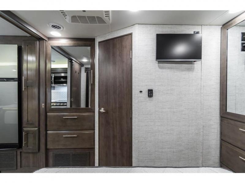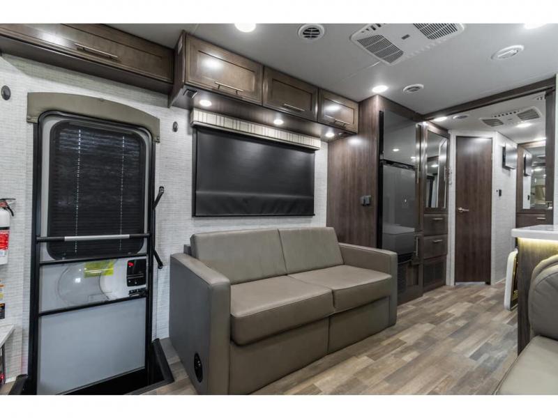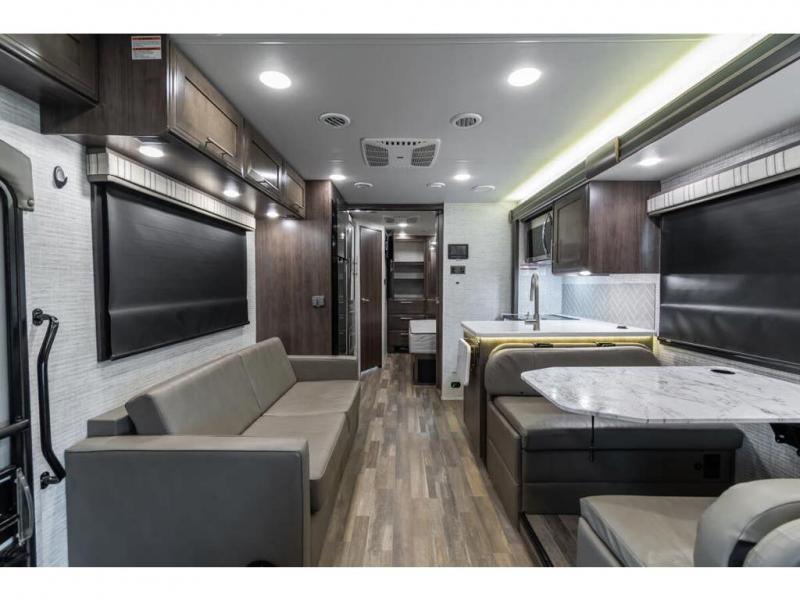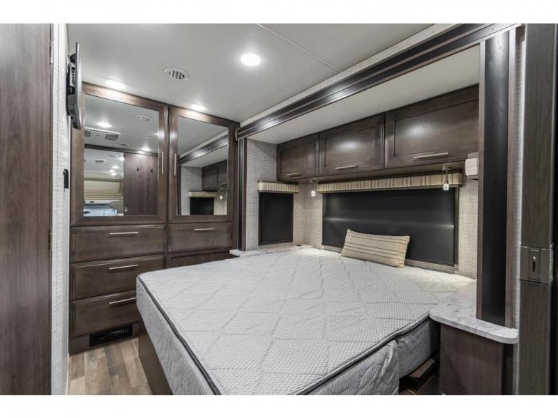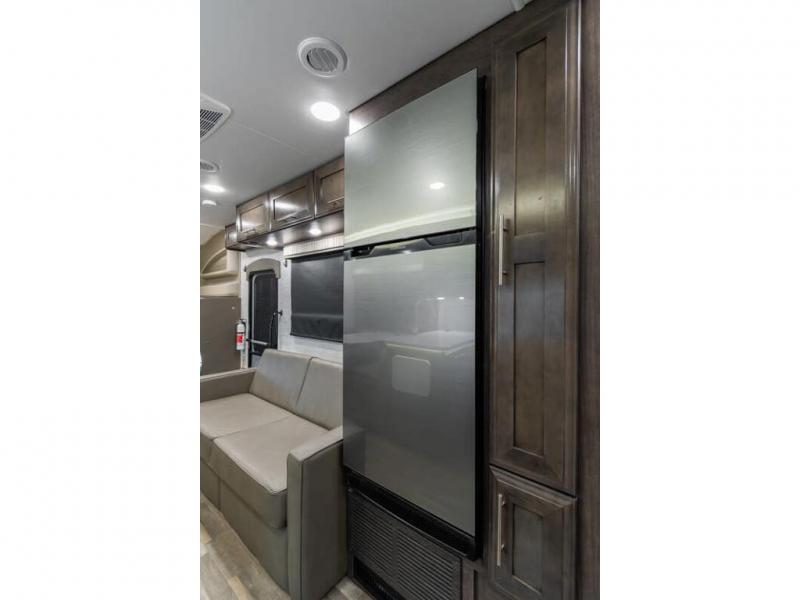 You can bring a few guests to join in on the fun with this motorhome! The bunk over cab and 66" x 76" king bed offer comfortable places to sleep, plus you can transform the booth dinette and the sofa into extra sleeping spaces if needed. Everyone can freshen up each morning with the 30" x 36" shower in the rear corner bathroom, and keep their bellies full with a Furrion all-in-one cooktop and oven plus a residential microwave. There is even a countertop extension to make meal prepping easier. Take the fun outside and watch movies on the exterior LED HD Smart TV while staying protected by the 18' electric awning with LED lights!