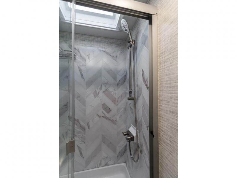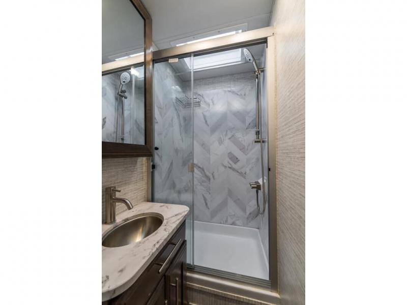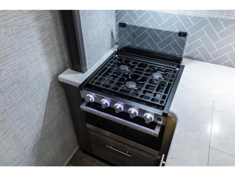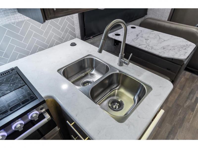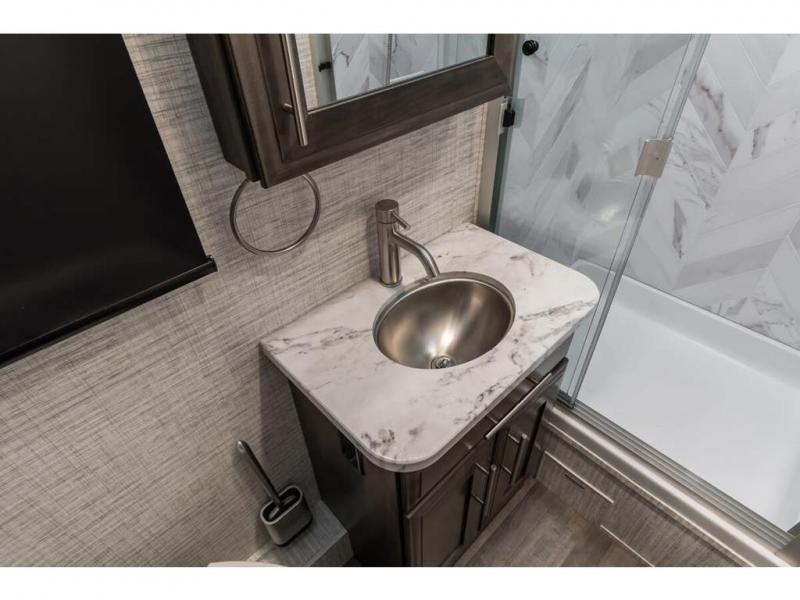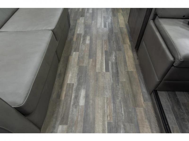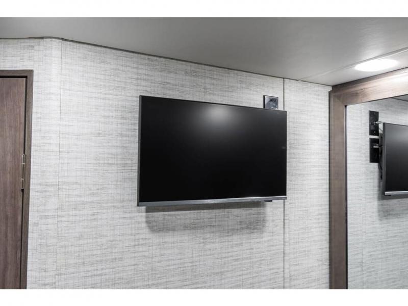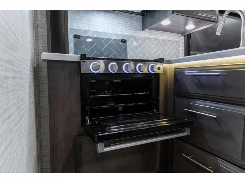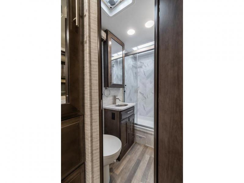 You can bring a few guests to join in on the fun with this motorhome! The bunk over cab and 66" x 76" king bed offer comfortable places to sleep, plus you can transform the booth dinette and the sofa into extra sleeping spaces if needed. Everyone can freshen up each morning with the 30" x 36" shower in the rear corner bathroom, and keep their bellies full with a Furrion all-in-one cooktop and oven plus a residential microwave. There is even a countertop extension to make meal prepping easier. Take the fun outside and watch movies on the exterior LED HD Smart TV while staying protected by the 18' electric awning with LED lights!