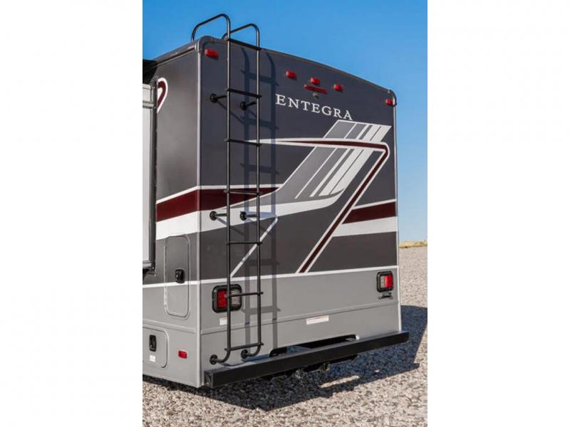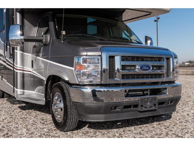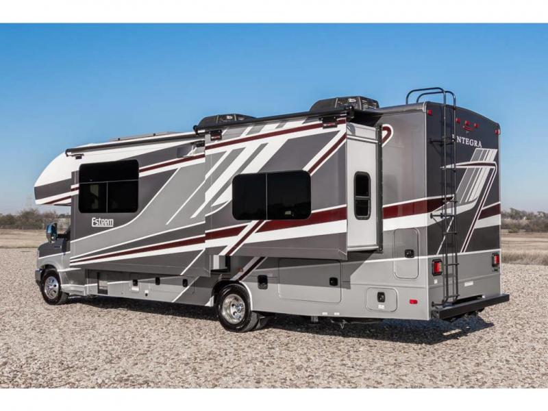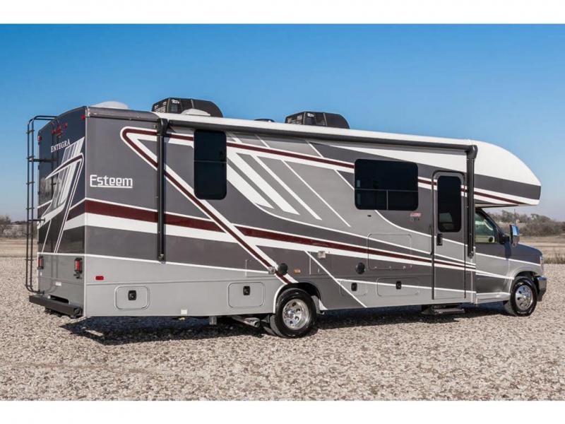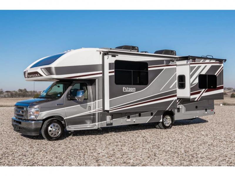 Make one of these Entegra Coach Esteem Class C gas motorhomes your own! The interior design includes solid-surface countertops that pair well with the many technological upgrades. The fully custom-molded ABS surround in the cab area features its signature panoramic window and power shade for a beautiful view while you drive and provide privacy at night. They also come with E-Z Drive Elite which has a computer-balanced driveshaft, Koni FSD shocks, Hellwig helper springs, and a heavy-duty rear stabilizer bar for a smooth ride. Automatic leveling jacks will make set-up a breeze and the electric awning with LED lights will create an outdoor living space where you can relax after unpacking. Inside, you'll enjoy hardwood cabinet doors and drawer fronts, blackout night roller shades, and high-intensity recessed LED ceiling lights to keep your space well lit. There is also a JBL audio system and a BMPRO total coach control system to easily manage your unit's functions!