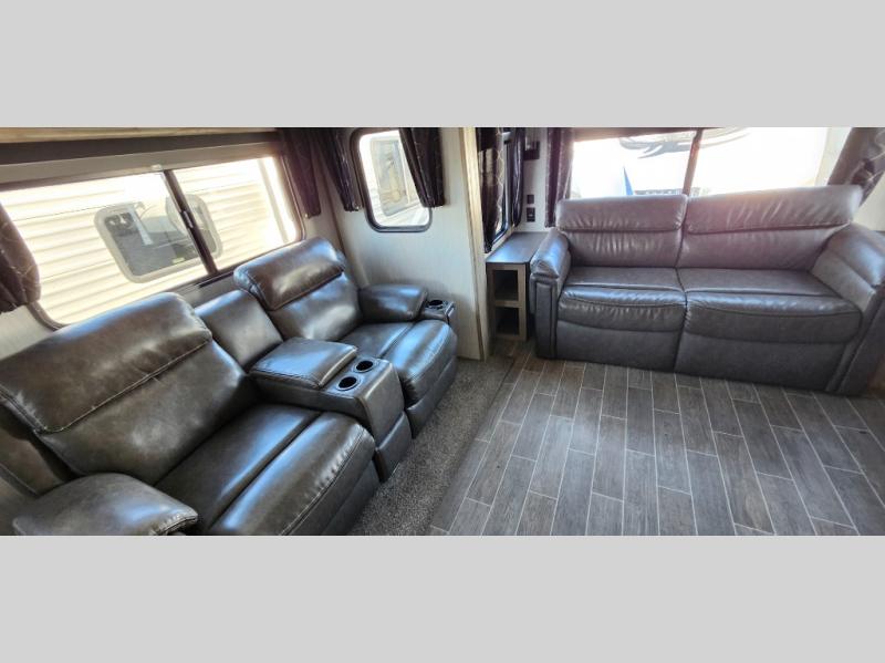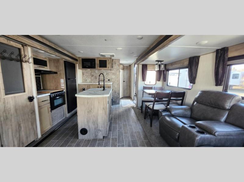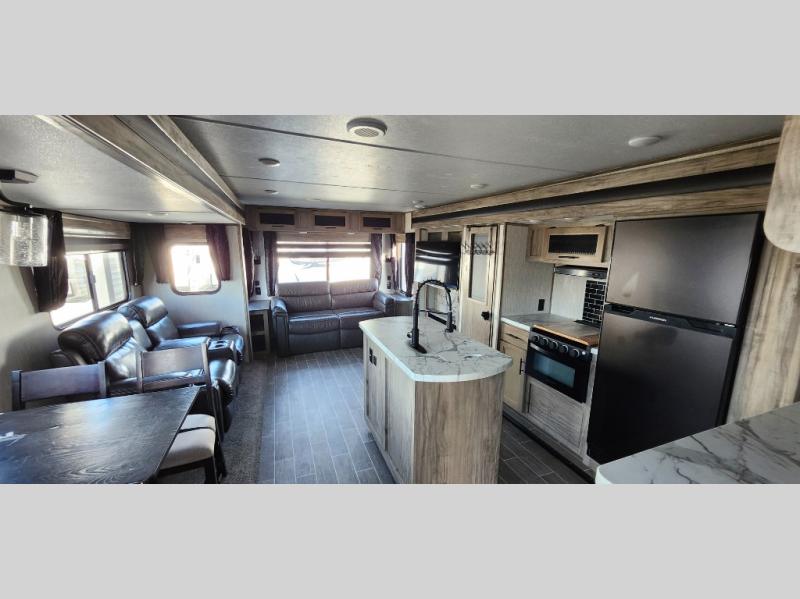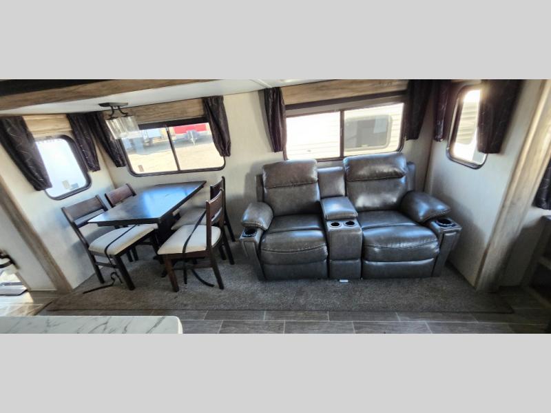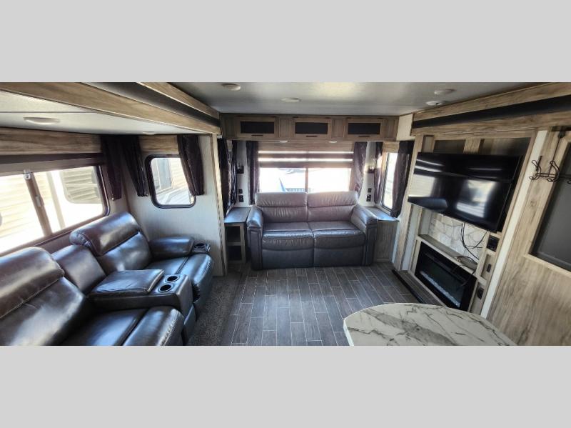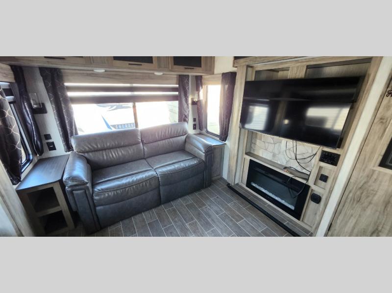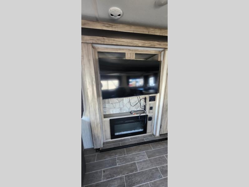 This trailer has it all for maximum comfort and convenience as well as entertainment! The rear living area includes a tri-fold sofa with a rear Pano-Vision window for great views of your campsite, and dual opposing slides widen this area so you can visit with friends. You'll also find theater seating, plus a free-standing table with two chairs and a storage ottoman seat. Enjoy the fireplace on a cool night or when you want a little ambiance while seated inside. Two patio awnings will provide an outdoor living area; just grab your camping chairs from the full pass-through storage. When you want to call it a night, fall quickly to sleep on the queen bed in the front bedroom with easy access to a dual entry bathroom!