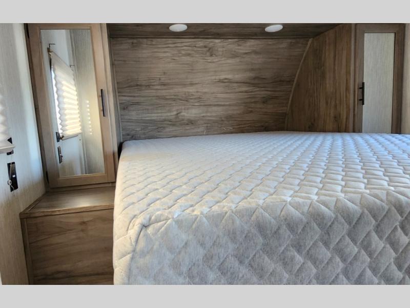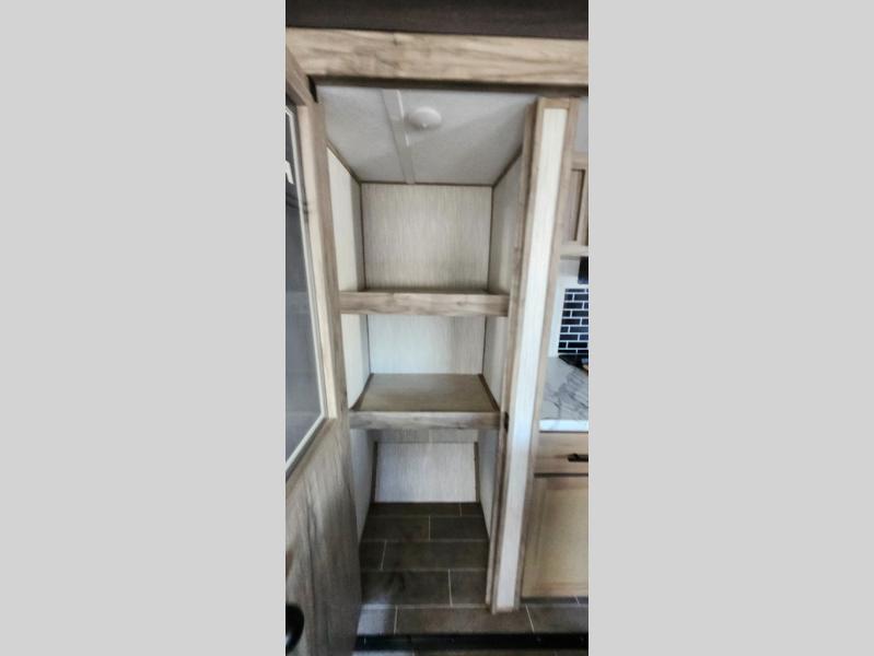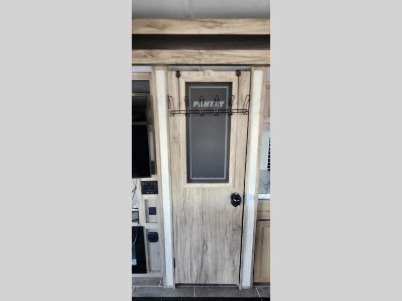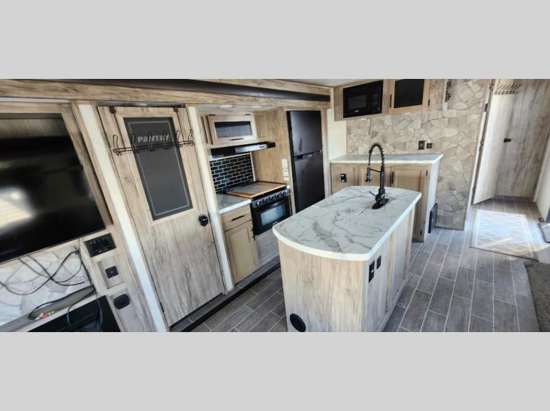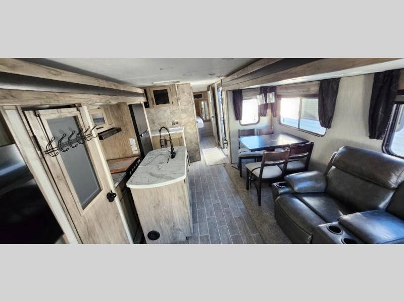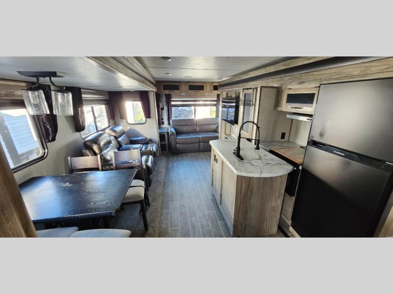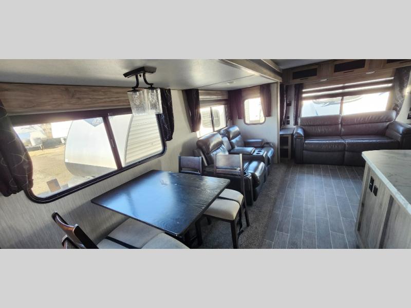 This trailer has it all for maximum comfort and convenience as well as entertainment! The rear living area includes a tri-fold sofa with a rear Pano-Vision window for great views of your campsite, and dual opposing slides widen this area so you can visit with friends. You'll also find theater seating, plus a free-standing table with two chairs and a storage ottoman seat. Enjoy the fireplace on a cool night or when you want a little ambiance while seated inside. Two patio awnings will provide an outdoor living area; just grab your camping chairs from the full pass-through storage. When you want to call it a night, fall quickly to sleep on the queen bed in the front bedroom with easy access to a dual entry bathroom!