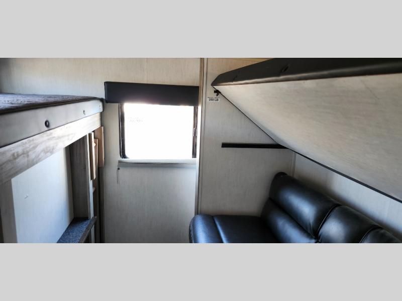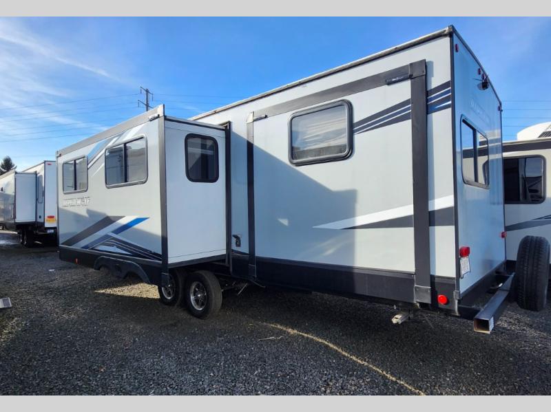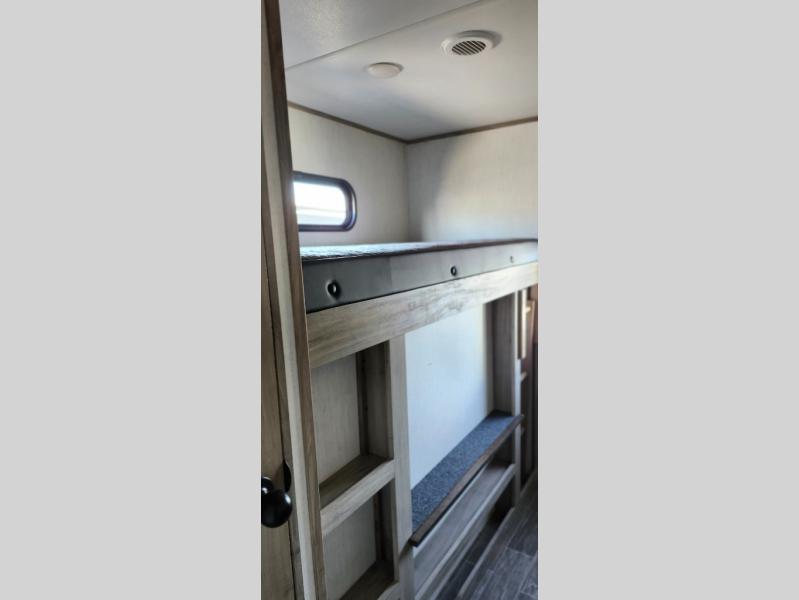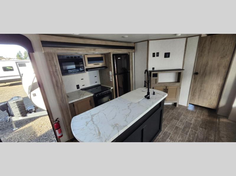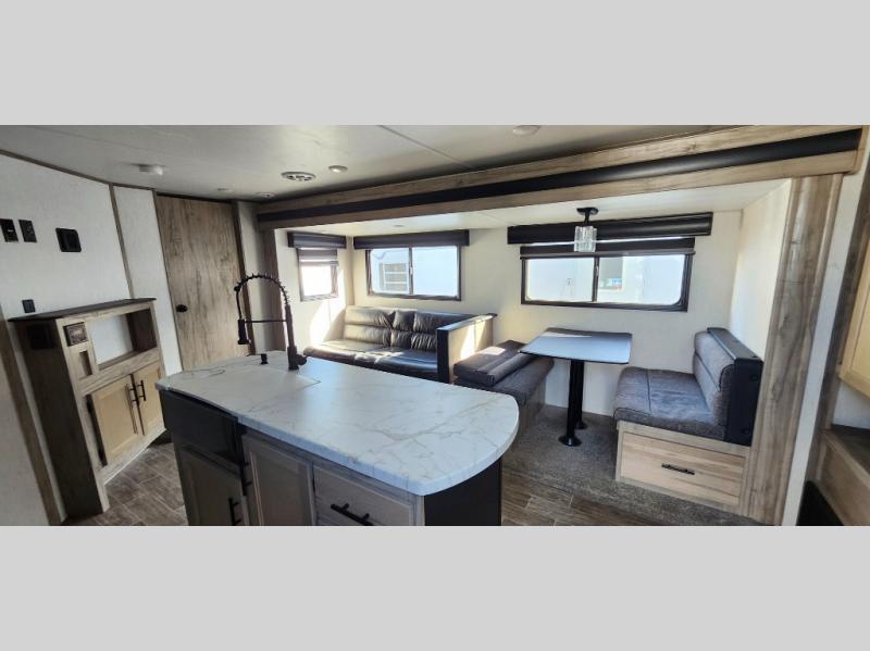 Load up your clothes, food, and outdoor gear to enjoy a long weekend away from the city in this travel trailer! There are triple slide outs, a private bunkhouse with a half bathroom with a second exterior entry/door for convenience, plus an outside kitchen! The bunkhouse also has two bunks, a jackknife sofa and a trundle bed, plus a slide out for more interior floor space. The main living and kitchen area is spacious as well with two opposing slides, a kitchen island with a large sink, a pantry, plus a cozy fireplace. The full walk-through bathroom allows double access, and the front bedroom allows you to sleep like royalty.
