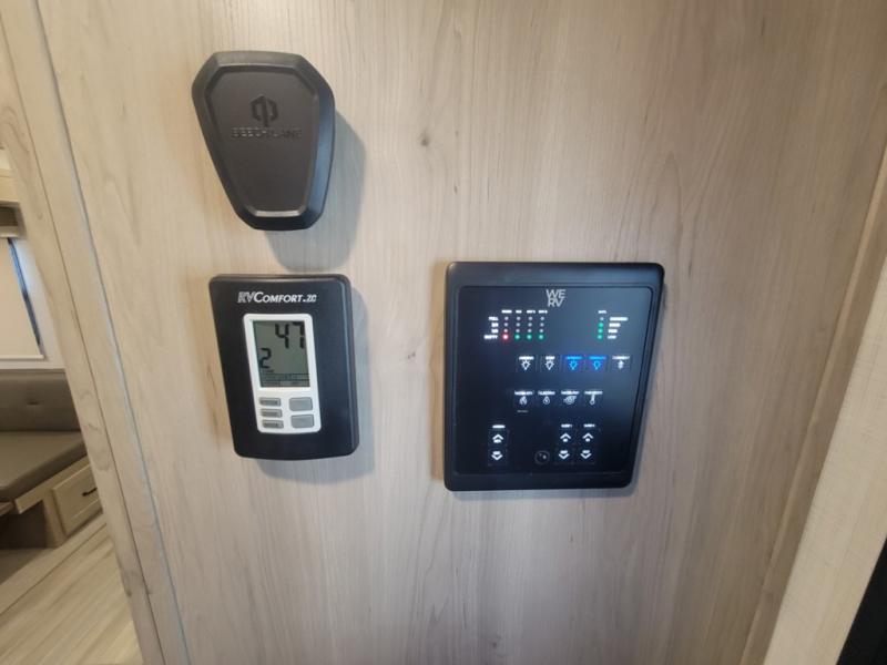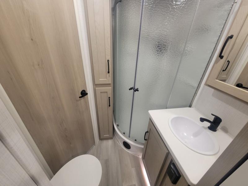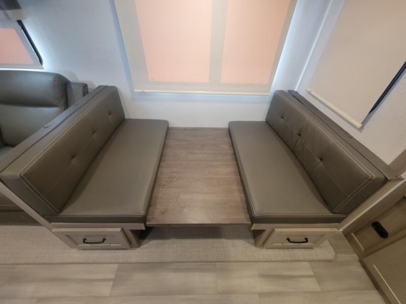This is the perfect couples trailer with a spacious living and kitchen area and a rear bedroom which includes the second exterior entry/exit door! The bedroom also provides a slide out queen bed, a wardrobe and an optional TV, plus windows for great views and access to the double entry bathroom. The front kitchen gives the cook counter space and cabinetry for dishes and such, plus all the appliances needed to make warm meals and store leftovers. You can dine at the booth dinette, relax on the 67" theater seating and watch the Smart TV while enjoying the fireplace.