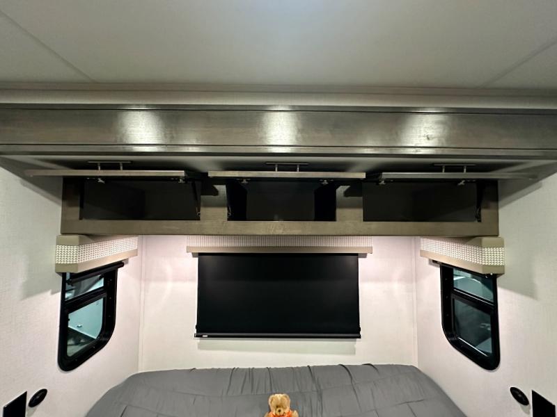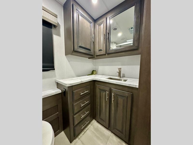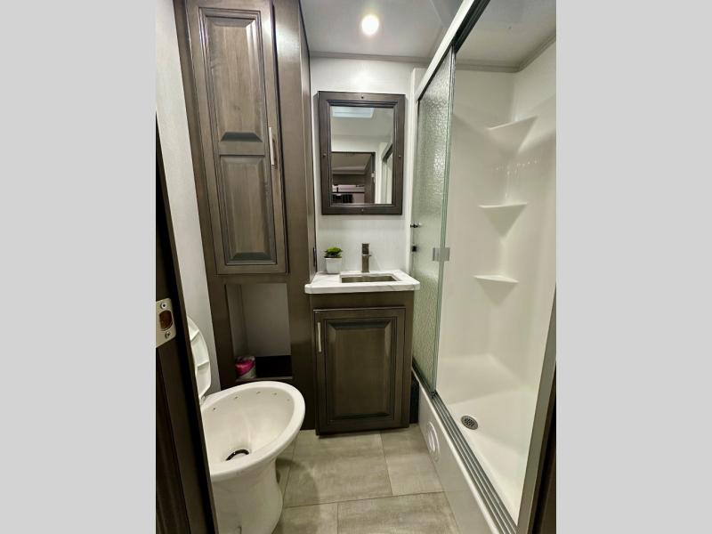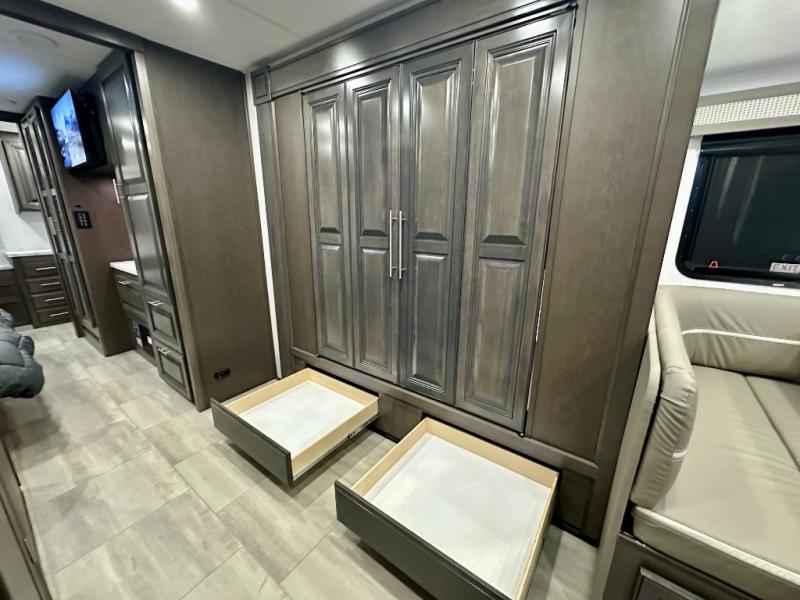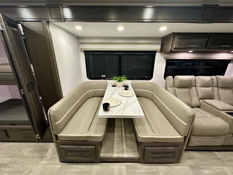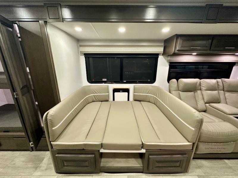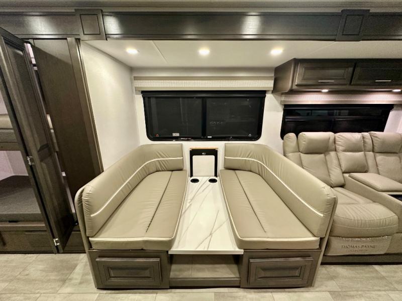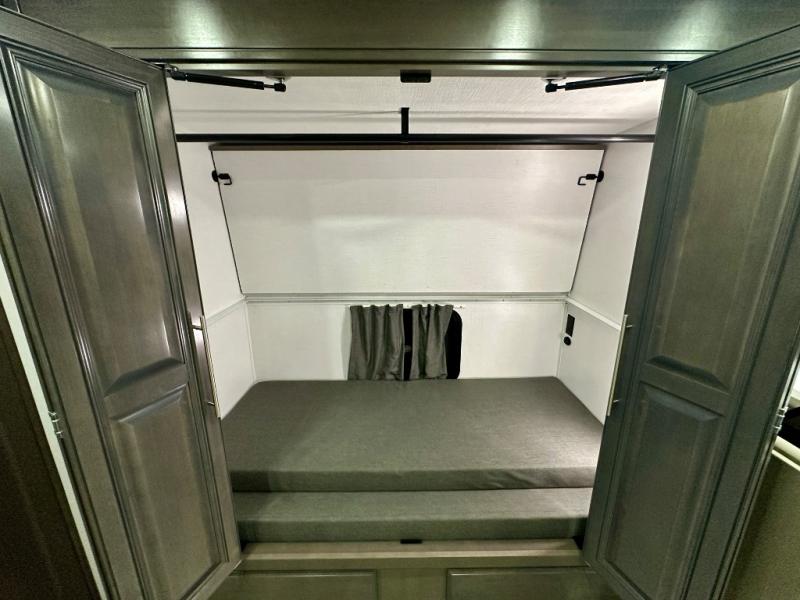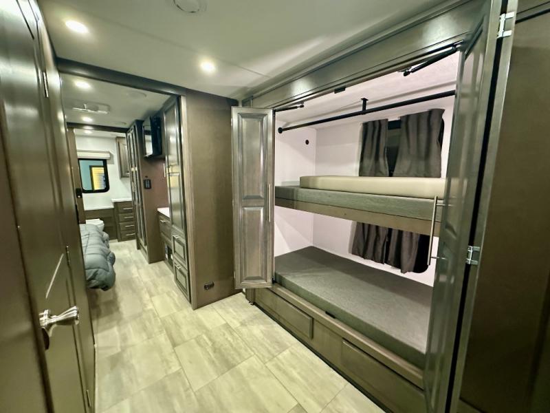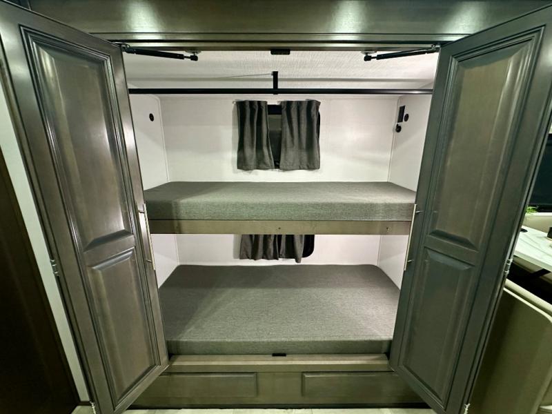 You won't have to search far for comfort in this spacious coach for seven to eight! The little ones will love having bunk beds to sleep on, plus there is a full bath right across the hall for convenience. The master bedroom with a king bed slide out will have you feeling right at home, and the second full bath includes ample counter space to set out your necessities. Everyone can meet in the main living area to relax on the hide-a-bed sofa, or you can choose the optional power theater seats if you don't need more sleeping space. You will surely never get bored with a 40" LED TV in the living room, 32" LED TV in the bedroom, plus a 40" LED TV outdoors with a radio and exterior speakers!
