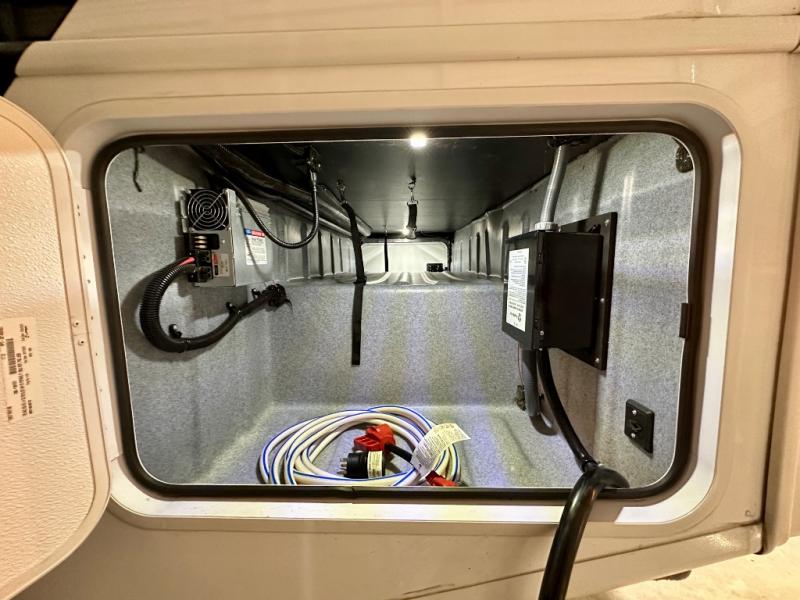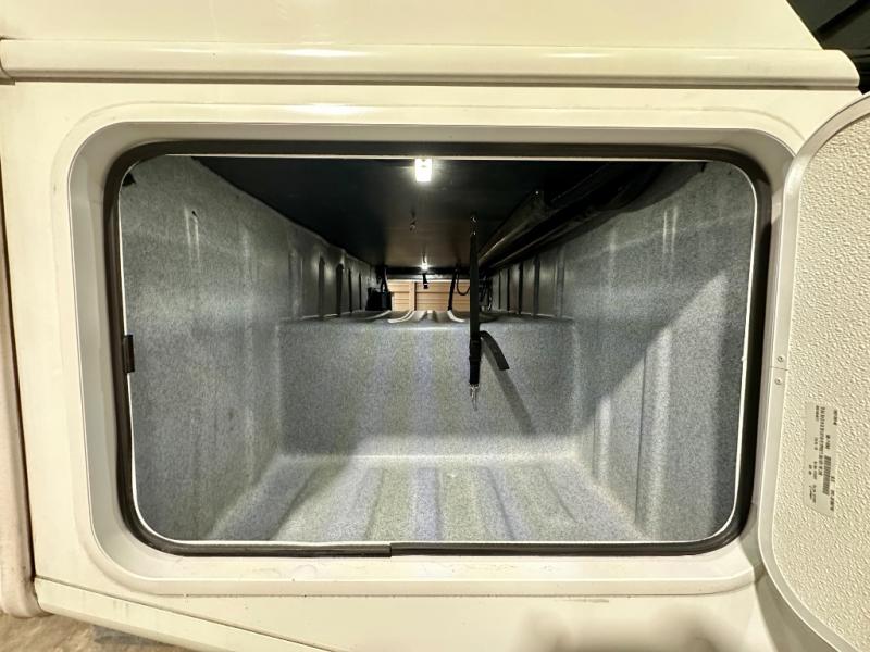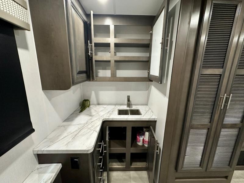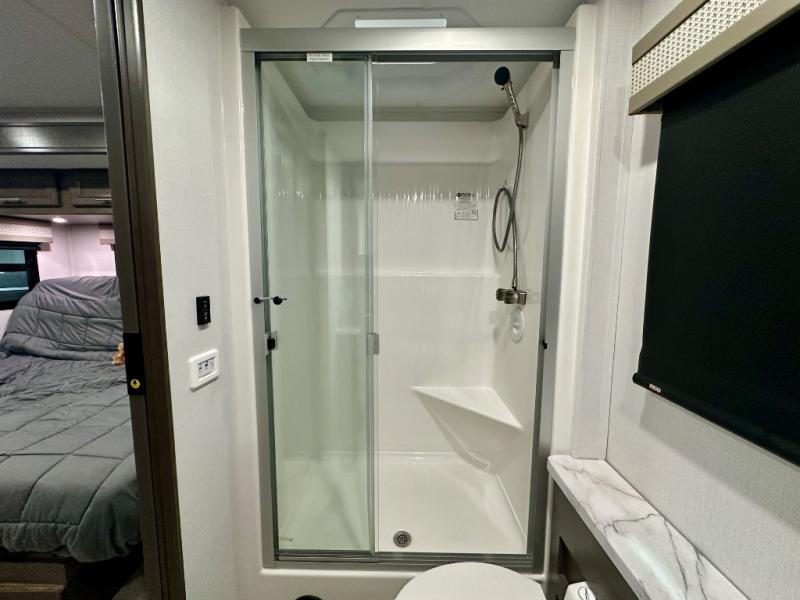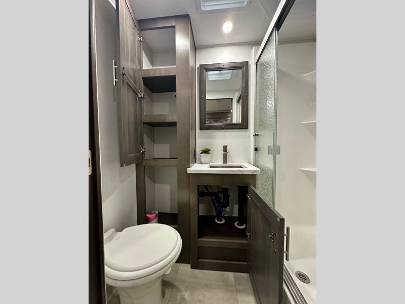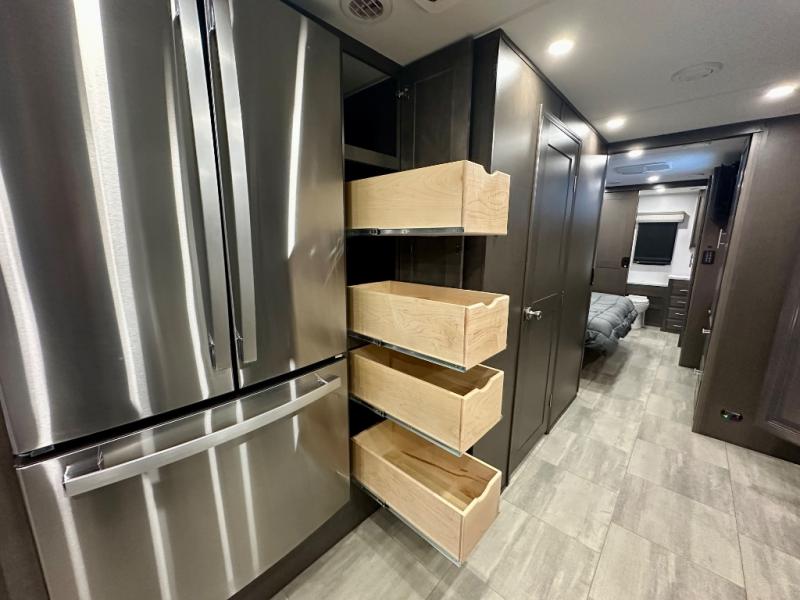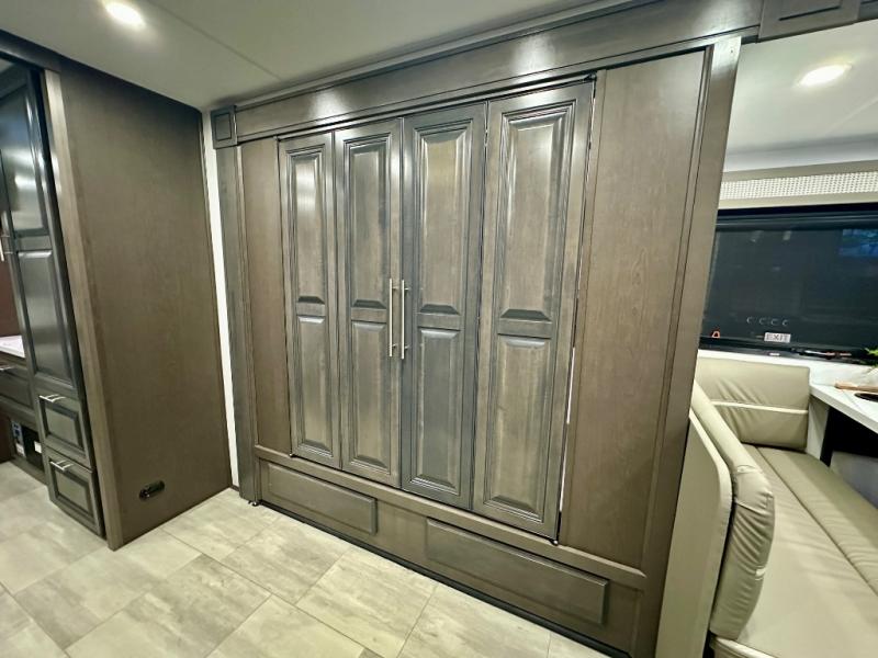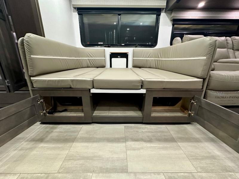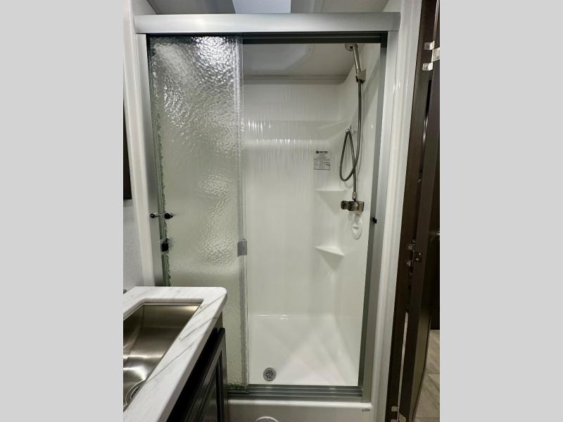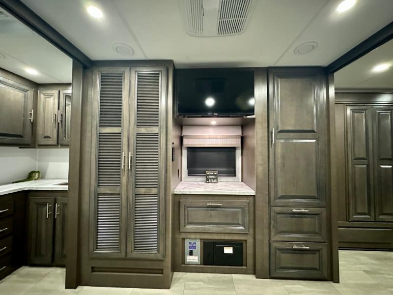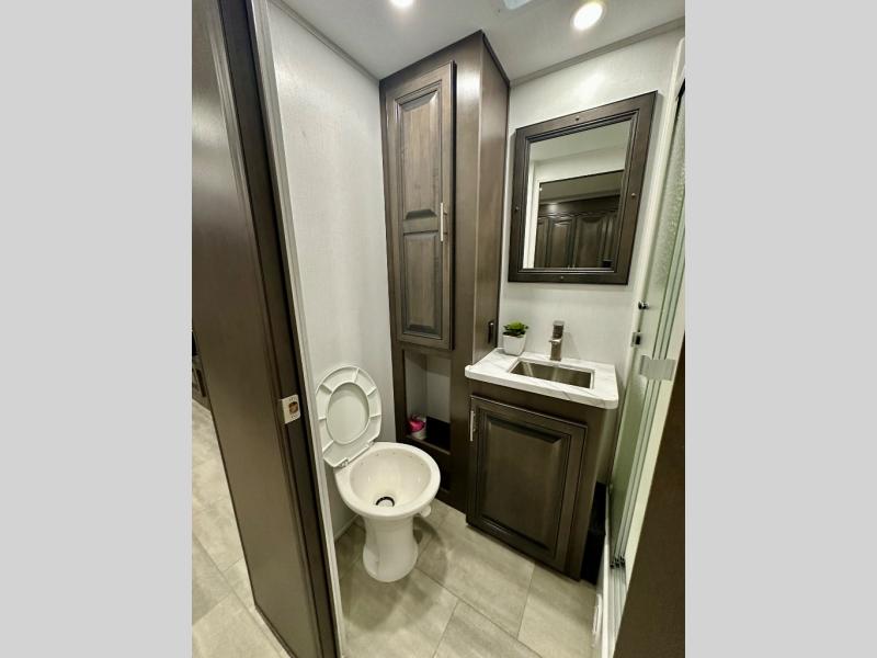 You won't have to search far for comfort in this spacious coach for seven to eight! The little ones will love having bunk beds to sleep on, plus there is a full bath right across the hall for convenience. The master bedroom with a king bed slide out will have you feeling right at home, and the second full bath includes ample counter space to set out your necessities. Everyone can meet in the main living area to relax on the hide-a-bed sofa, or you can choose the optional power theater seats if you don't need more sleeping space. You will surely never get bored with a 40" LED TV in the living room, 32" LED TV in the bedroom, plus a 40" LED TV outdoors with a radio and exterior speakers!