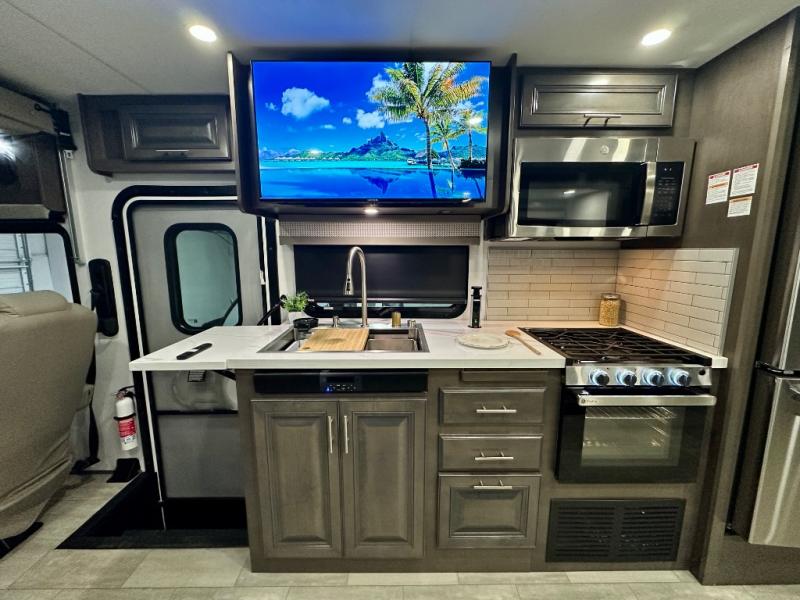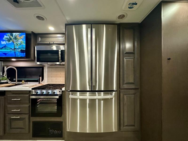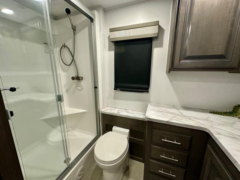 A spacious design and true luxury come together to create these Forest River Georgetown 5 Series Class A gas motorhomes! Their solid surface kitchen countertops, day and night shades throughout, and designer bedspread will have you feeling right at home. The color side and rear cameras help to prevent any dings or bumps while you travel, and the automatic hydraulic leveling jacks will keep your unit leveled where ever you set up. Durable construction consists of a crowned roof, 2" aluminum framed vacuum bonded gel coated sidewalls, plus high density block foam insulation that will allow you to travel in all seasons. You will appreciate the 50 Amp service, two house batteries, and 6,000 watt Yamaha generator to keep you powered up. An outside shower is also included on all models, along with rotocast storage compartments with drains, a power awning, and so much more!