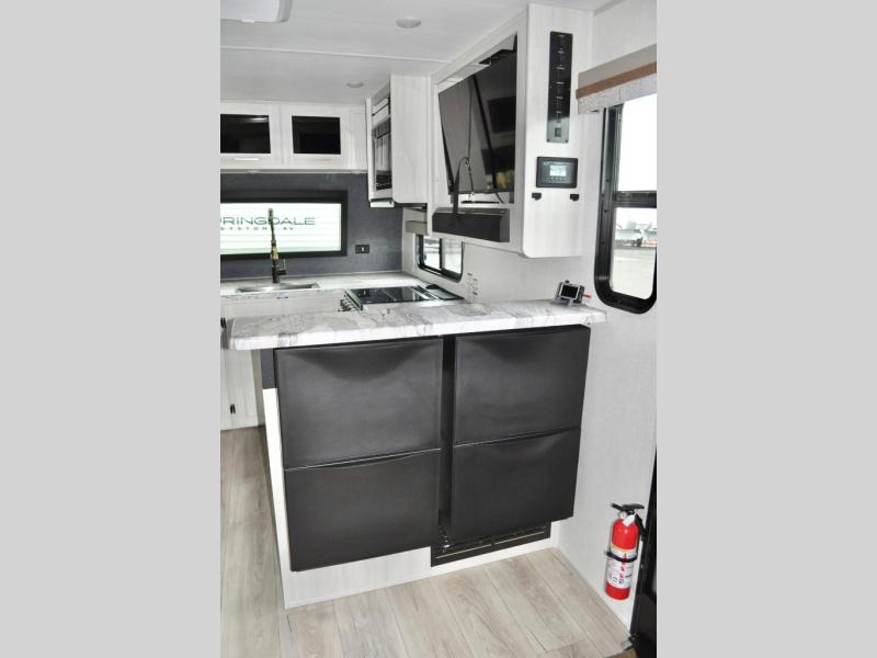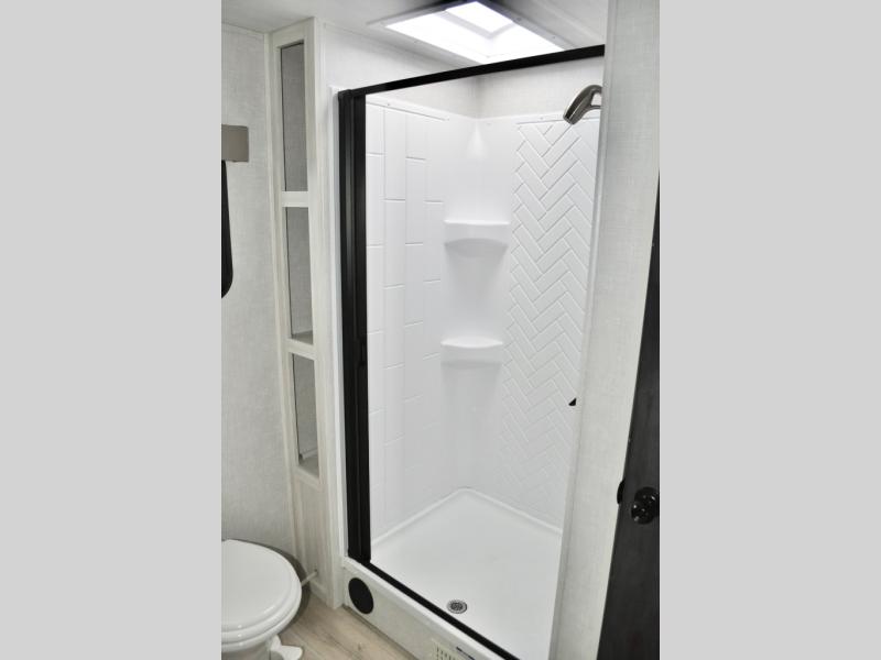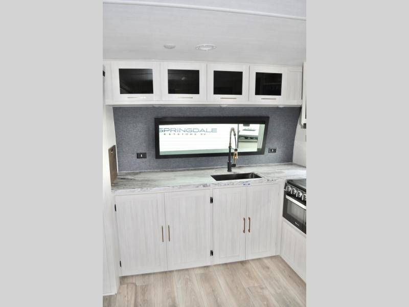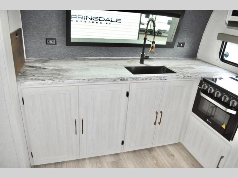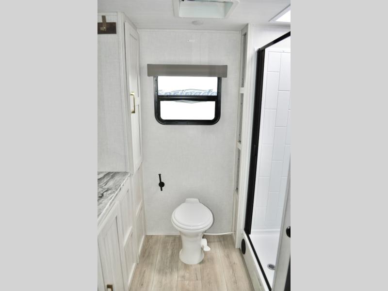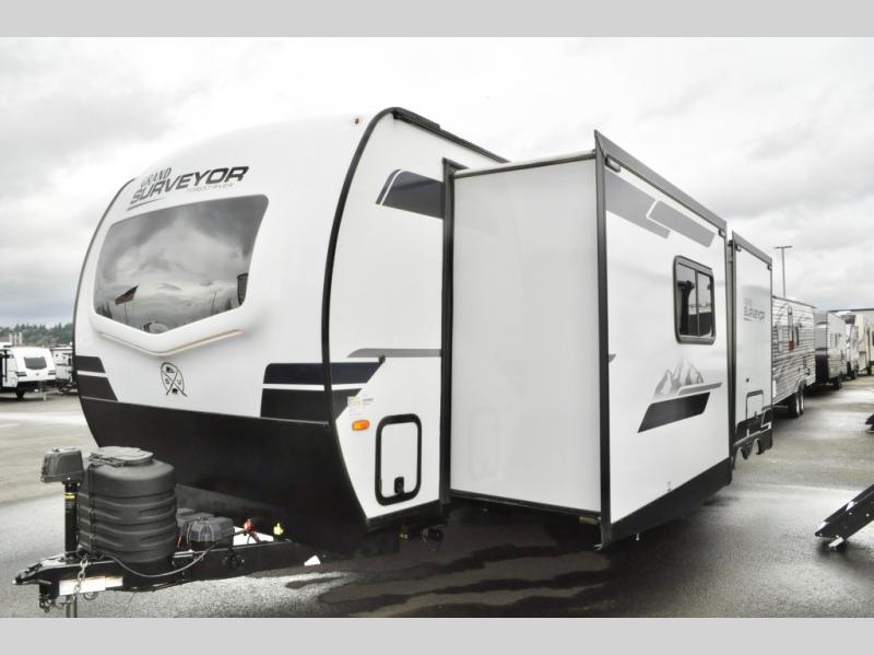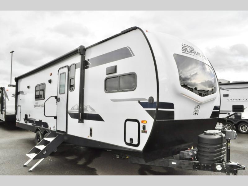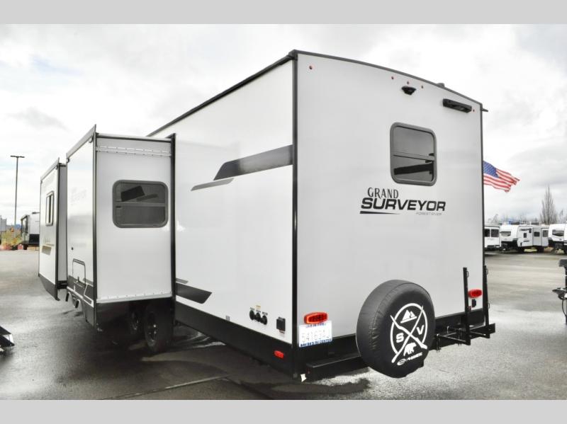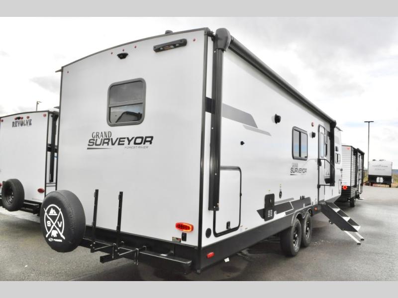 With any Grand Surveyor travel trailer by Forest River you will enjoy turn-key ready-to-go features and quality construction! Each model includes Azdel composite walls and a gel coated fiberglass front cap with an automotive style tinted windshield for a sleek look. There are friction hinge black glass entry door(s), an adjustable platform step with a night light, plus Goodyear tires and a power tongue jack for easy towing. The interior will have you feeling right at home with roller shades, residential faucets, sinks, and bathroom vanity, plus Surf(x) seamless countertops throughout. You can also plan for adventure with a 2" rear accessory and exterior spray port, and there are slam latch exterior baggage doors throughout to keep all your gear secure. Other stand-out features include a central vacuum system, a 200 watt solar panel with a 30 amp controller, a tankless water heater, carpet-free interiors, and the list goes on!