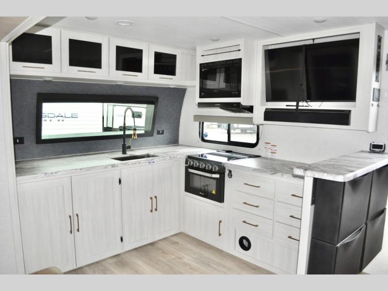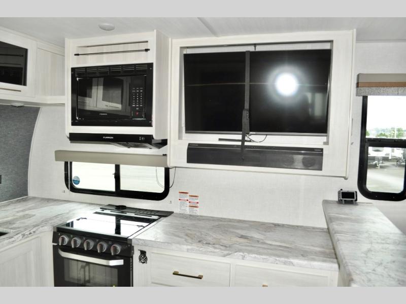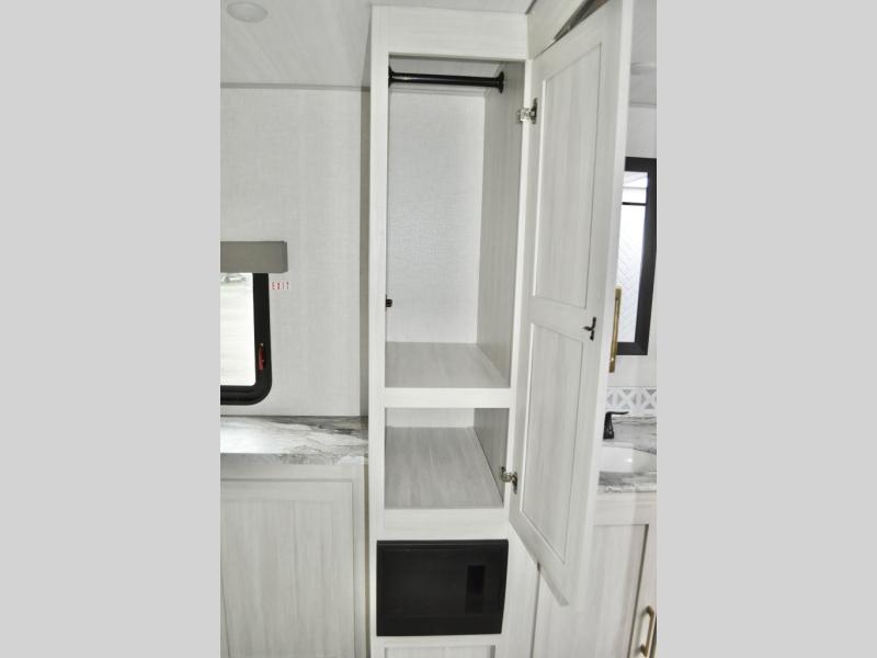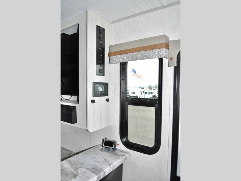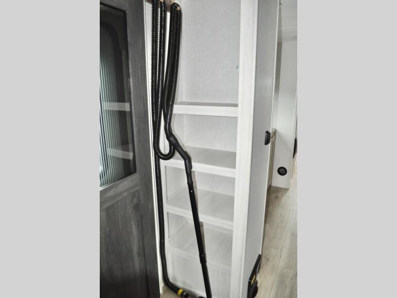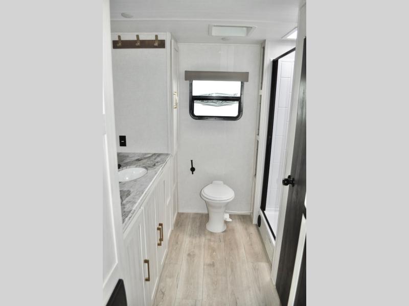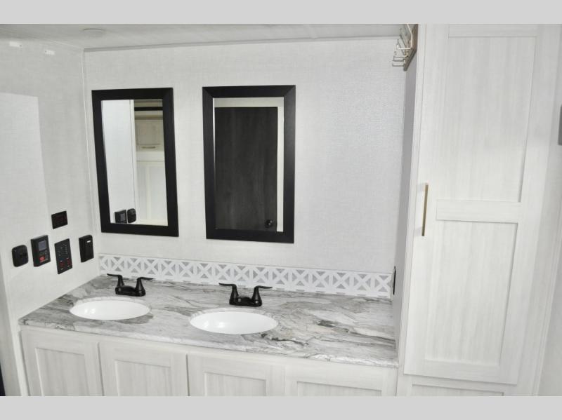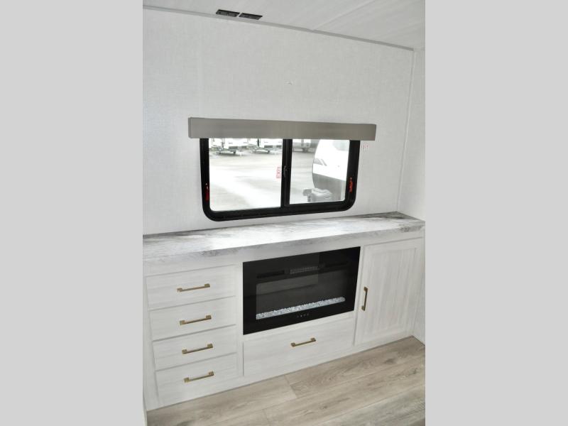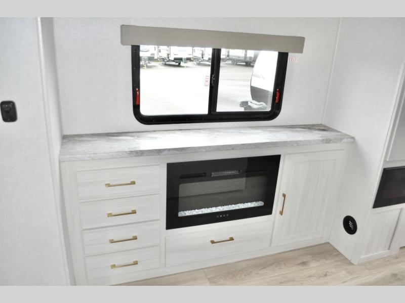 This couple's trailer will be giving you all the glamping vibes! There is a front kitchen with ample counter space, along with a counter with two bar stools, a central vacuum to easily clean up, and a slide out for more space! The second slide out is found in the middle master bedroom where you'll also enjoy a custom king bed across from a bedroom fireplace, a wardrobe, and a dresser with TV prep. Head towards the back and you'll be wowed by the full bath with dual bath sinks, an upgraded slow-close shower door, and a closet with washer and dryer prep. The exterior is just as impressive as the interior with its outside kitchen, 20' power awning with LED lights, slam-latch cargo doors, TV coax, and so much more!