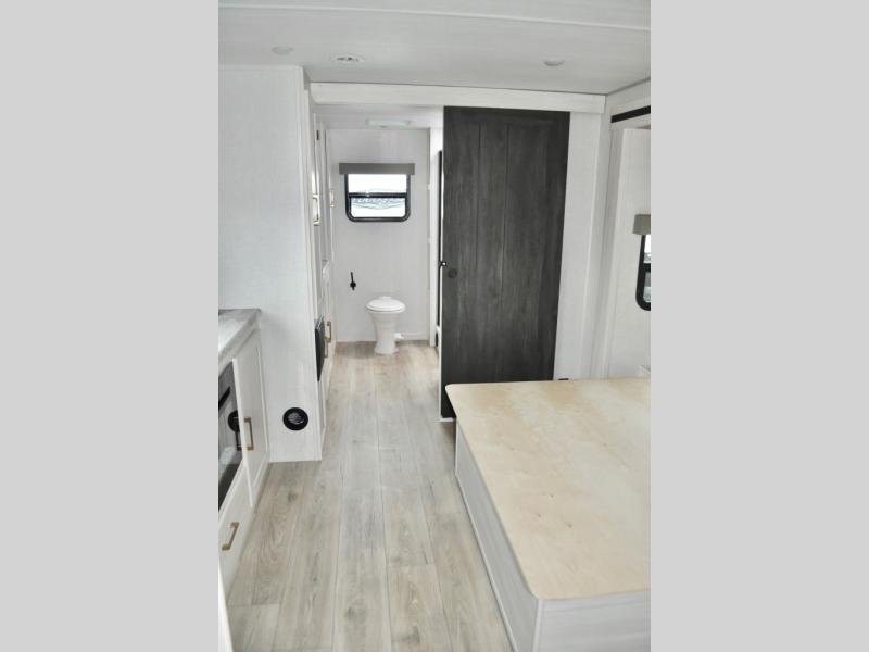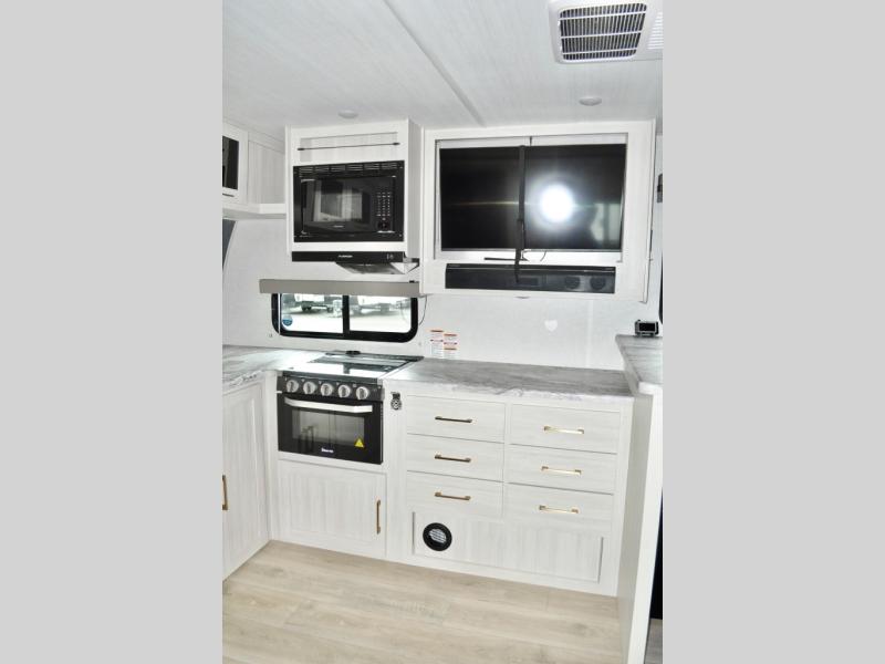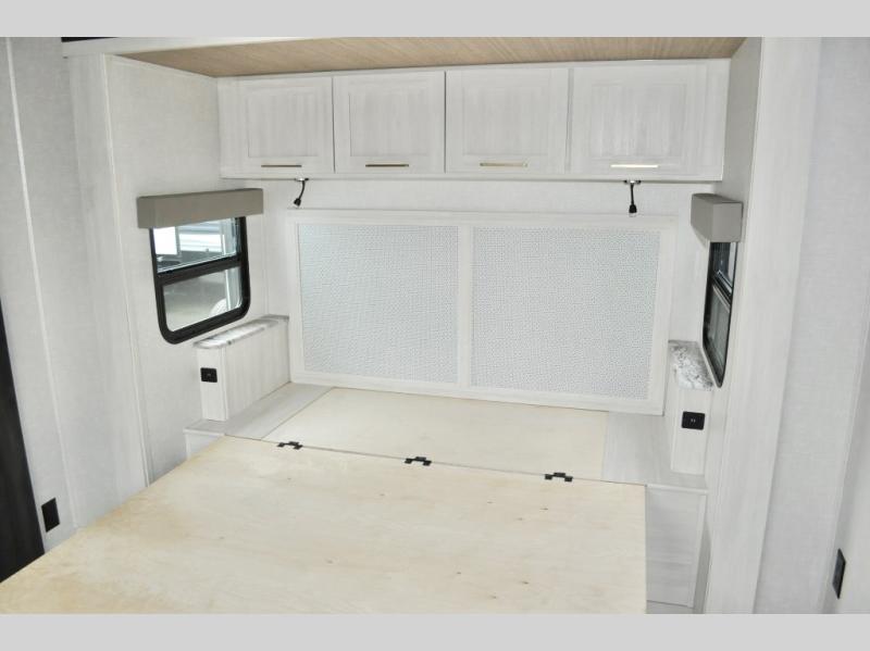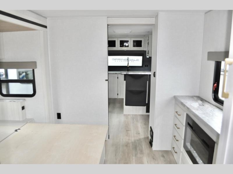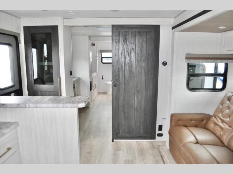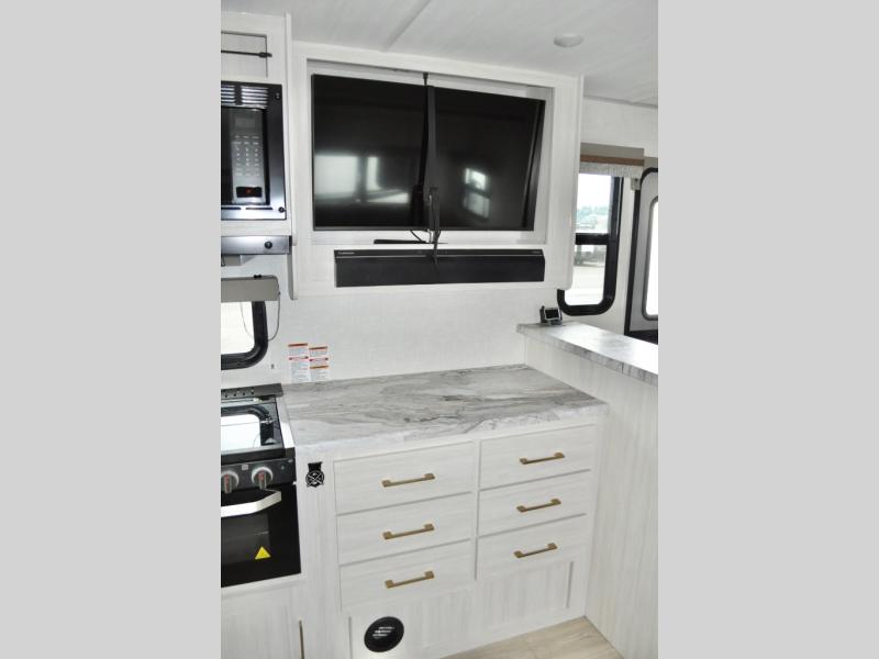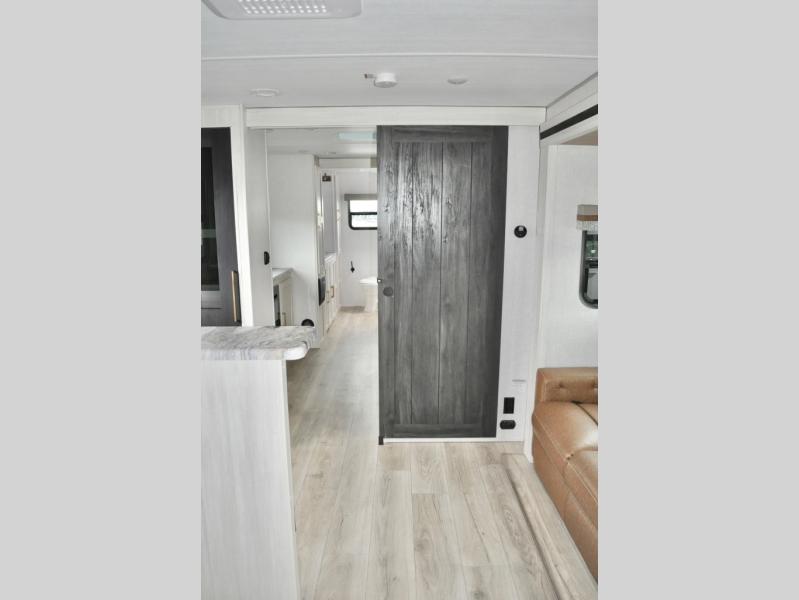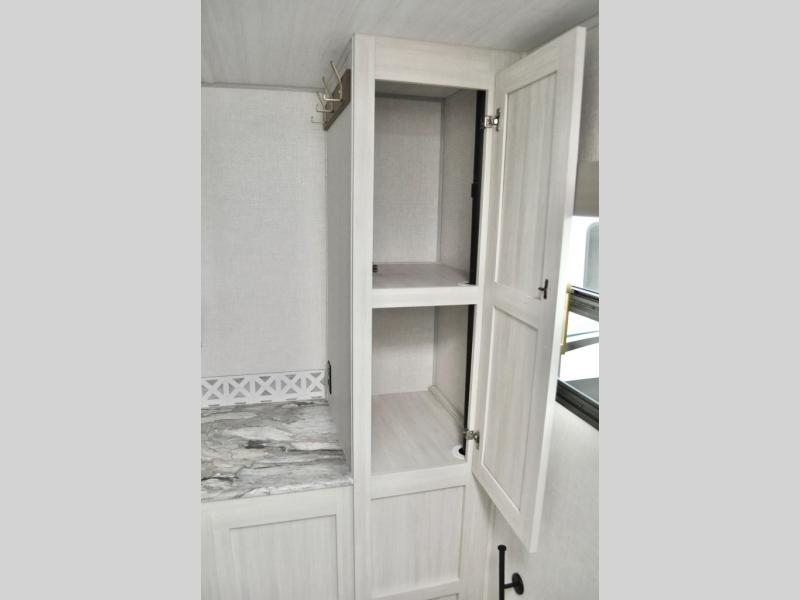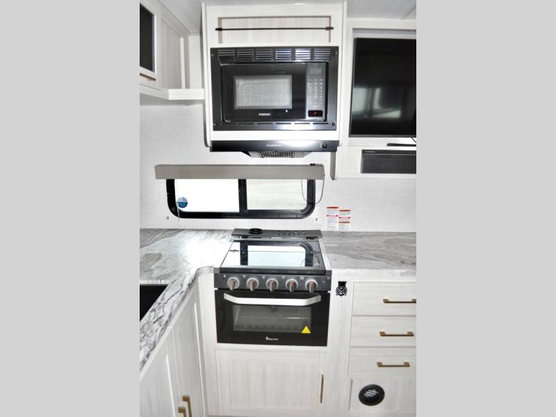 This couple's trailer will be giving you all the glamping vibes! There is a front kitchen with ample counter space, along with a counter with two bar stools, a central vacuum to easily clean up, and a slide out for more space! The second slide out is found in the middle master bedroom where you'll also enjoy a custom king bed across from a bedroom fireplace, a wardrobe, and a dresser with TV prep. Head towards the back and you'll be wowed by the full bath with dual bath sinks, an upgraded slow-close shower door, and a closet with washer and dryer prep. The exterior is just as impressive as the interior with its outside kitchen, 20' power awning with LED lights, slam-latch cargo doors, TV coax, and so much more!