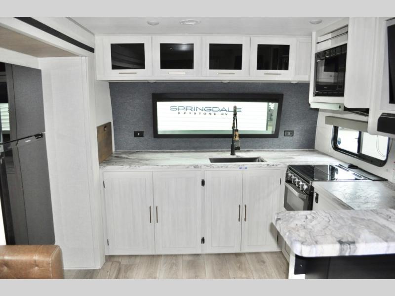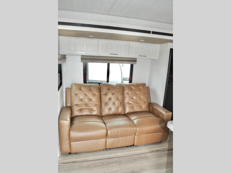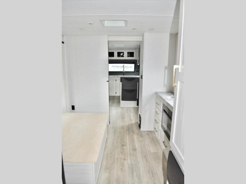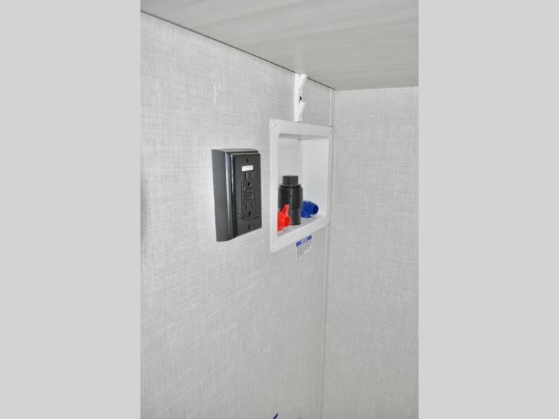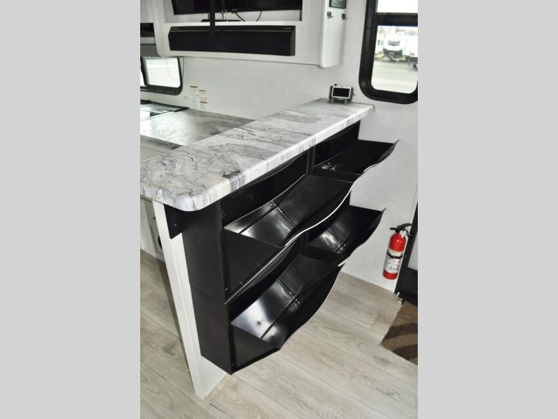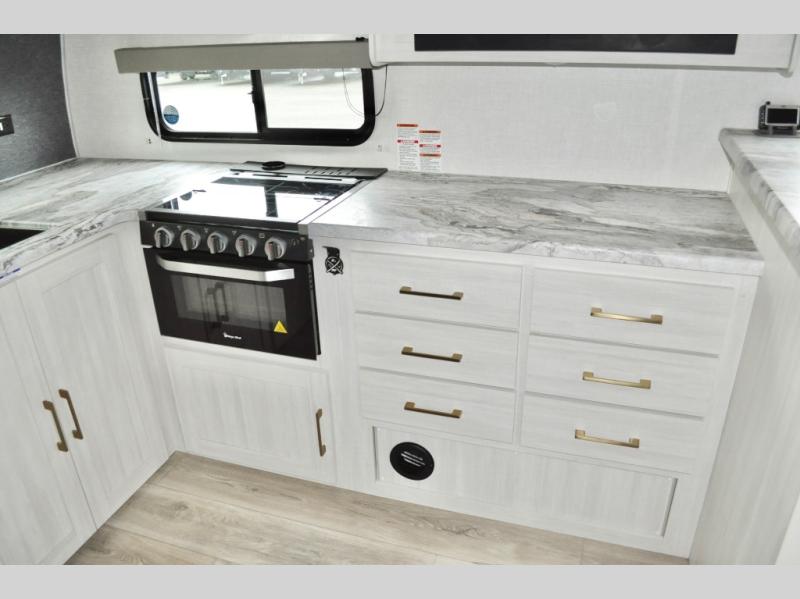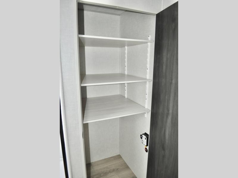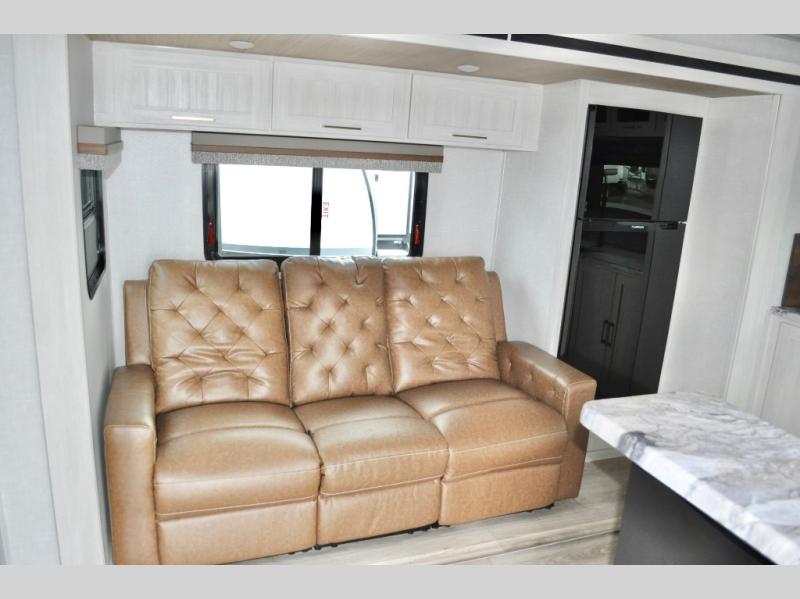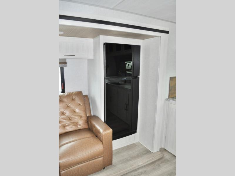 This couple's trailer will be giving you all the glamping vibes! There is a front kitchen with ample counter space, along with a counter with two bar stools, a central vacuum to easily clean up, and a slide out for more space! The second slide out is found in the middle master bedroom where you'll also enjoy a custom king bed across from a bedroom fireplace, a wardrobe, and a dresser with TV prep. Head towards the back and you'll be wowed by the full bath with dual bath sinks, an upgraded slow-close shower door, and a closet with washer and dryer prep. The exterior is just as impressive as the interior with its outside kitchen, 20' power awning with LED lights, slam-latch cargo doors, TV coax, and so much more!