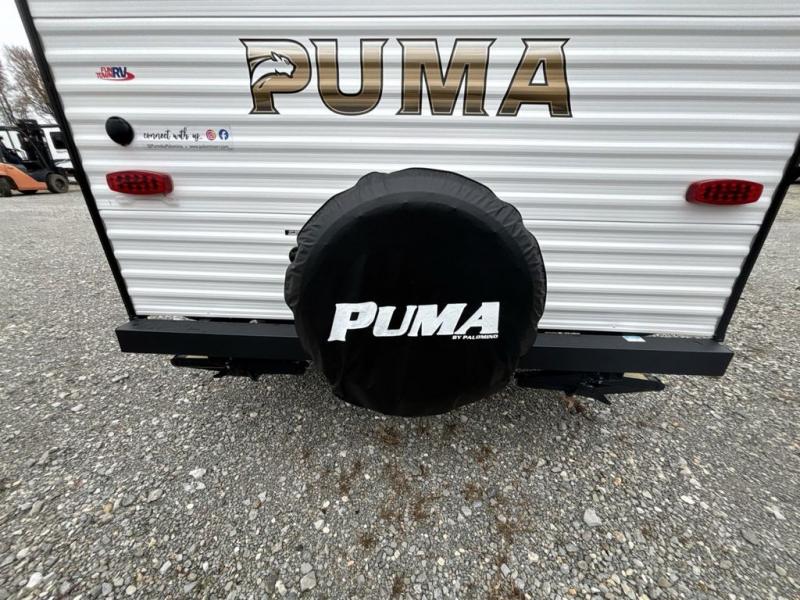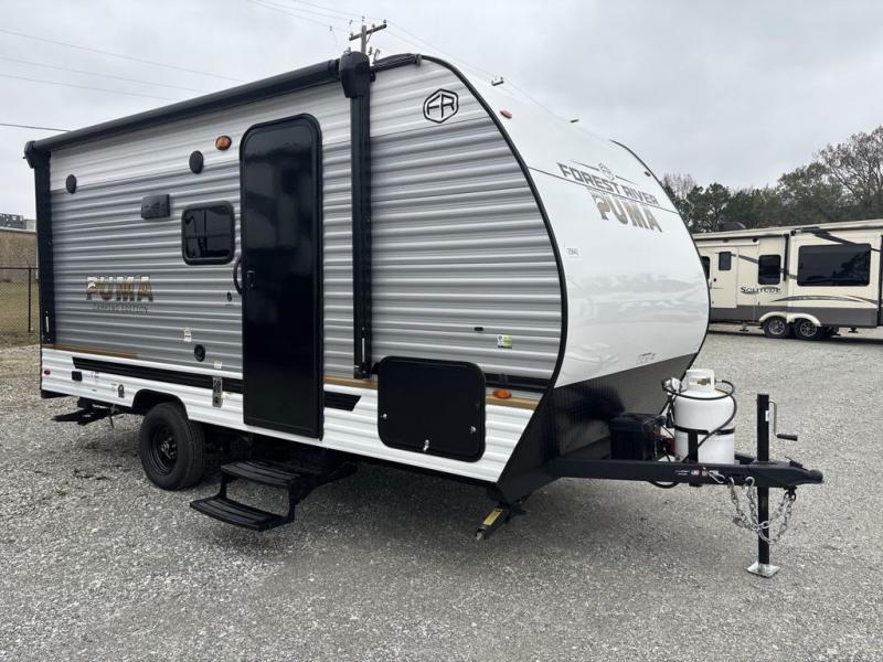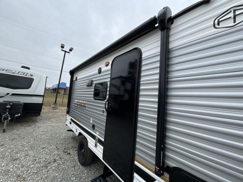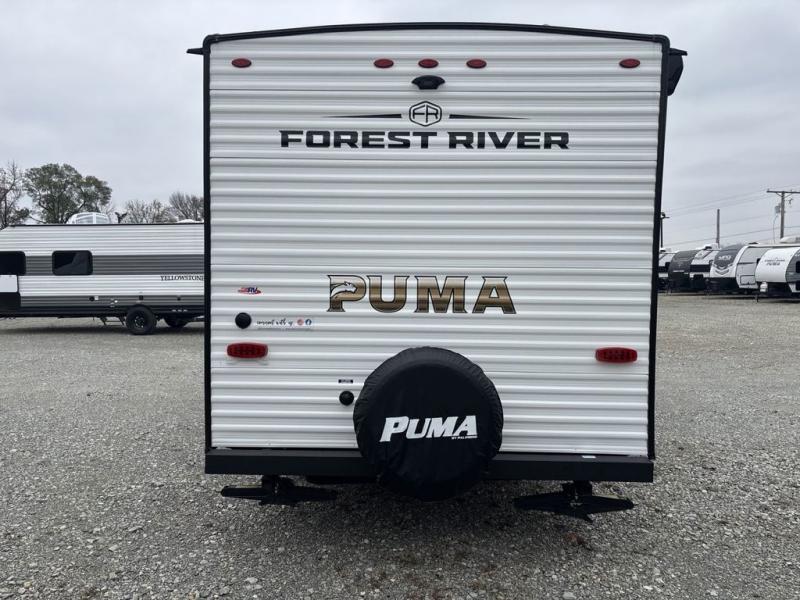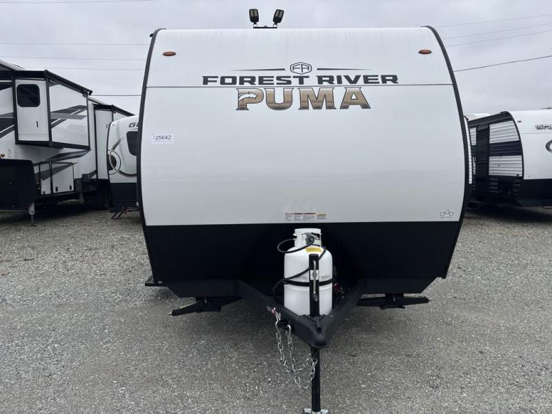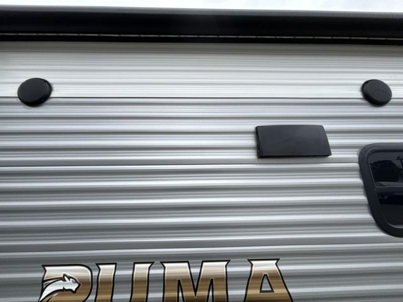 The Puma Camping Edition by Forest River offer an affordable travel trailer for rookie campers or seasoned RVers! They are built with 5/8" tongue and groove plywood flooring and a front diamond plate for added protection. There are also exterior magnetic baggage door latches, back up camera prep, a battery disconnect. Head inside to find Thermofoil countertops with a smooth drop edge, bedroom USB ports and outlets, and pleated shades in the living room.