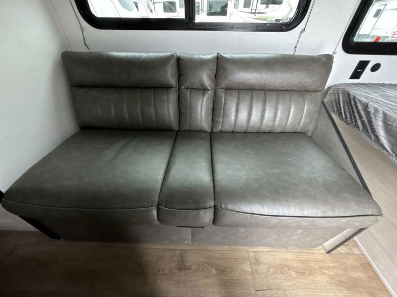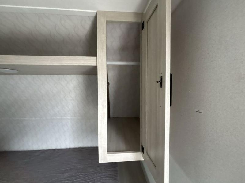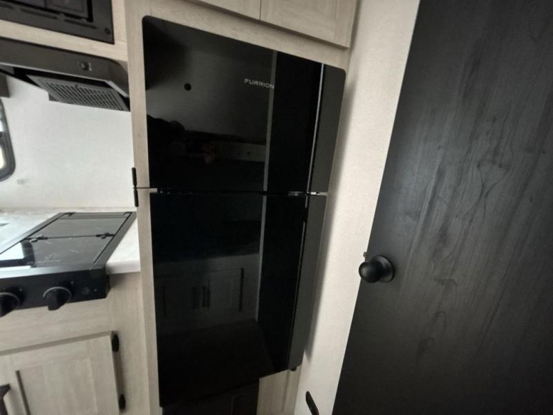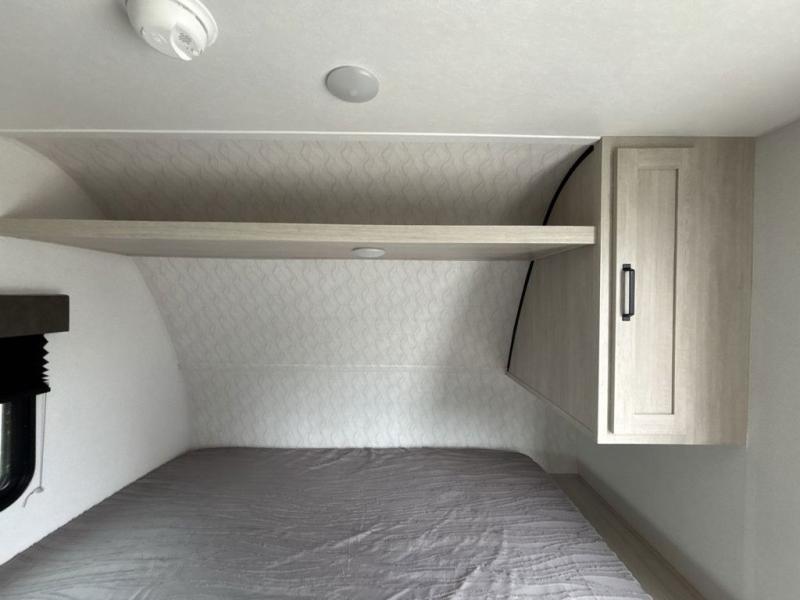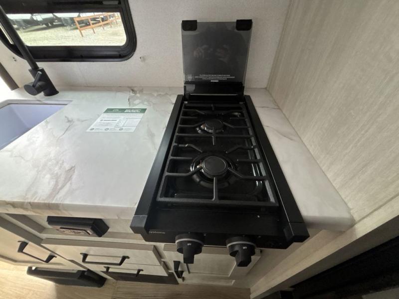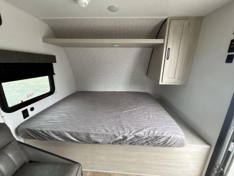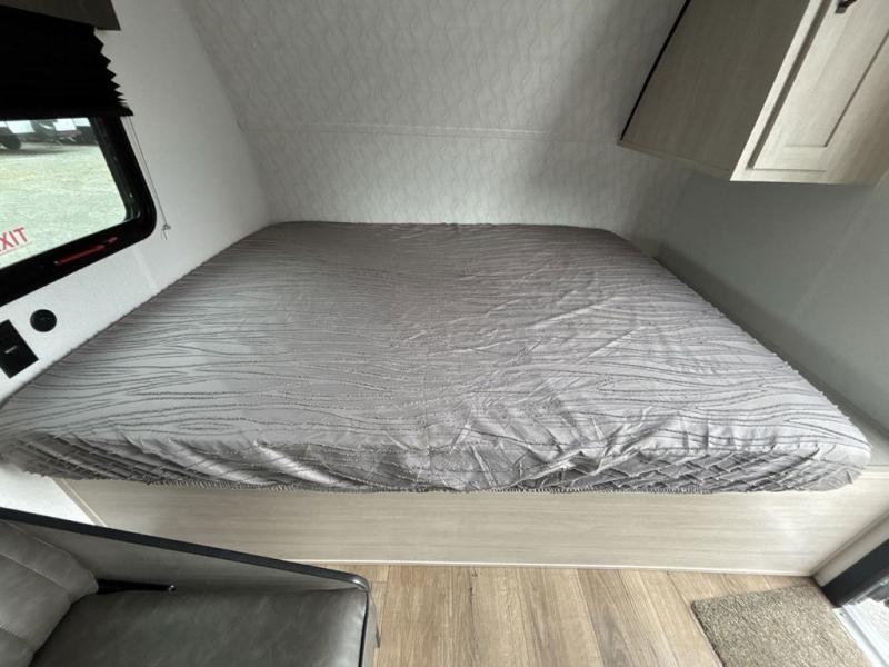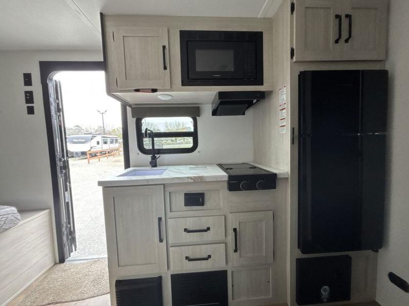 It will be so easy to enjoy camping trips in this single axle travel trailer! There is a front RV queen bed with flip-up storage at the foot of the bed for your belongings, and any additional guests can sleep on the bunk beds and sofa. A full kitchen includes a two-burner cooktop and microwave to cook meals each day, and the 12V black glass refrigerator will keep your food fresh. And a private bath with a toilet and shower will let you freshen up without having to use the camp's facilities!