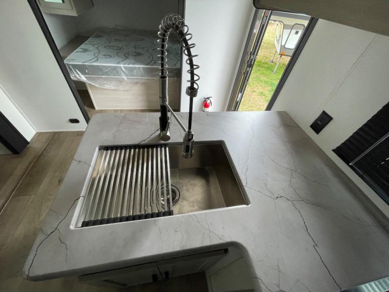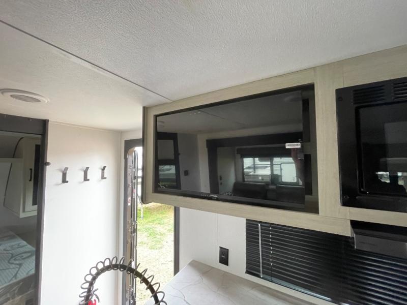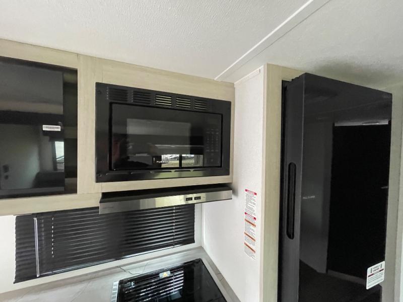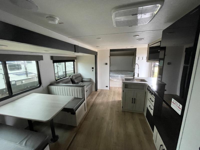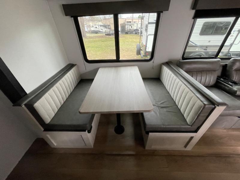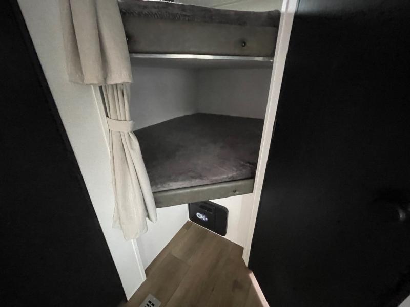 If you're looking for more space, this double axle unit features a large slide so you can walk about freely. Here, you'll find the booth dinette and sofa, which sit across from the optional TV if you want to enjoy movie nights. The full kitchen includes a microwave and three burner cooktop to make meals, plus a pantry and 12V refrigerator for food storage. There is even washer and dryer prep in the pantry if you choose to add these appliances. An optional outside mini kitchen can be added if you enjoy cooking outdoors! The kids or your guests will love the double-size bunks, and the full bath right beside the bunks includes a shower a seat for added comfort.