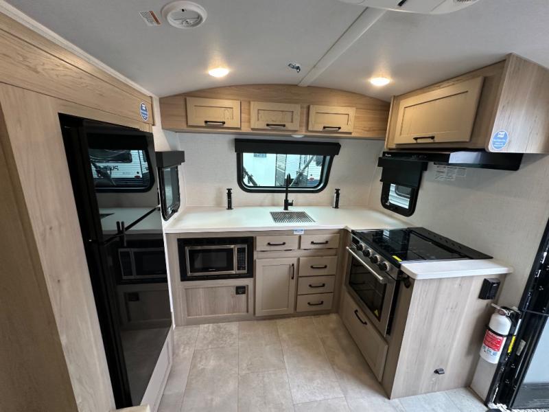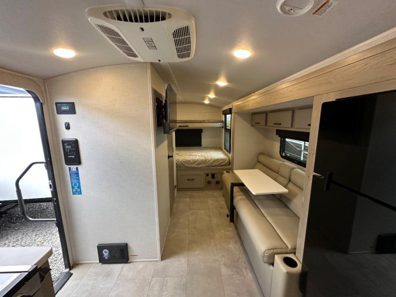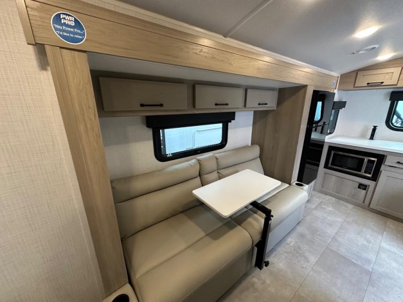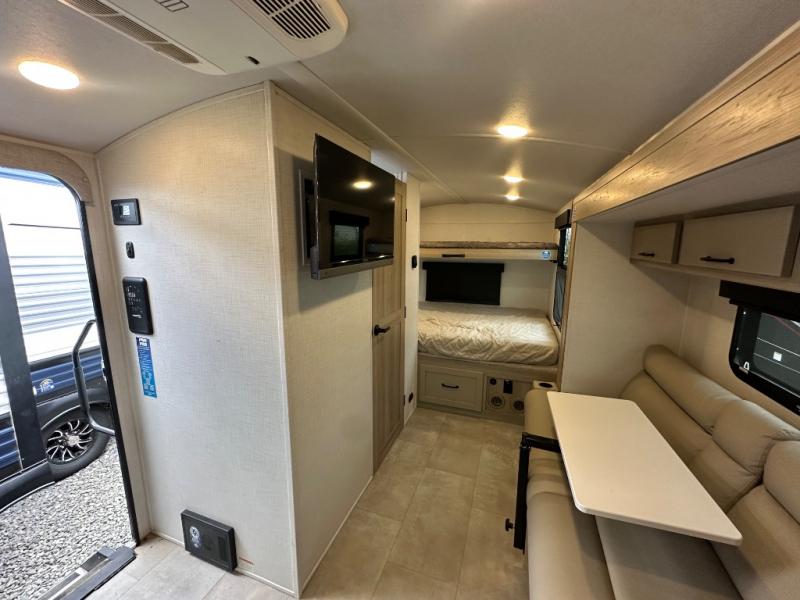 Are you looking for a lightweight trailer with at-home comforts? Take a look at this single slide out unit that can sleep three to four each night. There is a queen-size bed in the back with a 26" x 80" flip-up bunk for cozy sleeping space, a 72" sofa with cupholders to relax on, plus a 12V TV for movie nights! The front kitchen includes a 12V refrigerator to store food, plus a microwave oven and a gas oven to cook meals each day.