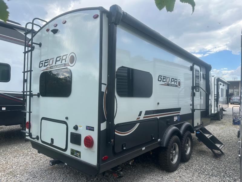 With any Rockwood GEO Pro travel trailer by Forest River you will enjoy easy towing, durable construction, and off-road capabilities with larger laminated roof! Each model is constructed with complete composite wall construction for added strength and durability, and Dexter® axles that will make towing easier than ever. Inside, you'll find sleek back up camera prep for added security, a refrigerator and a microwave, plus many other interior amenities that will make you feel at home on the road.