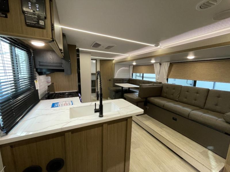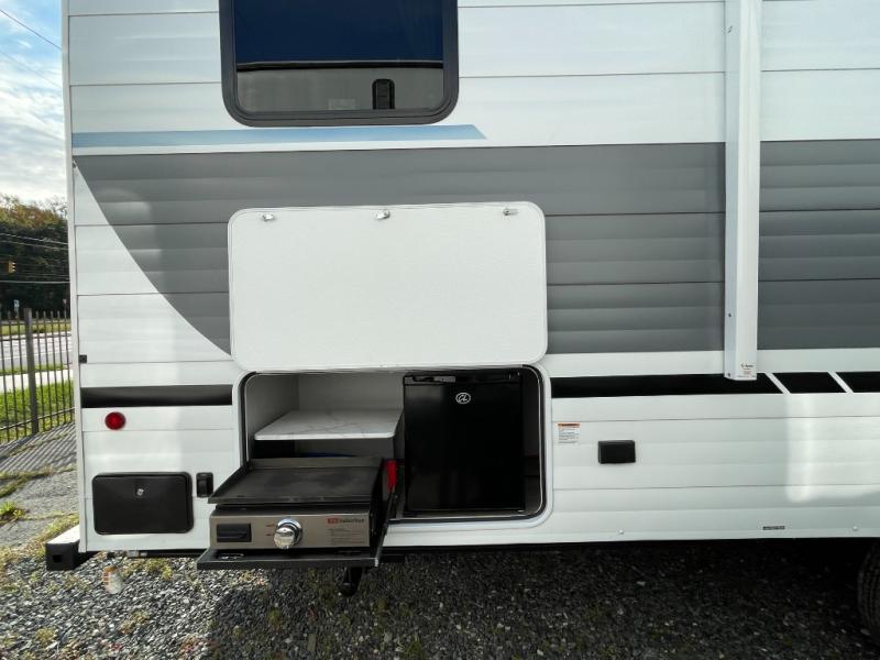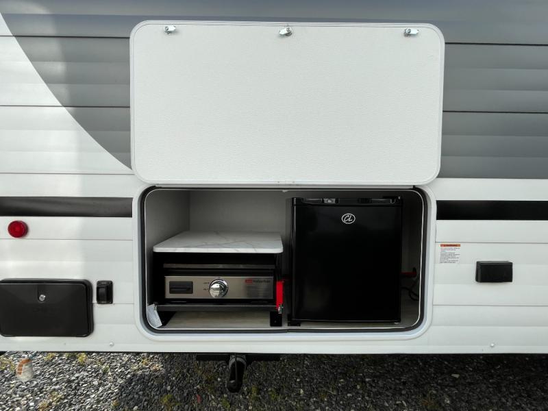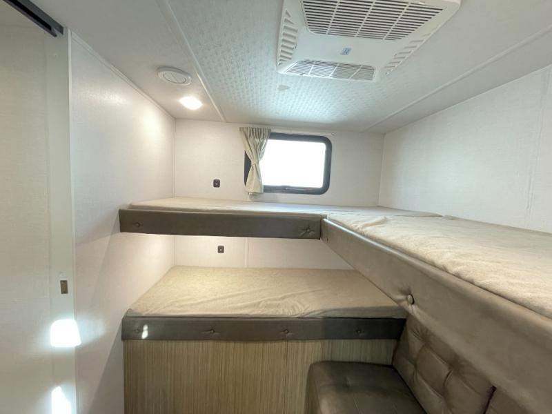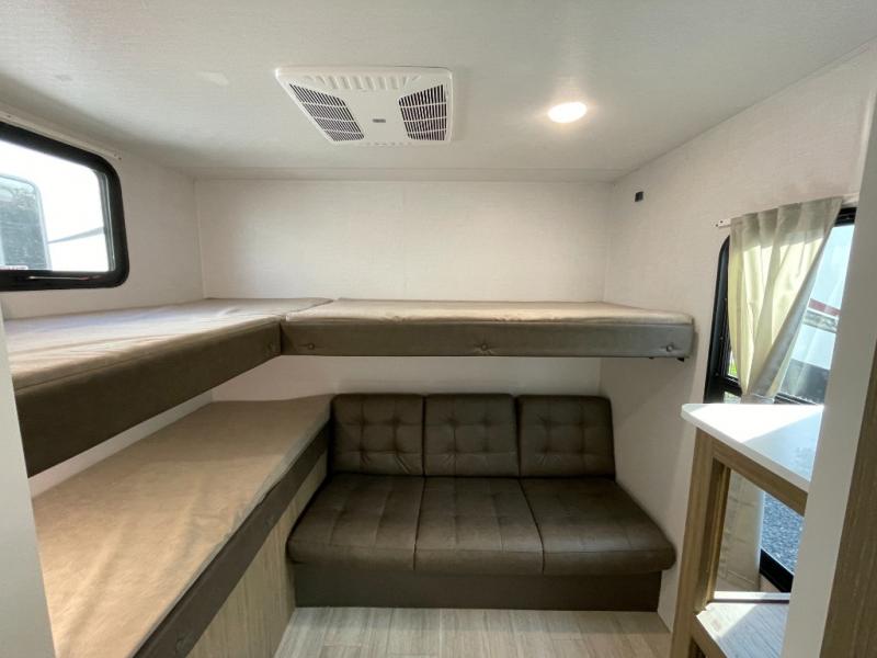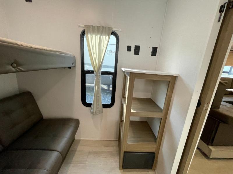 This versatile bunkhouse travel trailer is big enough for the whole family! The private bunkhouse has a set of 30" x 74" bunk beds and a 30" x 74" bunk bed above a Jiffy sofa. Just outside the bunkhouse is a pantry big enough to store everyone's favorite snacks, and a full bathroom with a walk-in shower. The cooktop is just waiting for you to create a delicious meal, and the U-shaped dinette welcomes everyone to enjoy each meal in comfort, plus there is a large panoramic window for a perfect view of your surroundings. Any time of day kick back on the Versa-lounge and relax by the fireplace at the entertainment center. The exterior features a pass-through storage area for you to keep your outdoor camping gear stowed away when not in use, a 16' awning to protect you, and an exterior camp kitchen!