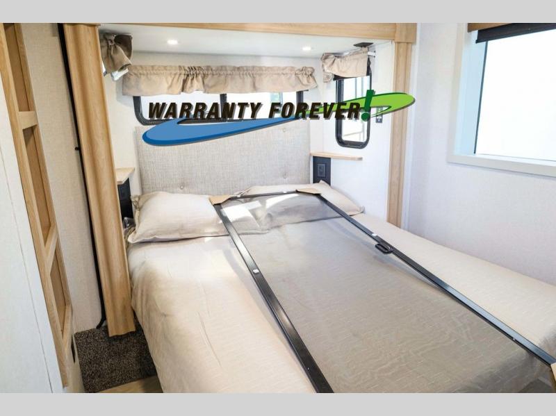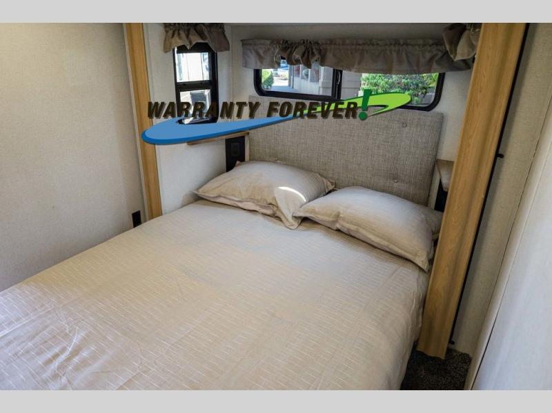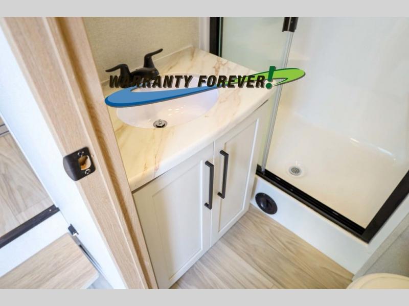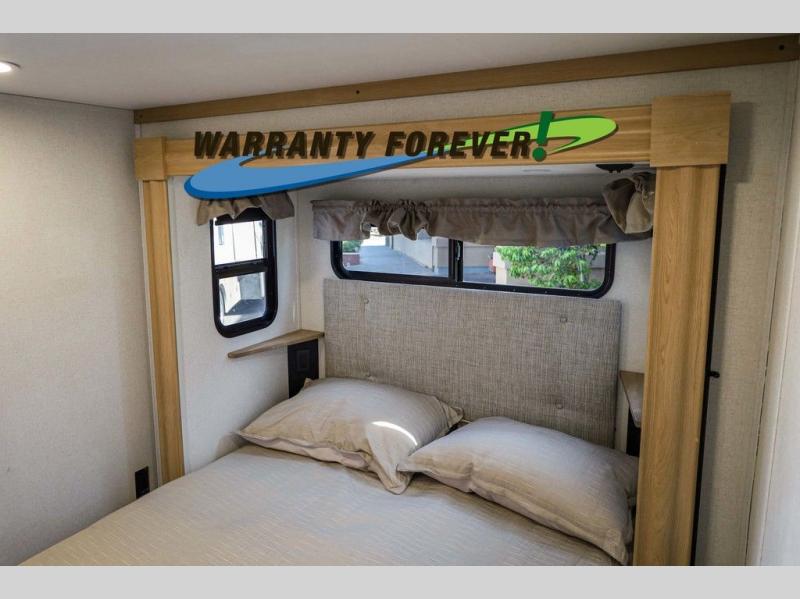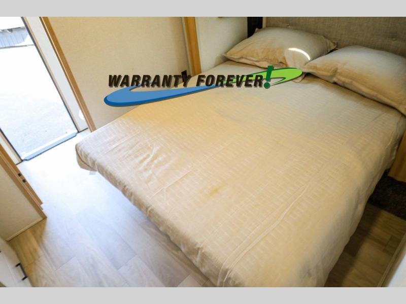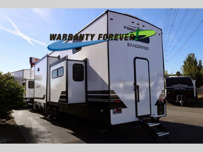 With each Sandpiper Destination Trailer by Forest River you will enjoy many luxurious features, such as crown molding over the kitchen cabinets, solid surface kitchen countertops, a memory foam mattress, plus so much more. The extra large picture windows throughout let natural light in and provide beautiful outdoor views, and each model includes three or more slides for added interior space. You'll find many exterior conveniences, like the porch light with an interior switch, the rain gutters with extra long drip spouts to prevent black streaking, and an electric awning with LED light strip, plus more! You will stay comfortable year around with dual 15,000 A/C units plus each model is constructed with an Underbelly Armor for better protection and insulation!