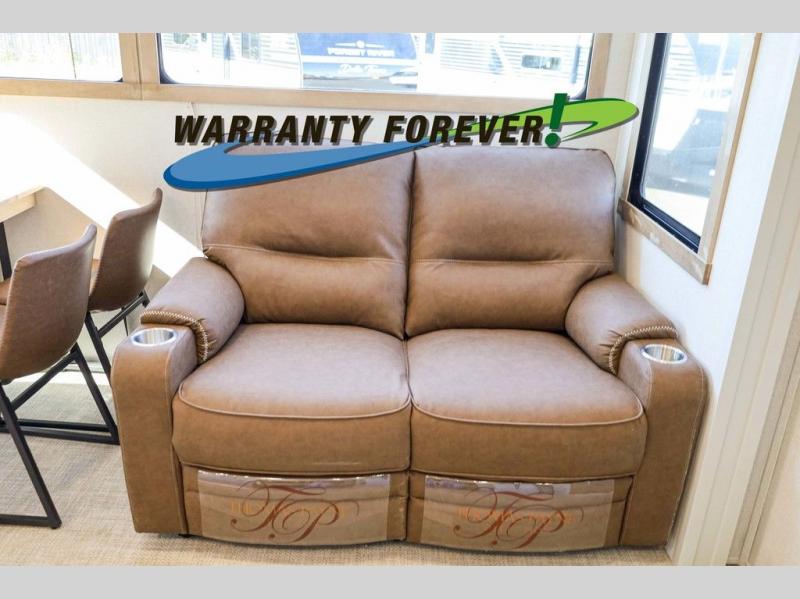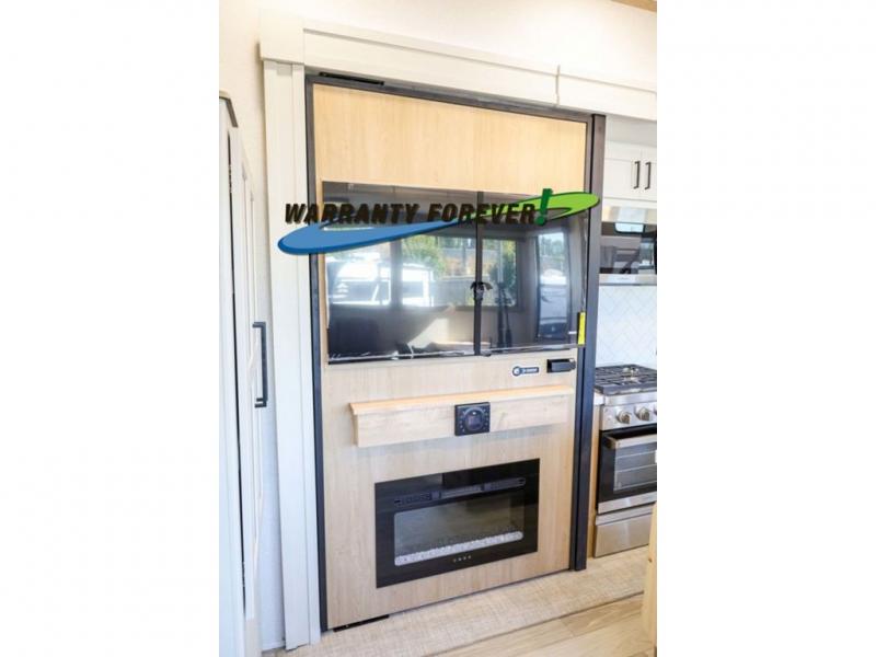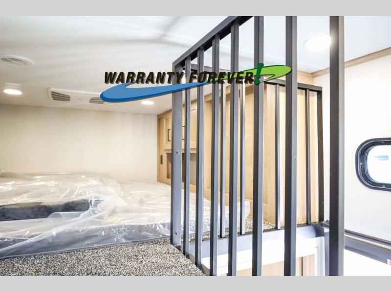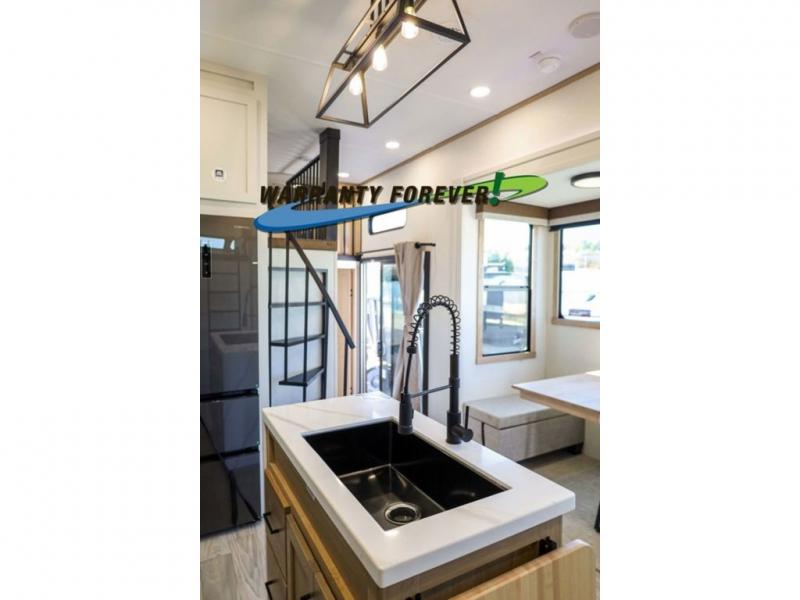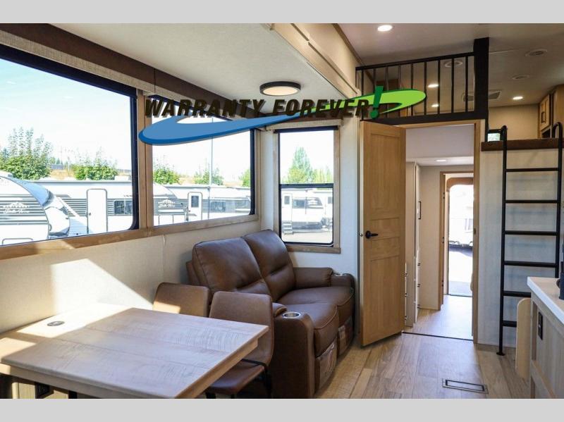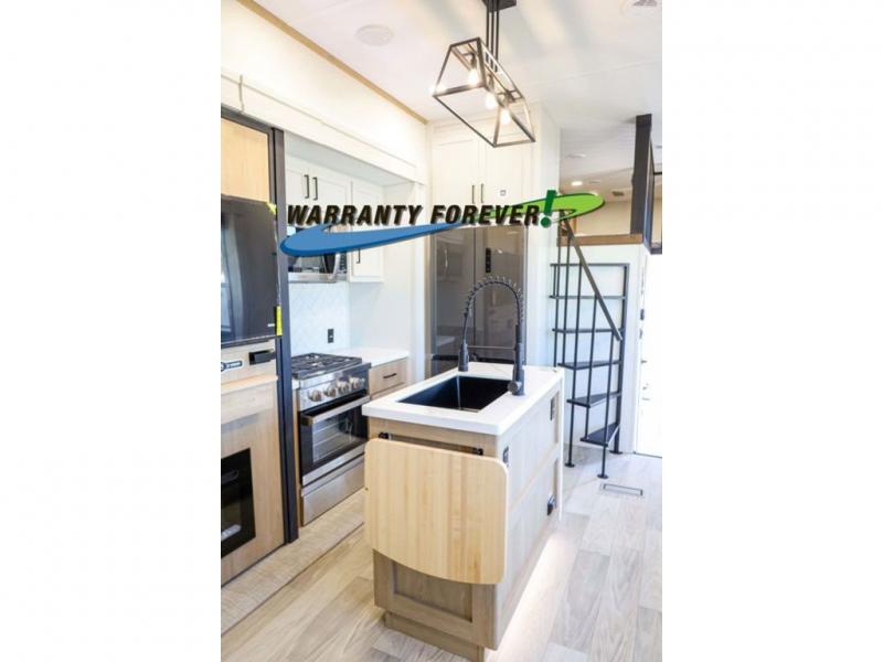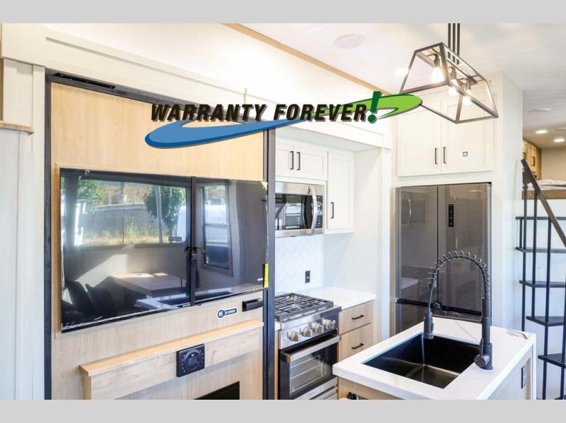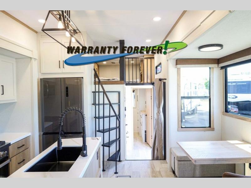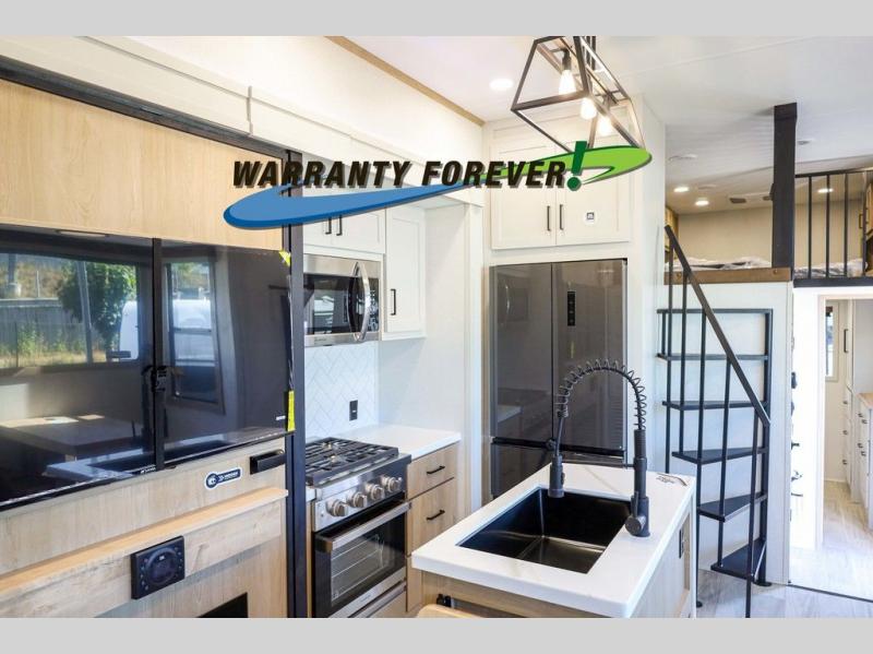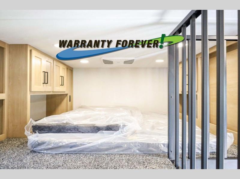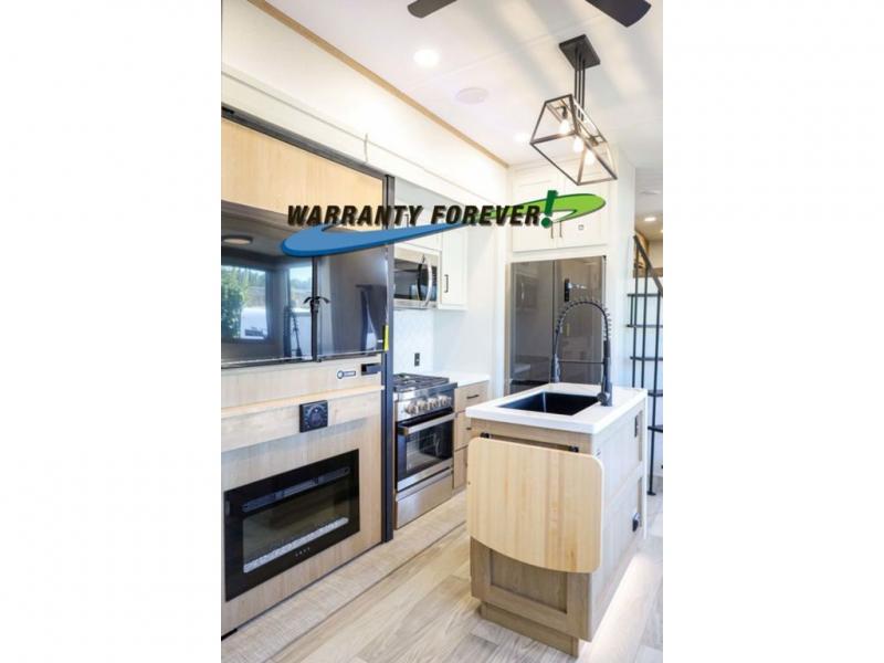 You won't believe the comfort and convenience found in this destination trailer. There are two private bedrooms; one up front with a queen bed slide out and storage space, and one in back with a queen bed slide out and a half bath! There is even washer and dryer prep here if you want to add those appliances and the second entry door is also found in this location so you can easily slip out in the morning. Above each of these rooms is a loft providing three total bunk mats for sleeping, storage cabinets, and TV prep if you want to add entertainment. Everyone can meet in the combined kitchen and living room that includes dual opposing slides, a 60" theater seating across from a 50" flat screen TV and fireplace, plus a free-standing table with chairs and a bench to dine at. The chef of your group will love the large kitchen island, Chef Collection three burner range, and a 16.2 cu. ft. refrigerator for food storage.