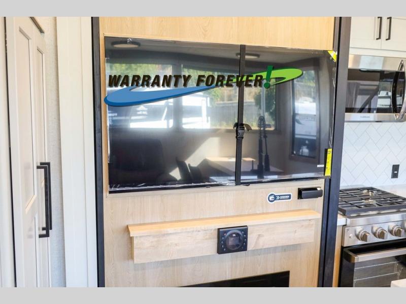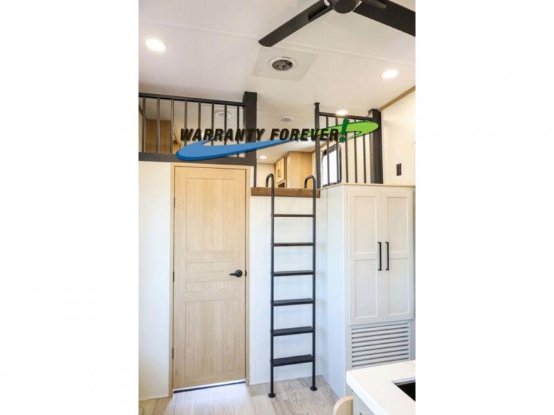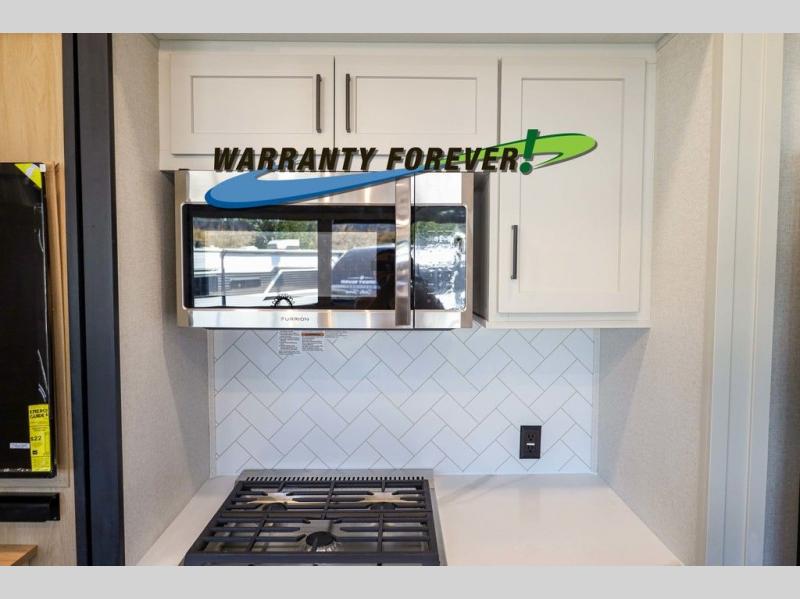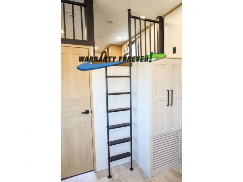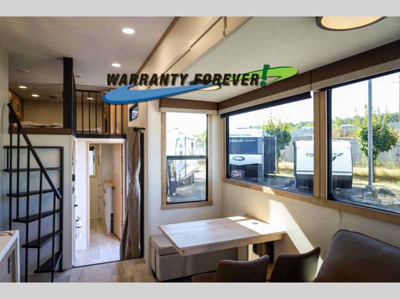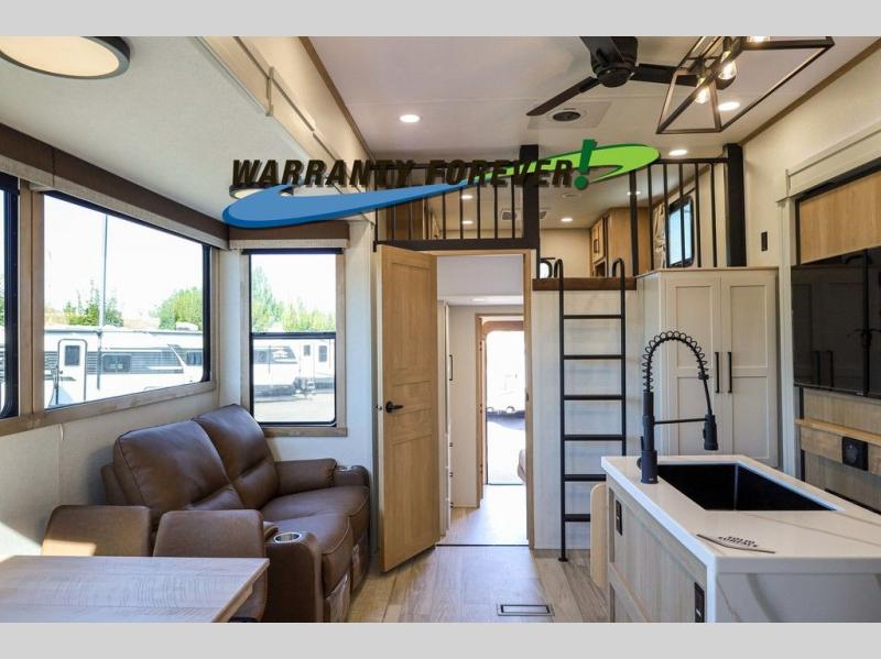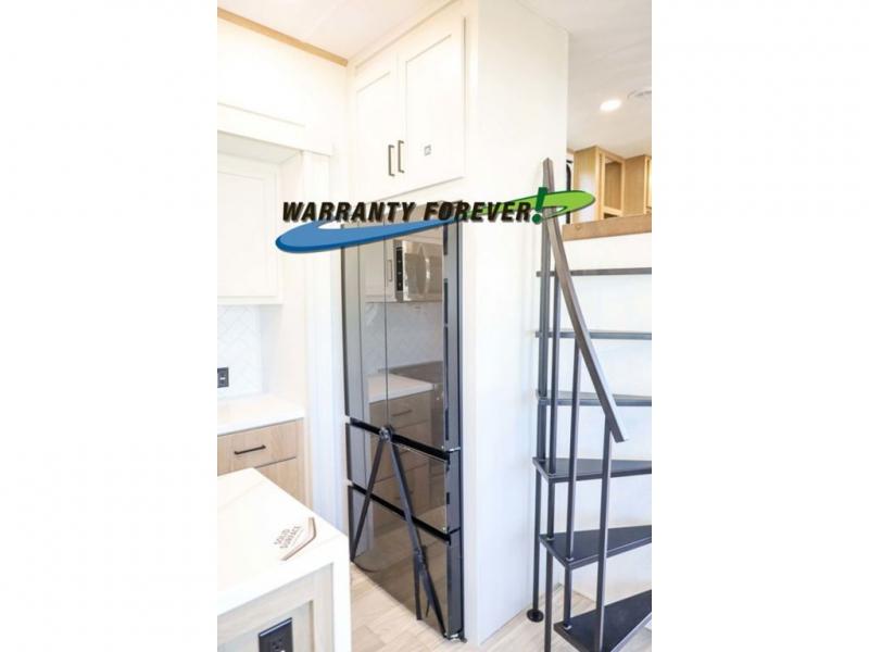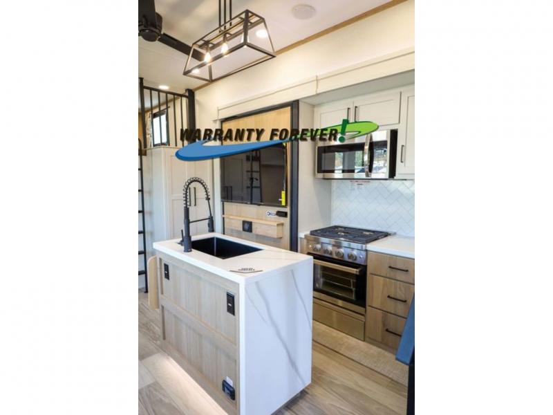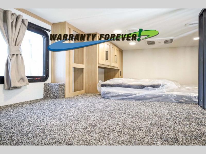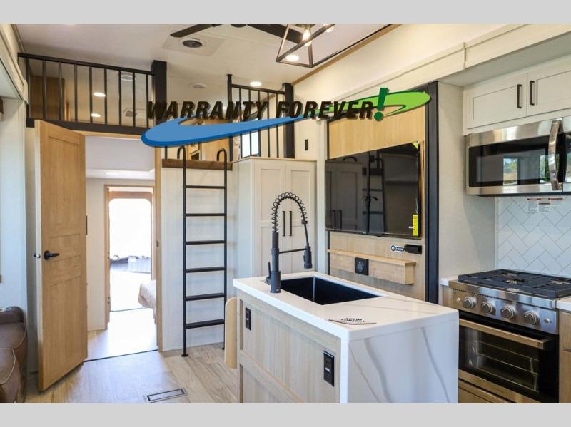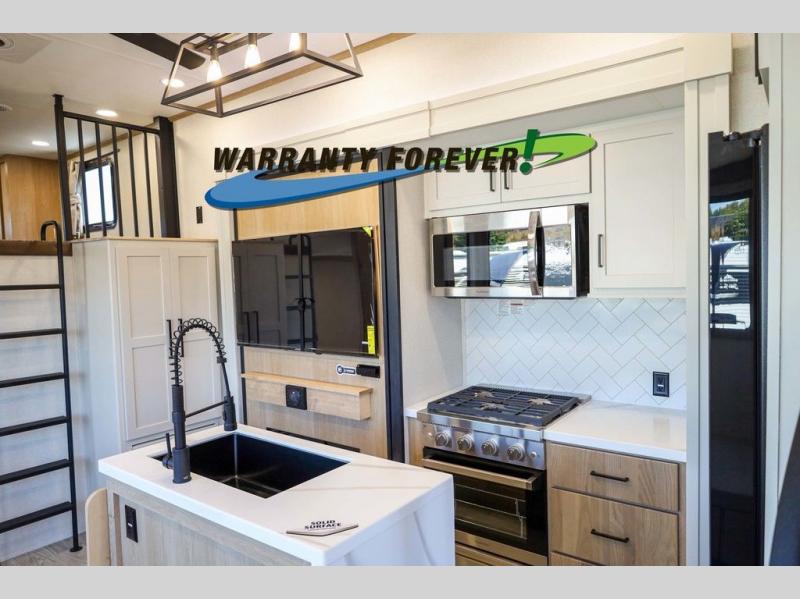 You won't believe the comfort and convenience found in this destination trailer. There are two private bedrooms; one up front with a queen bed slide out and storage space, and one in back with a queen bed slide out and a half bath! There is even washer and dryer prep here if you want to add those appliances and the second entry door is also found in this location so you can easily slip out in the morning. Above each of these rooms is a loft providing three total bunk mats for sleeping, storage cabinets, and TV prep if you want to add entertainment. Everyone can meet in the combined kitchen and living room that includes dual opposing slides, a 60" theater seating across from a 50" flat screen TV and fireplace, plus a free-standing table with chairs and a bench to dine at. The chef of your group will love the large kitchen island, Chef Collection three burner range, and a 16.2 cu. ft. refrigerator for food storage.