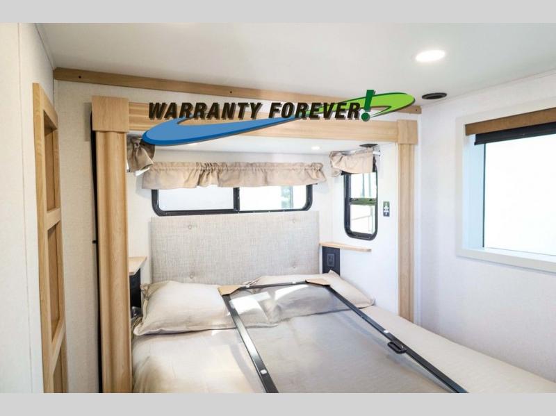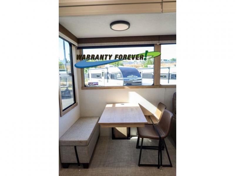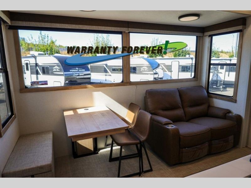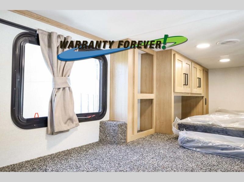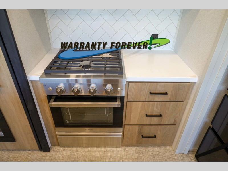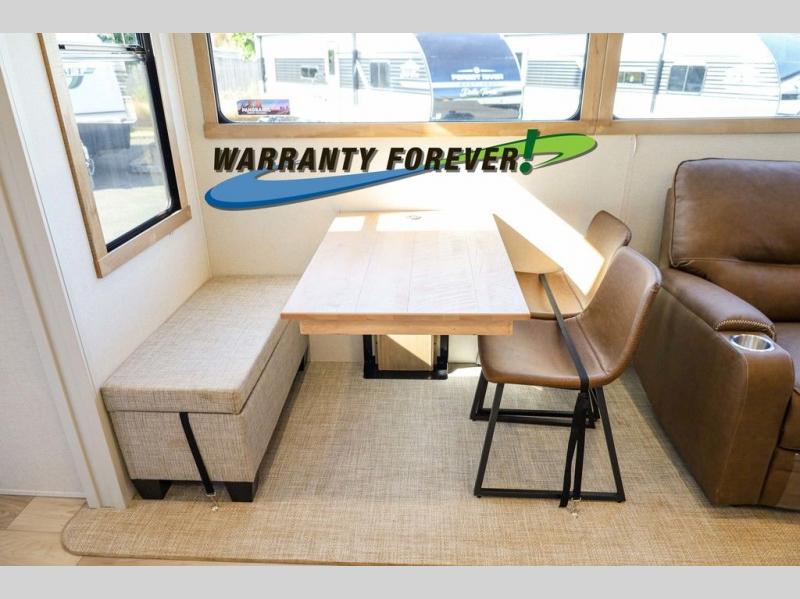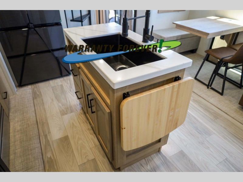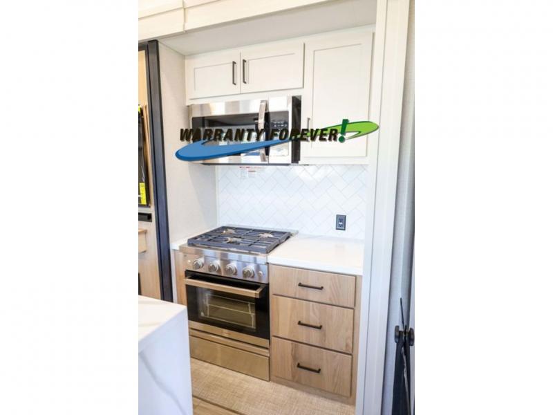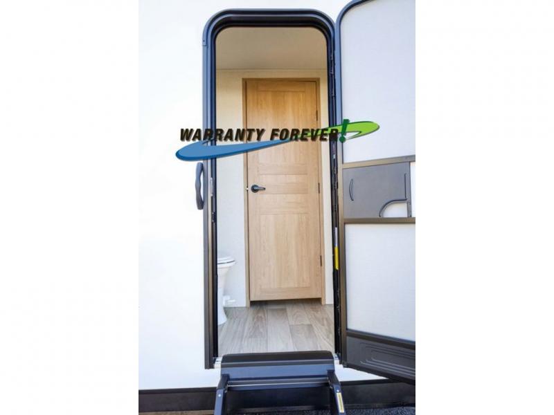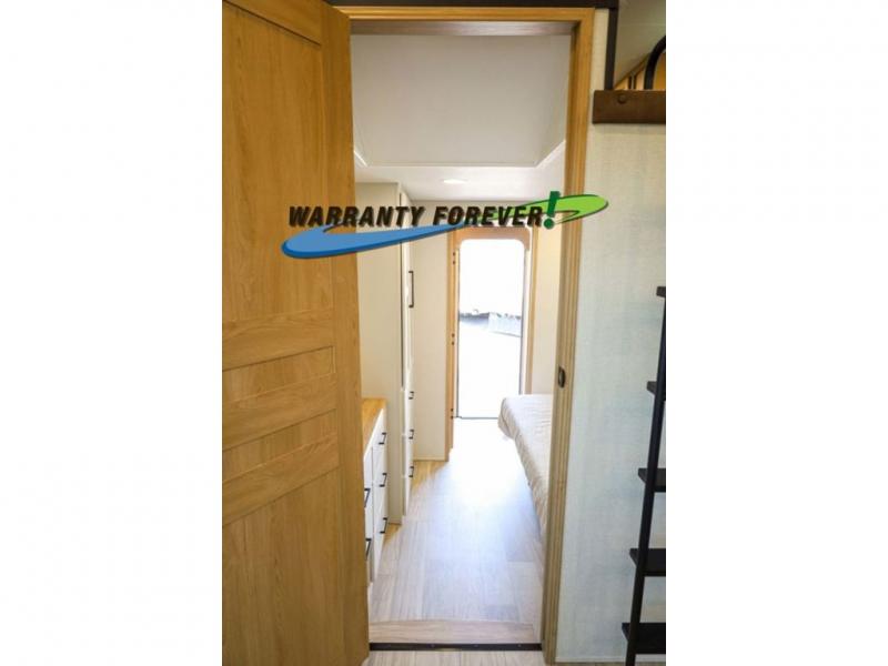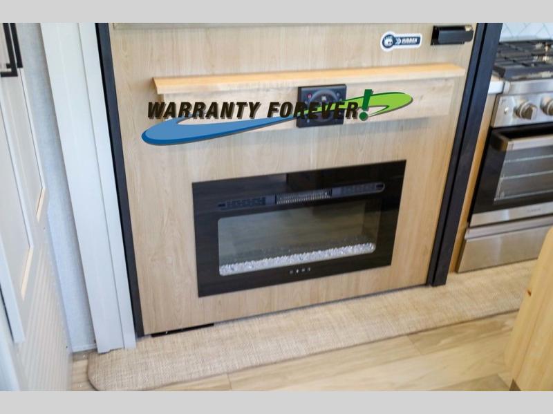 You won't believe the comfort and convenience found in this destination trailer. There are two private bedrooms; one up front with a queen bed slide out and storage space, and one in back with a queen bed slide out and a half bath! There is even washer and dryer prep here if you want to add those appliances and the second entry door is also found in this location so you can easily slip out in the morning. Above each of these rooms is a loft providing three total bunk mats for sleeping, storage cabinets, and TV prep if you want to add entertainment. Everyone can meet in the combined kitchen and living room that includes dual opposing slides, a 60" theater seating across from a 50" flat screen TV and fireplace, plus a free-standing table with chairs and a bench to dine at. The chef of your group will love the large kitchen island, Chef Collection three burner range, and a 16.2 cu. ft. refrigerator for food storage.