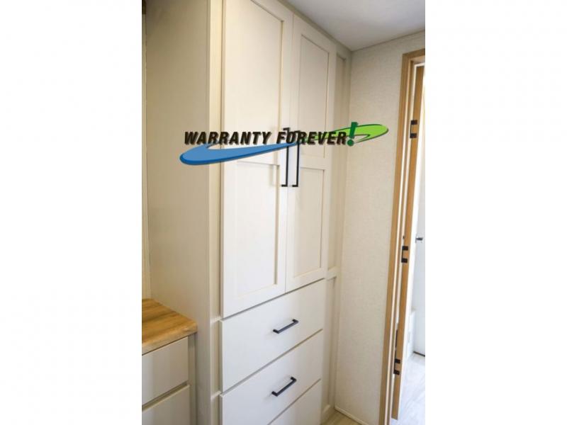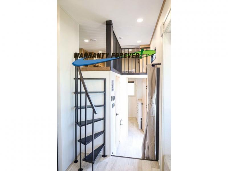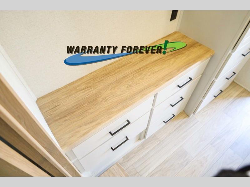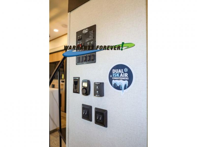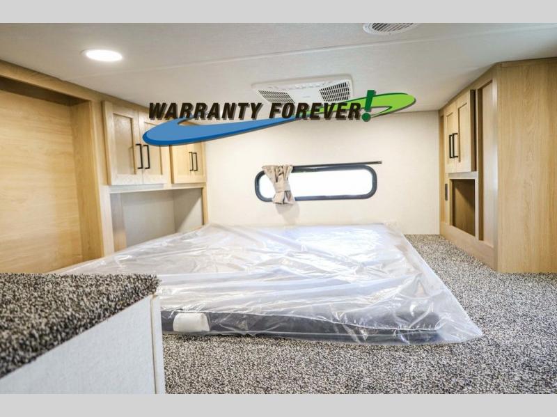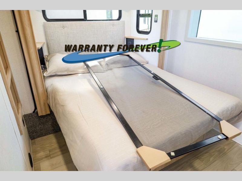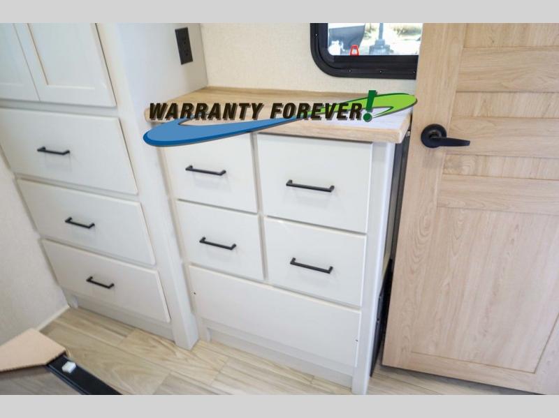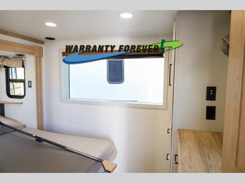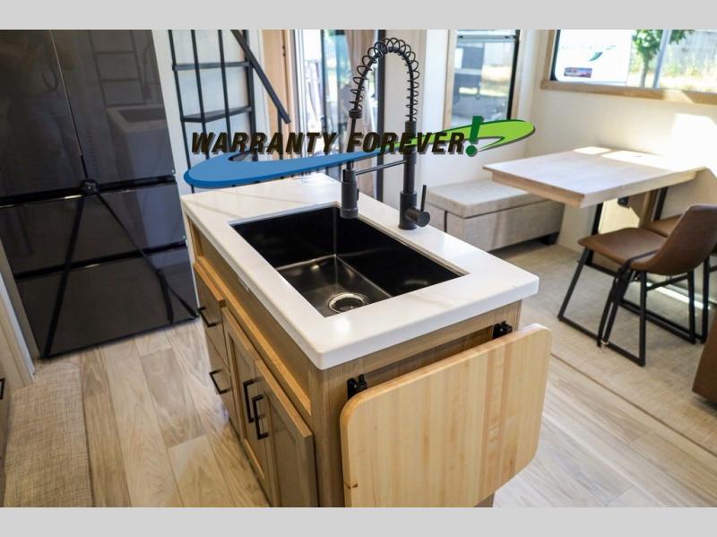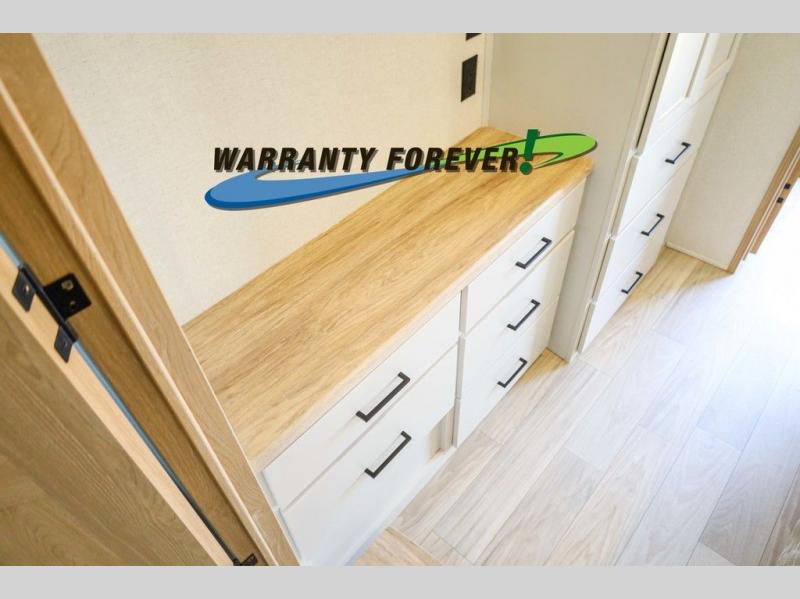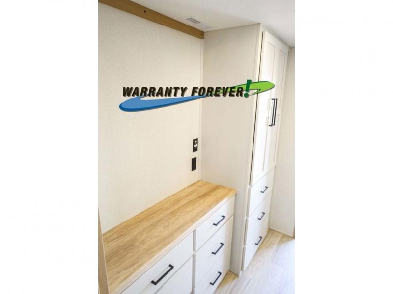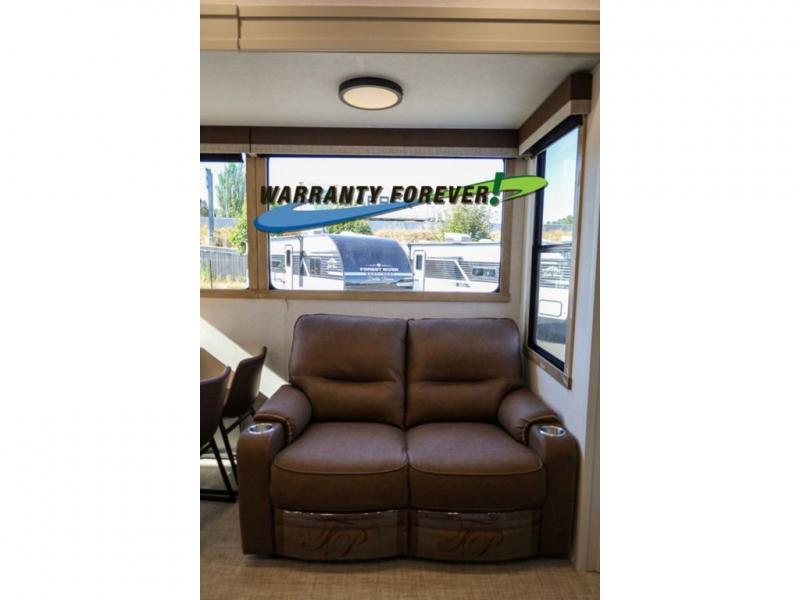 You won't believe the comfort and convenience found in this destination trailer. There are two private bedrooms; one up front with a queen bed slide out and storage space, and one in back with a queen bed slide out and a half bath! There is even washer and dryer prep here if you want to add those appliances and the second entry door is also found in this location so you can easily slip out in the morning. Above each of these rooms is a loft providing three total bunk mats for sleeping, storage cabinets, and TV prep if you want to add entertainment. Everyone can meet in the combined kitchen and living room that includes dual opposing slides, a 60" theater seating across from a 50" flat screen TV and fireplace, plus a free-standing table with chairs and a bench to dine at. The chef of your group will love the large kitchen island, Chef Collection three burner range, and a 16.2 cu. ft. refrigerator for food storage.