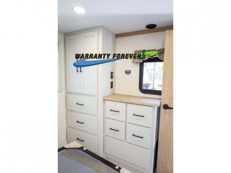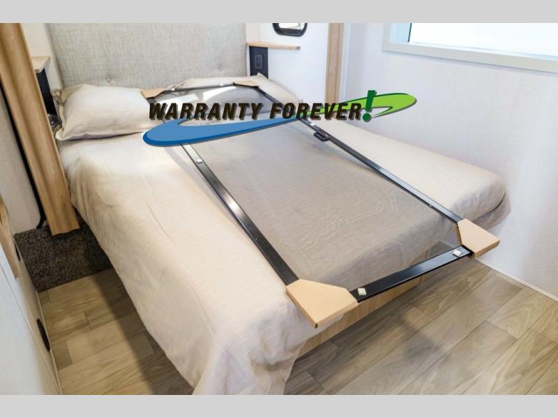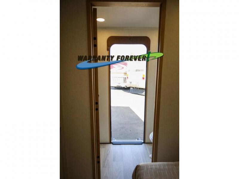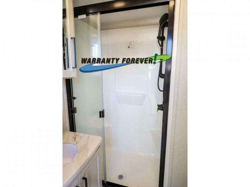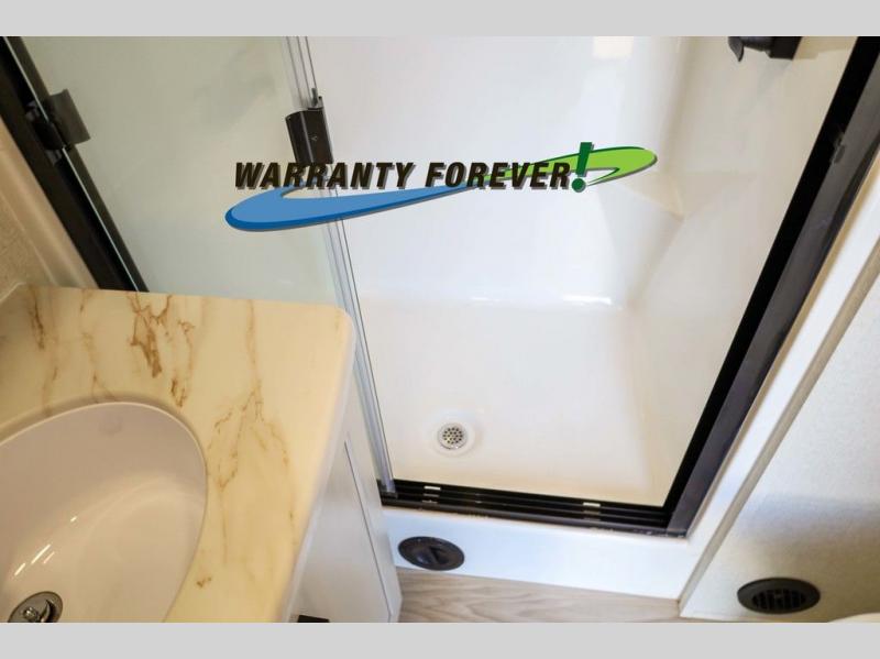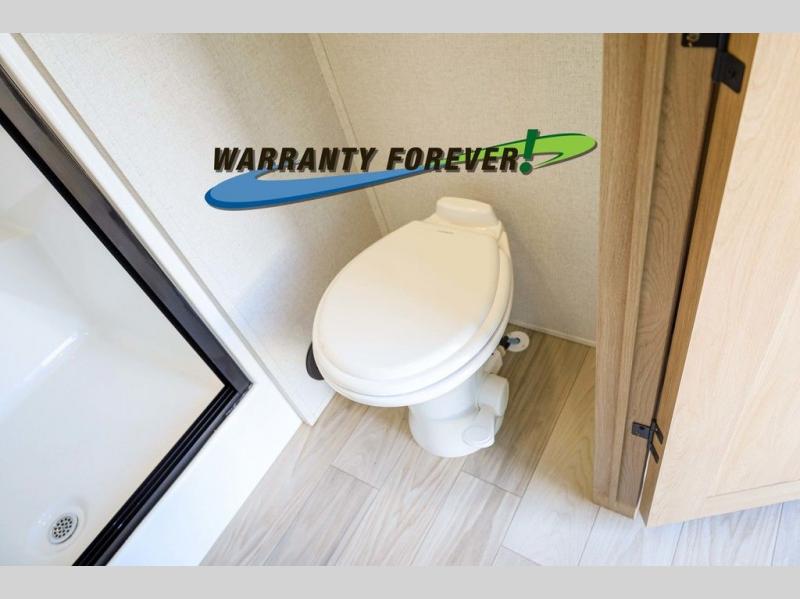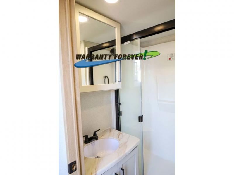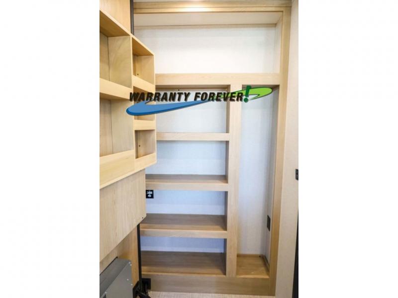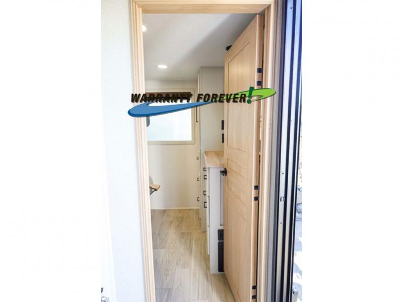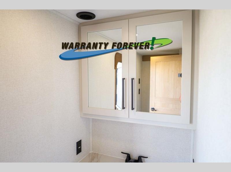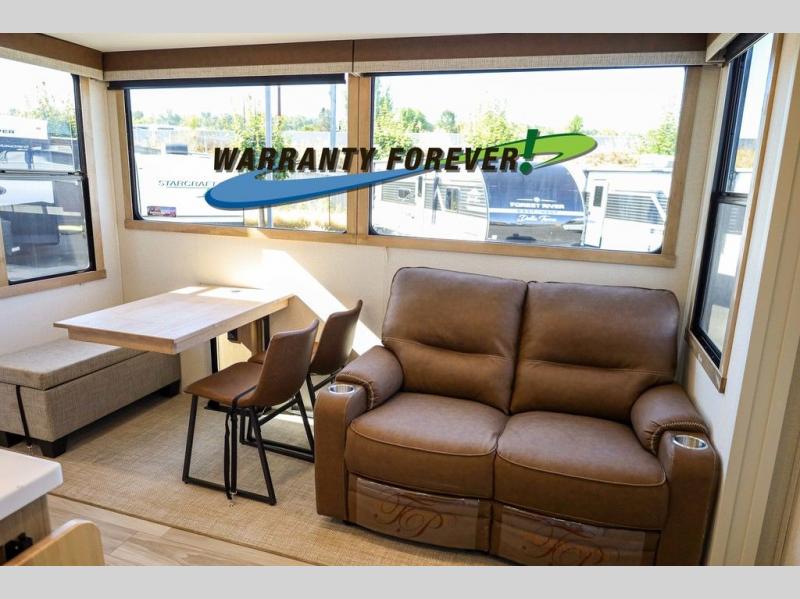You won't believe the comfort and convenience found in this destination trailer. There are two private bedrooms; one up front with a queen bed slide out and storage space, and one in back with a queen bed slide out and a half bath! There is even washer and dryer prep here if you want to add those appliances and the second entry door is also found in this location so you can easily slip out in the morning. Above each of these rooms is a loft providing three total bunk mats for sleeping, storage cabinets, and TV prep if you want to add entertainment. Everyone can meet in the combined kitchen and living room that includes dual opposing slides, a 60" theater seating across from a 50" flat screen TV and fireplace, plus a free-standing table with chairs and a bench to dine at. The chef of your group will love the large kitchen island, Chef Collection three burner range, and a 16.2 cu. ft. refrigerator for food storage.
