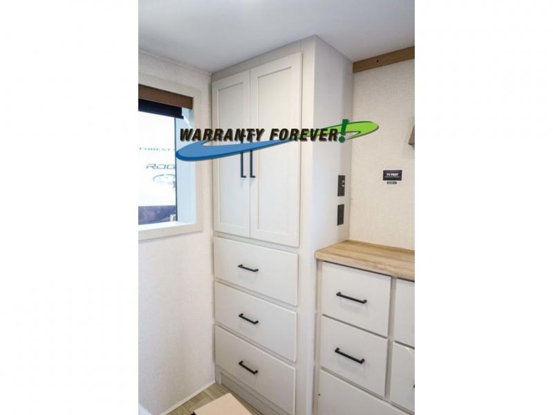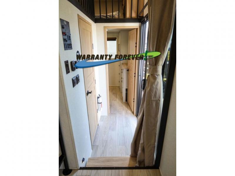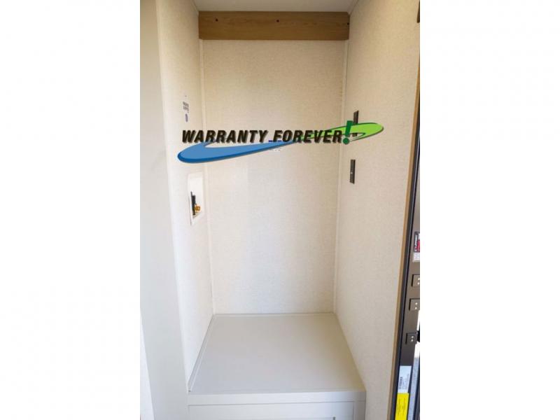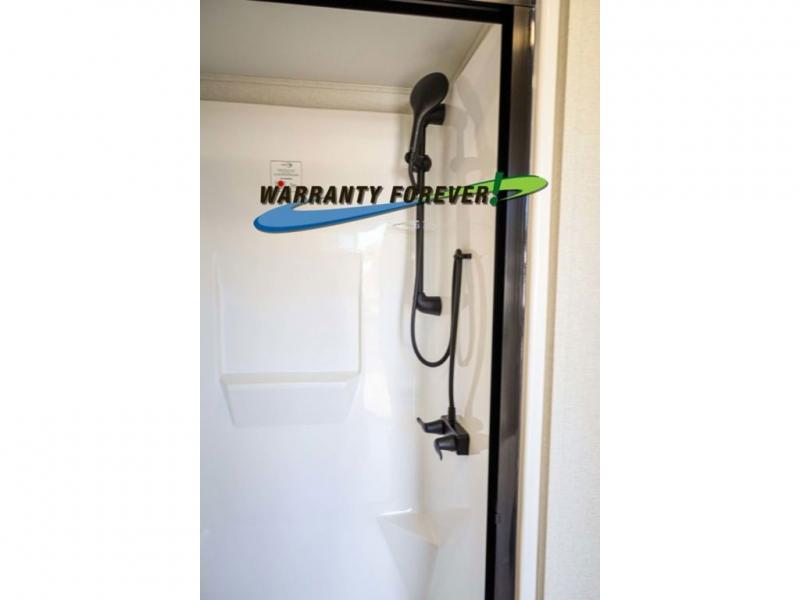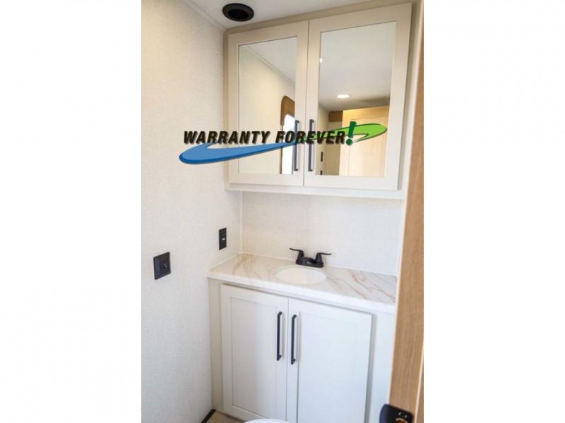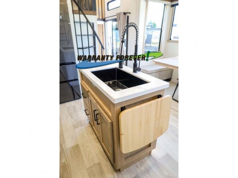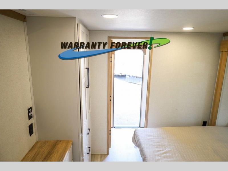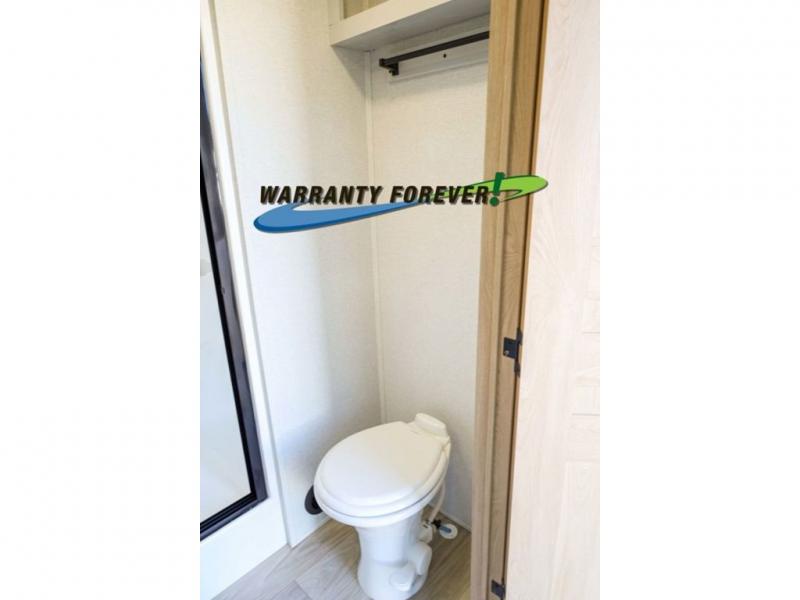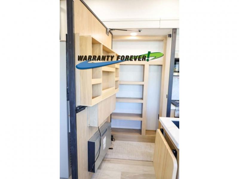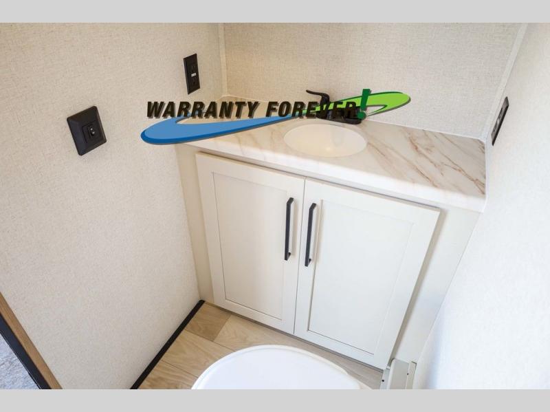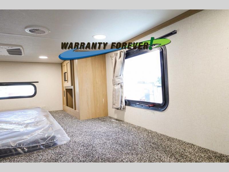 You won't believe the comfort and convenience found in this destination trailer. There are two private bedrooms; one up front with a queen bed slide out and storage space, and one in back with a queen bed slide out and a half bath! There is even washer and dryer prep here if you want to add those appliances and the second entry door is also found in this location so you can easily slip out in the morning. Above each of these rooms is a loft providing three total bunk mats for sleeping, storage cabinets, and TV prep if you want to add entertainment. Everyone can meet in the combined kitchen and living room that includes dual opposing slides, a 60" theater seating across from a 50" flat screen TV and fireplace, plus a free-standing table with chairs and a bench to dine at. The chef of your group will love the large kitchen island, Chef Collection three burner range, and a 16.2 cu. ft. refrigerator for food storage.