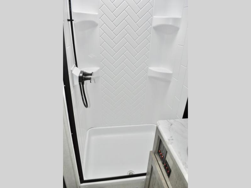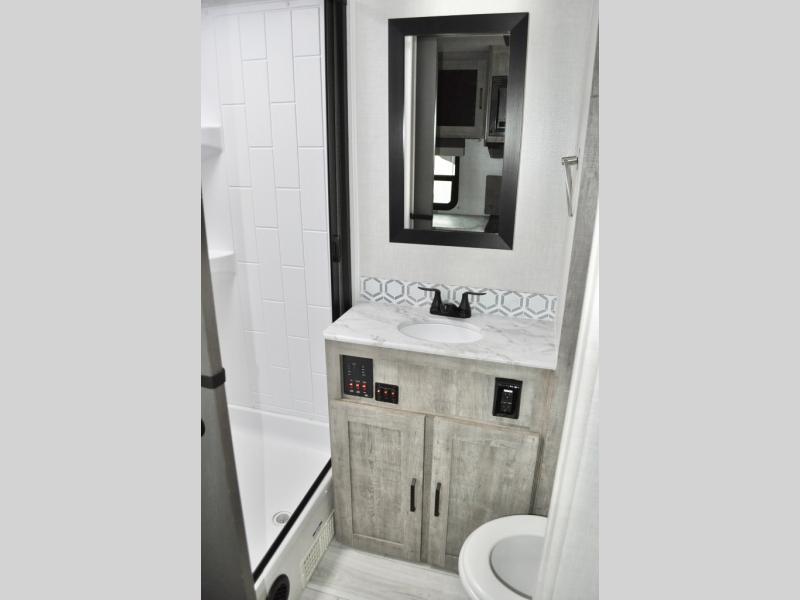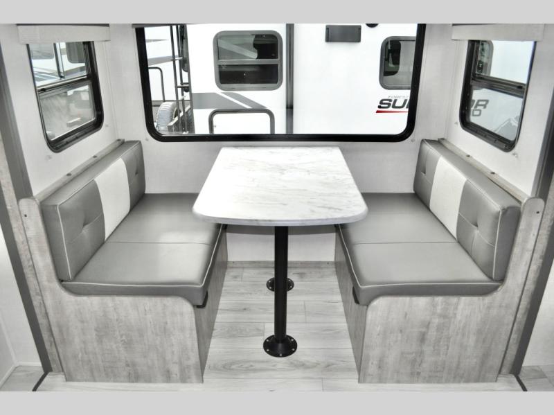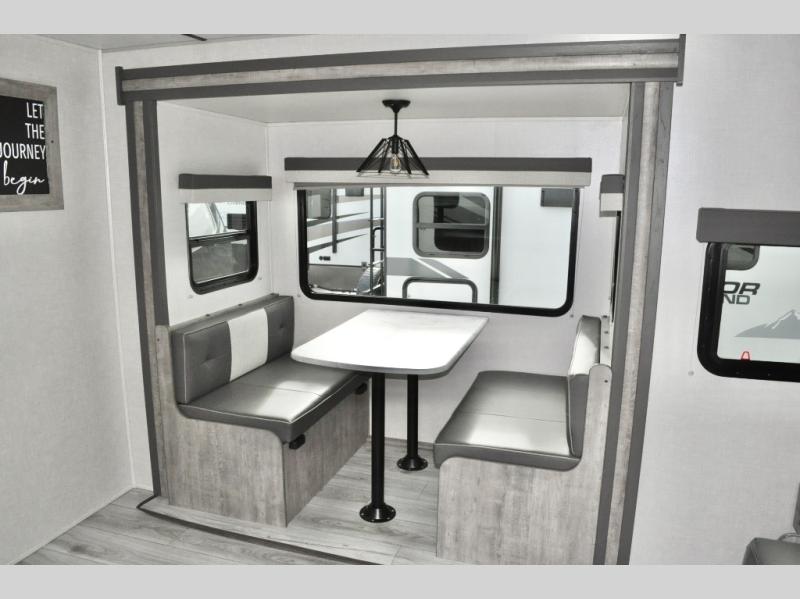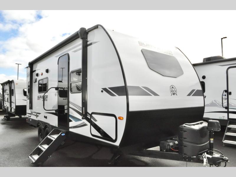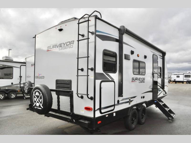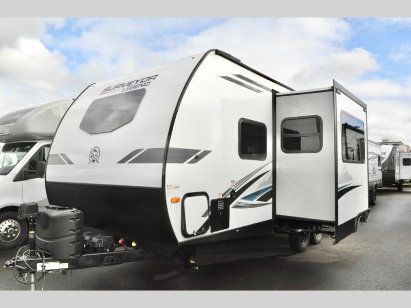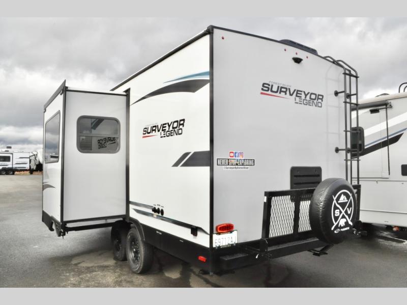 With any Surveyor Legend travel trailer by Forest River you will enjoy quality craftsmanship, convenient amenities, and at-home comforts. The Azdel composite walls provide a longer-lasting trailer, and the power tongue jack with hitch light makes getting back on the road quick and easy. There are also Goodyear® tires and a tire pressure monitoring system (TPMS) for more confident, hassle-free towing. Each model is built with thoughtful details like slam-latch exterior baggage doors and an automotive-style tinted front windshield that gives the front cap a sleek look while letting in natural light. You’ll appreciate camping with a tankless water heater for endless hot showers, a 2" rear accessory hitch to bring bikes or extra gear along, plus a central vacuum system that helps keep your easy-to-clean interior looking fresh.