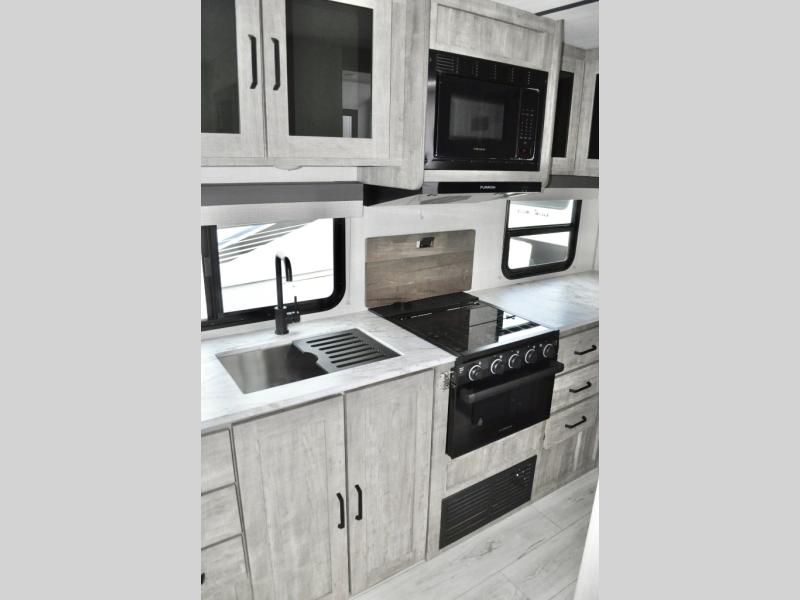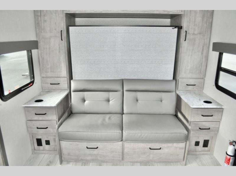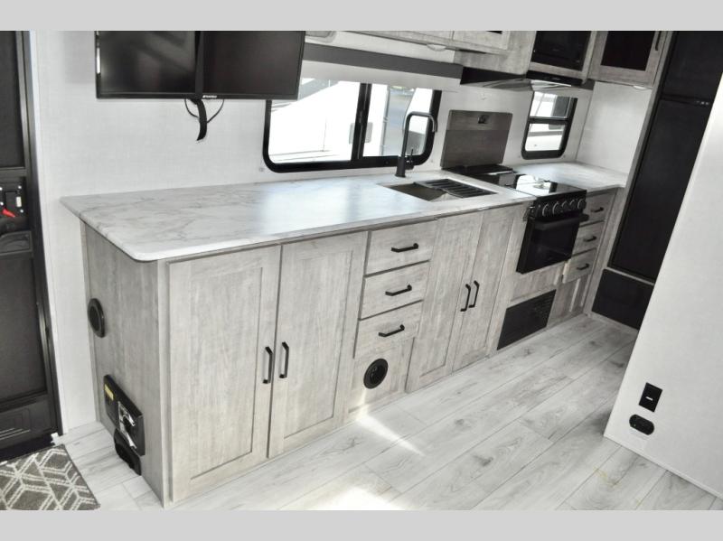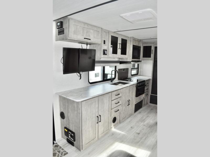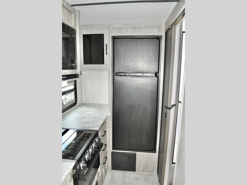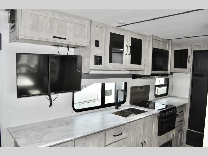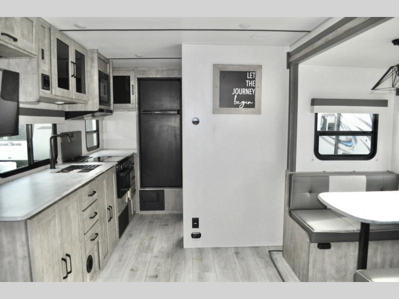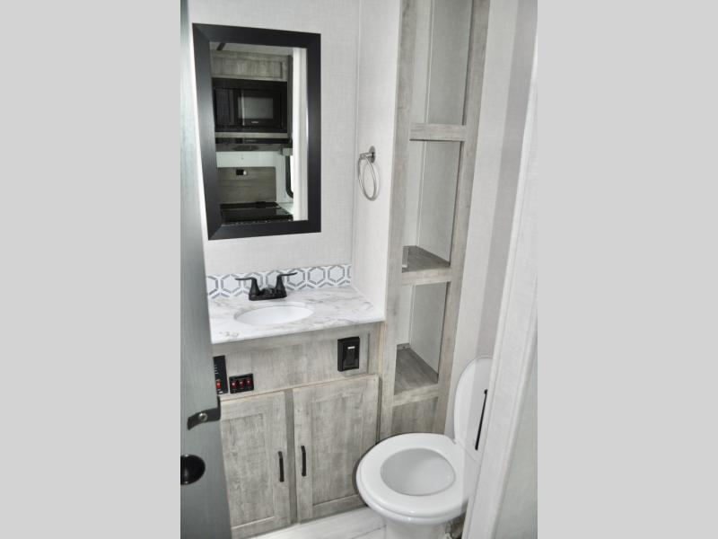 With any Surveyor Legend travel trailer by Forest River you will enjoy quality craftsmanship, convenient amenities, and at-home comforts. The Azdel composite walls provide a longer-lasting trailer, and the power tongue jack with hitch light makes getting back on the road quick and easy. There are also Goodyear® tires and a tire pressure monitoring system (TPMS) for more confident, hassle-free towing. Each model is built with thoughtful details like slam-latch exterior baggage doors and an automotive-style tinted front windshield that gives the front cap a sleek look while letting in natural light. You’ll appreciate camping with a tankless water heater for endless hot showers, a 2" rear accessory hitch to bring bikes or extra gear along, plus a central vacuum system that helps keep your easy-to-clean interior looking fresh.