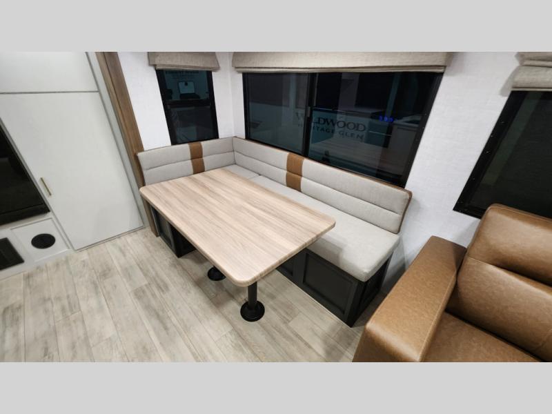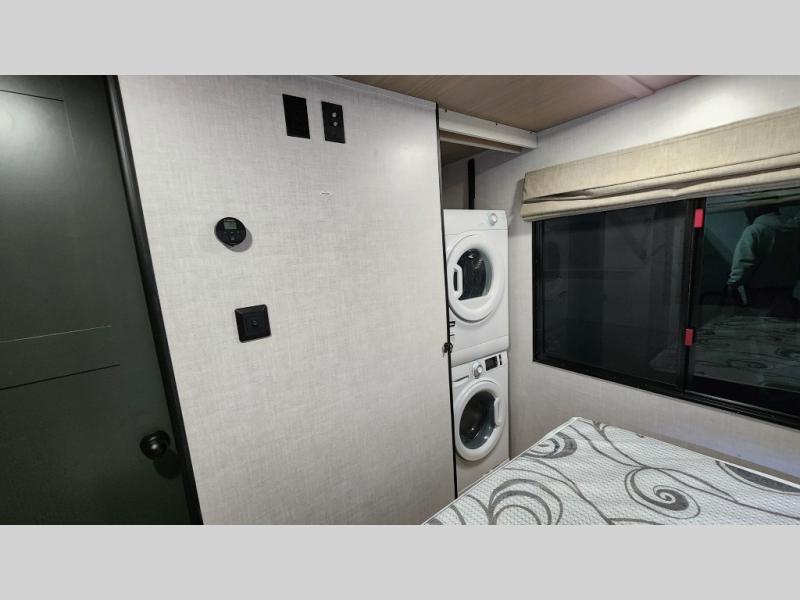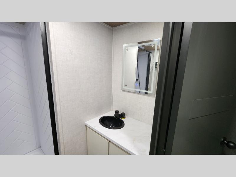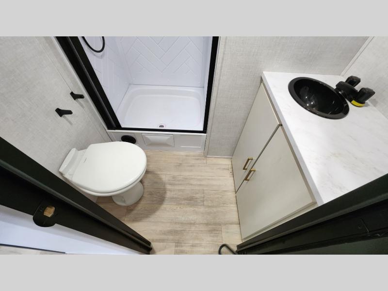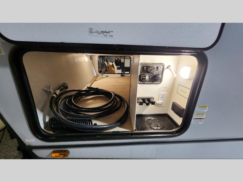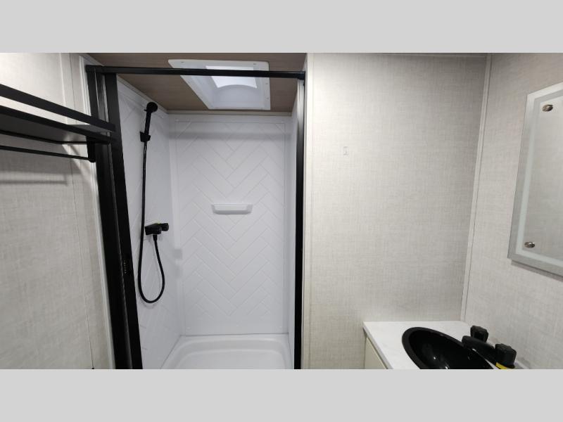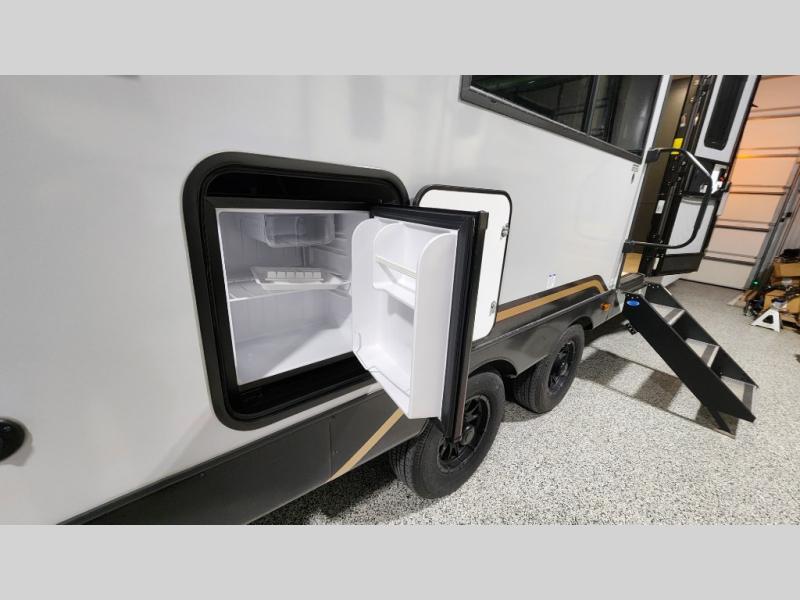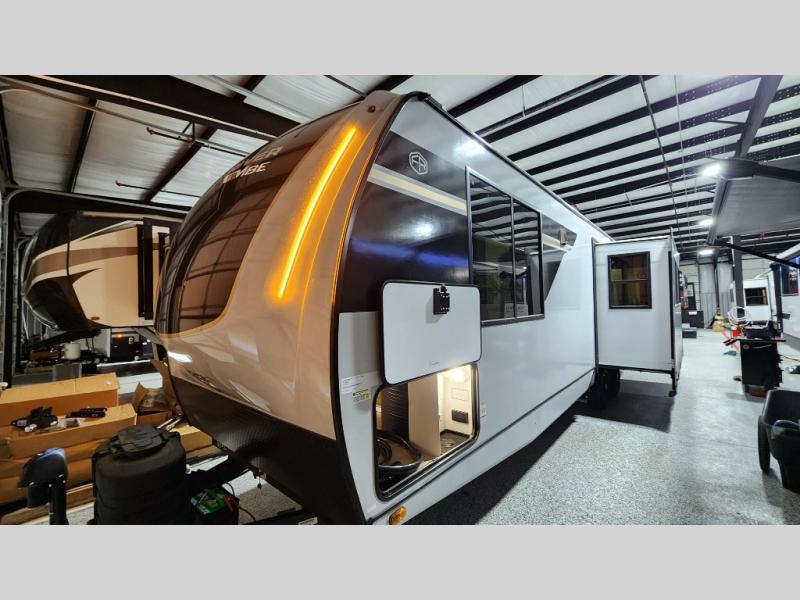 Escape to the great outdoors in this Vibe travel trailer. Once you arrive at your campsite, set up the 20' electric awning with LED lights, then grab the fishing poles from the large pass-through storage. You can make lunch on the electric oven/air fryer, and your food can be stored in the 12V refrigerator. The spacious full bath includes a 36" x 30" walk-in shower to clean up every day, and there is a linen closet to store clean towels and necessities.