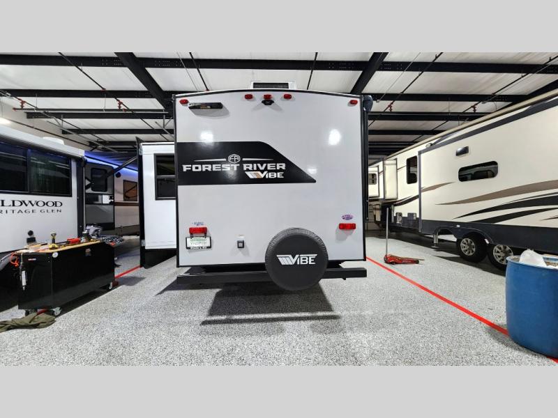 With any Vibe travel trailer by Forest River, you will enjoy comfort at every turn! There is a Norco huck-bolted steel frame, an enclosed underbelly with 12V heating pads, and a PVC roof membrane for added durability. You will also find a universal docking station outside, along with slam latch doors, European style square windows, and an automotive painted front cap. Head inside to enjoy the premium residential-style furniture, decorative window treatments, privacy shades in the living room and bedroom, and many more comforts!