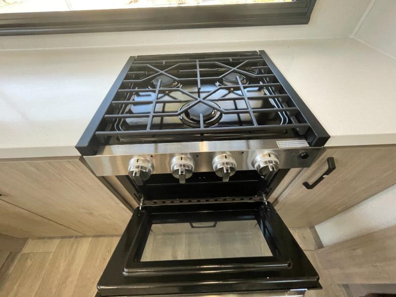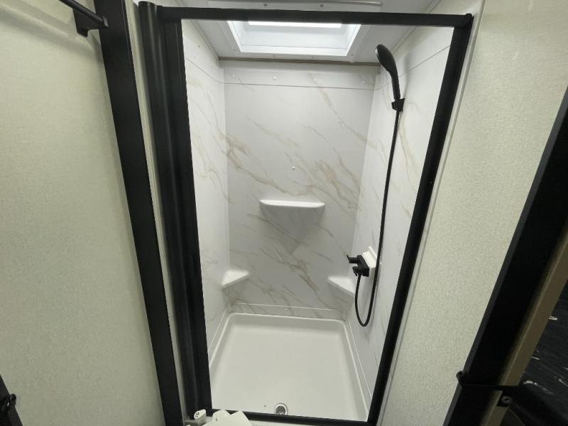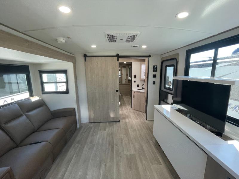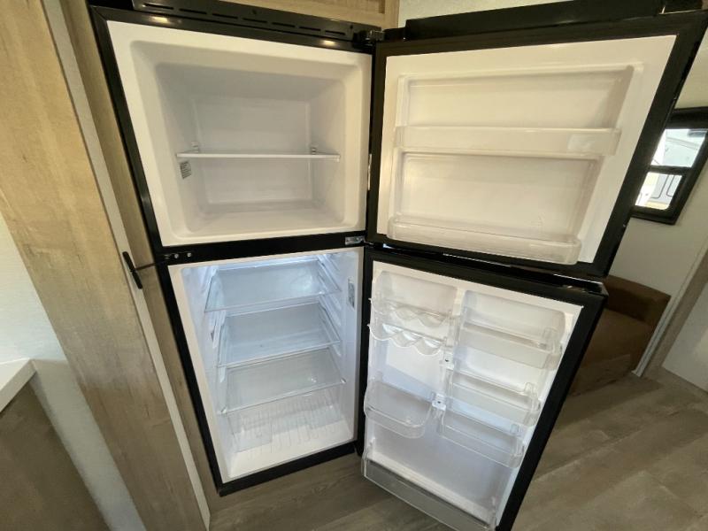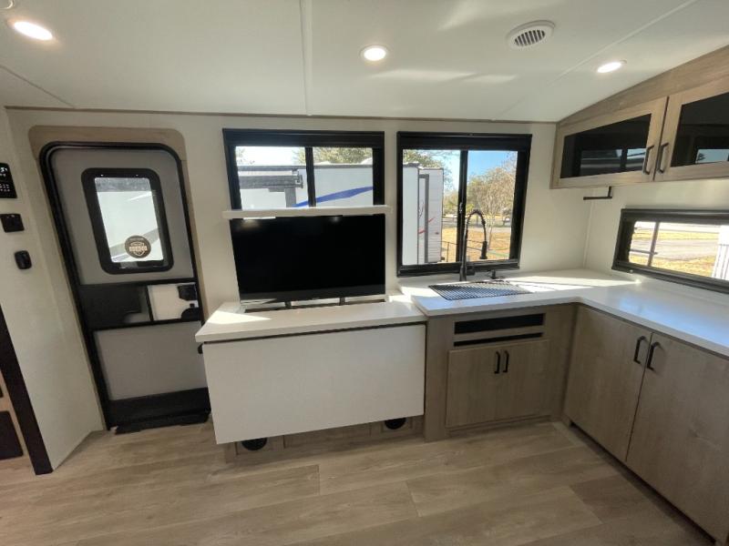 At the front of the 2700BS trailer, you’ll find a spacious full bedroom featuring a 70" x 80" king bed housed in one of two slide outs, offering both generous space and a comfortable night’s rest. The room also includes a wardrobe and dresser, providing ample storage for clothing and essentials. Moving toward the center, the walk-through bathroom boasts a 30" x 36" residential walk-in shower with a skylight, a toilet, and a sink opposite a mirrored medicine cabinet for added convenience and storage. At the rear, the open-concept kitchen and living area make excellent use of the second slide out, which includes cozy theater seating, perfect for dining or relaxing while watching TV. Next to it sits a 10-cu. ft. refrigerator, offering plenty of room for groceries and refreshments. Across the space, the L-shaped kitchen spans the entire rear wall, giving you extensive countertop room for meal prep. Equipped with a three-burner range, oven, microwave, and stainless steel sink, this kitchen allows you to cook in comfort and style without relying on campsite facilities.