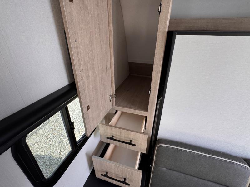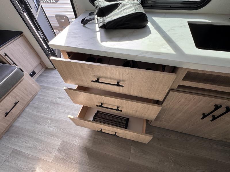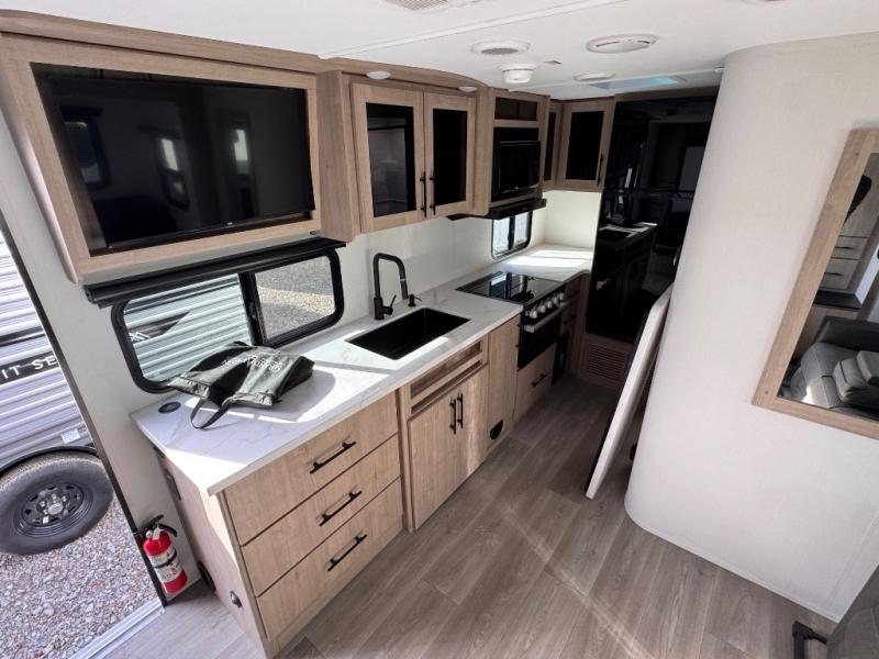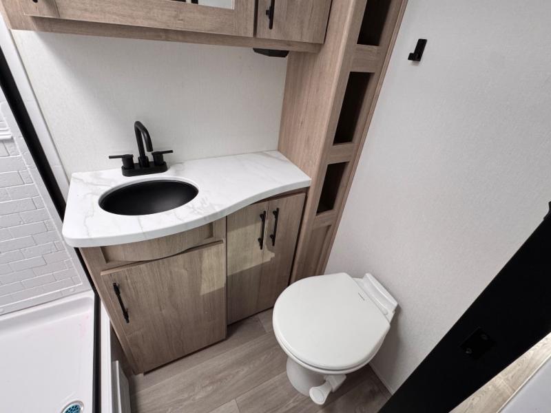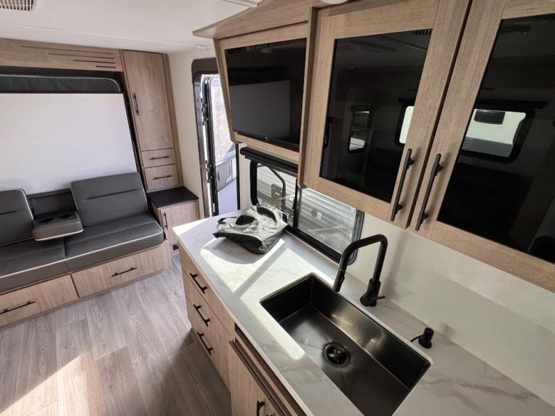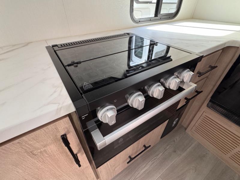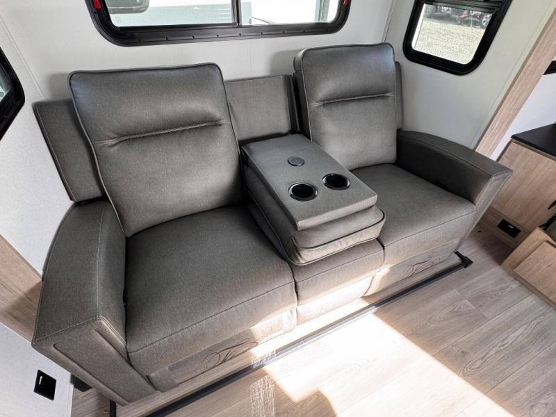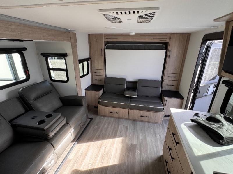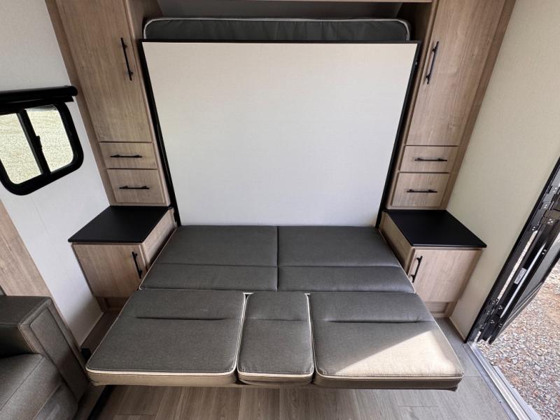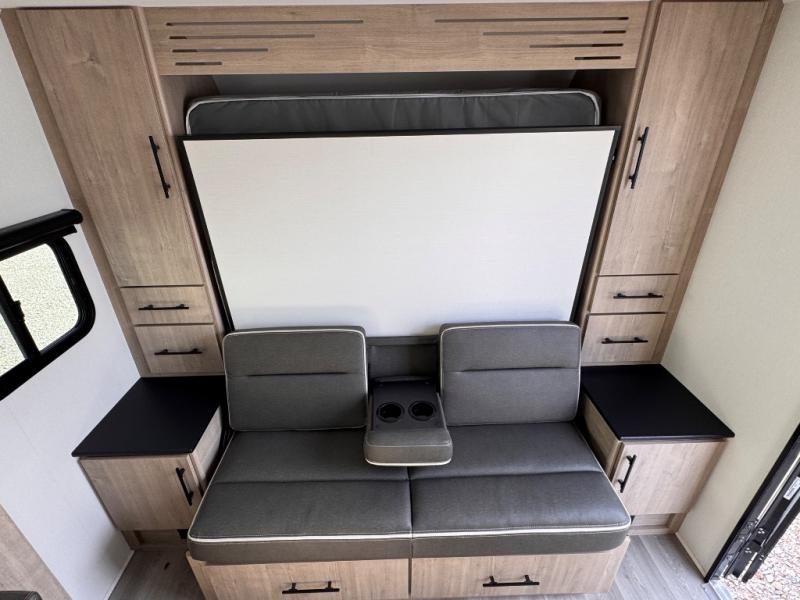 The Murphy bed is the eye-catching feature on this Imagine XLS travel trailer! Not only can it fold away in the morning to reveal a sofa for lounging, but it will also provide you with drawer storage under the sofa. Another functional feature is the theater dinette with a removable table in front, or you can choose the optional U-shaped dinette if you like to gather around for game night. It rests on the single slide so that there is more floor space, and it offers you great comfort while you dine across from the LED HDTV. A full bathroom will keep you clean and fresh with its residential walk-in shower, skylight, linen closet, vanity, toilet, and power vent fan.
