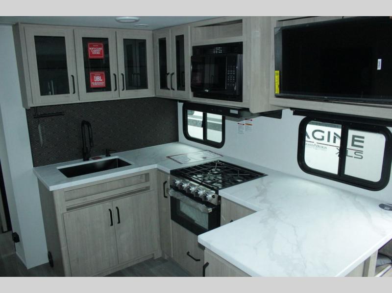 Let your imagination run wild with the possibilities that the Grand Design Imagine XLS travel trailer can provide! The Imagine XLS has been built with oversized tank capacities, an extra-large 2" fresh water drain valve, a ducted A/C system, a power tongue jack, and a heated and enclosed underbelly with suspended tanks. There is a designated heat duct to the subfloor and a residential ductless heating system throughout. For outdoor adventures, the electric awning with LED lights will enable you to stay protected, and the Tuff-Ply pass-thru flooring will withstand your adventures. You will also love the XLS Solar Package that comes with a 200W roof mounted solar panel, a 30 Amp charge controller, a 12V 10 cu. ft. refrigerator, and roof mounted quick connect plugs!