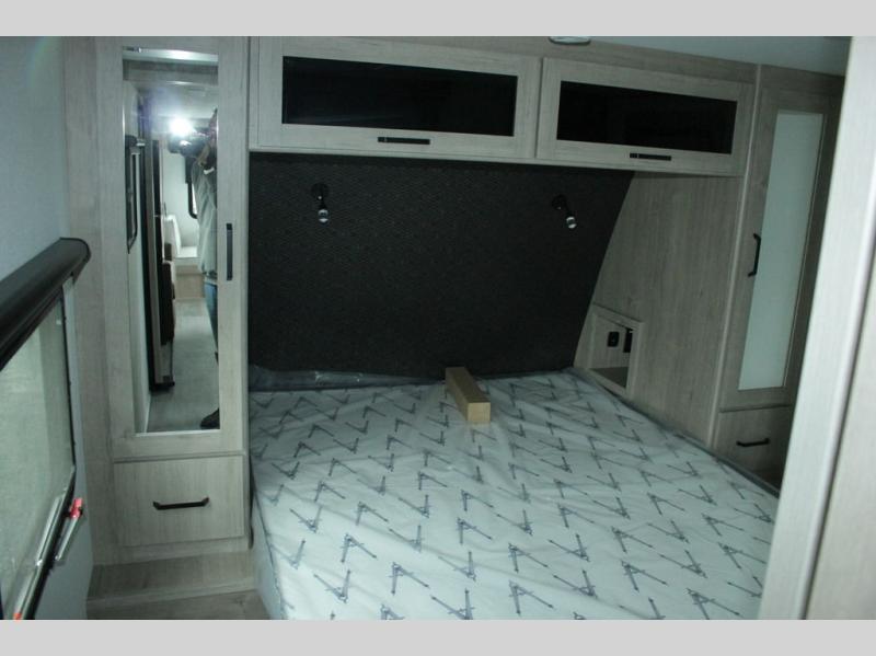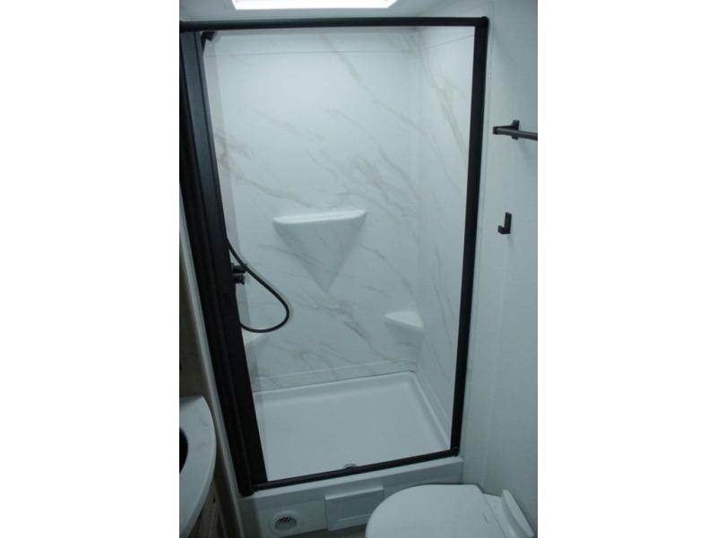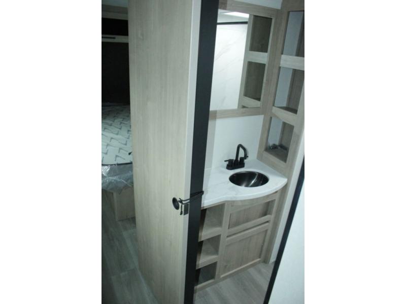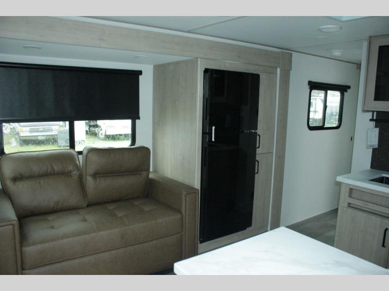 This 25RLE model travel trailer is designed for both comfort and convenience from front to back. At the front, the private bedroom features a spacious 60" x 80" queen bed with built-in wardrobe cubby storage and one of two entry doors for easy access. Moving down the hall, the full bathroom offers a residential-style walk-in shower with a skylight that adds both light and headroom, along with a mirrored medicine cabinet and linen shelves for towels and toiletries. The main living area opens up with a large slide out that houses 60" theater seating and a 10-cu. ft. refrigerator for all your fresh groceries, while a nearby pantry keeps your dry goods organized. Across from the slide, the U-shaped kitchen provides ample counter space, a three-burner range with oven, stainless steel sink, and microwave, everything you need to cook in comfort. At the rear, the booth dinette creates the perfect spot for meals or games and easily converts into an extra-sleeping area when needed.