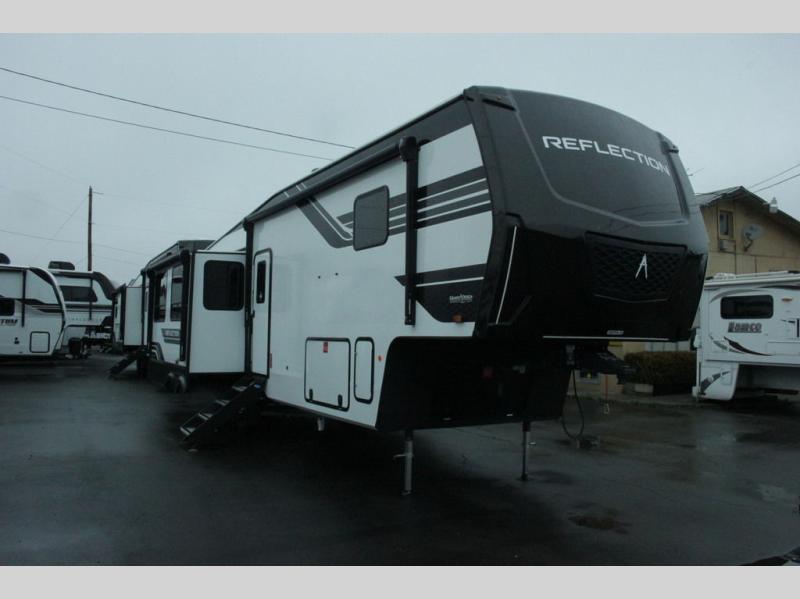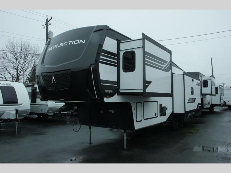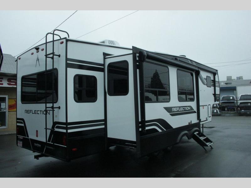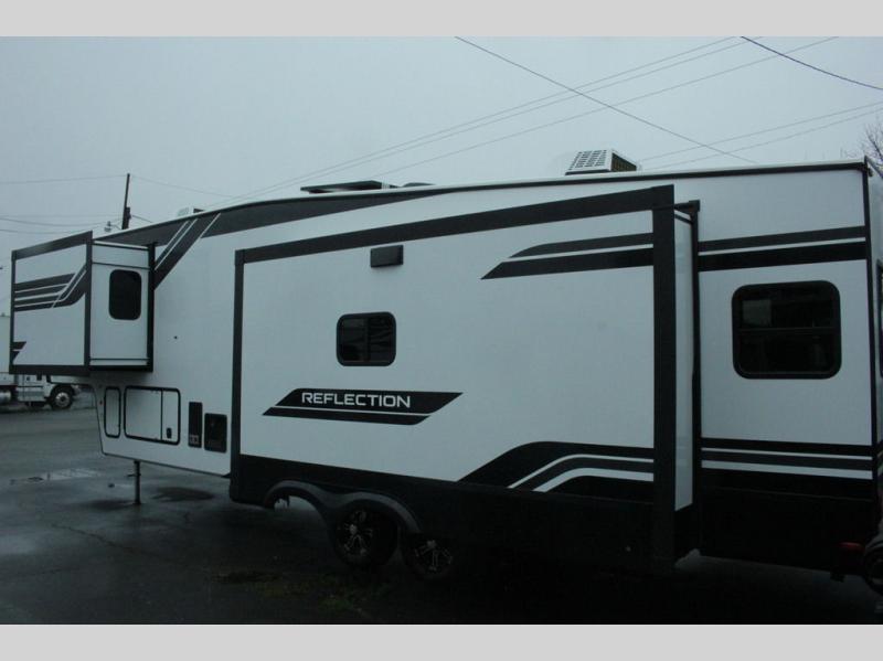 With any Reflection fifth wheel by Grand Design, you will have a solar panel for off-grid camping and a 60 amp charge controller and inverter prep, a Universal All-In-One docking station, unobstructed pass-through storage, and Goodyear Endurance tires. Each is constructed of gel coat exterior sidewalls, residential 5" truss rafters, walk-on roof decking, a fiberglass and radiant foil roof and front cap insulation plus laminated aluminum framed side walls, roof and end walls in slide rooms. Head inside to enjoy residential hardwood cabinet doors, premium Congoleum flooring, a spacious shower with a glass door, and many more comforts!