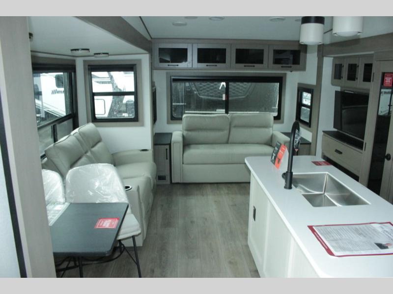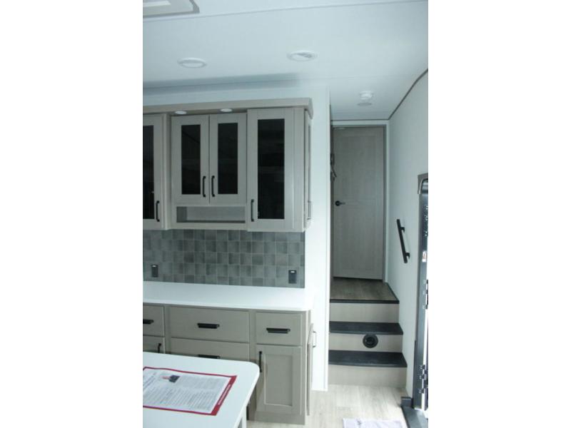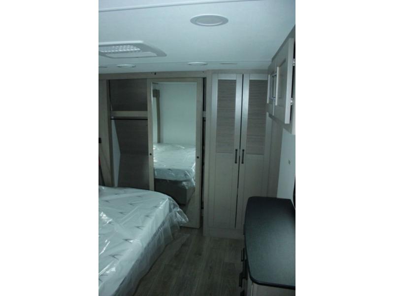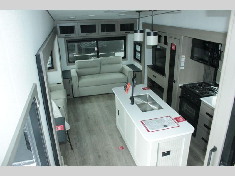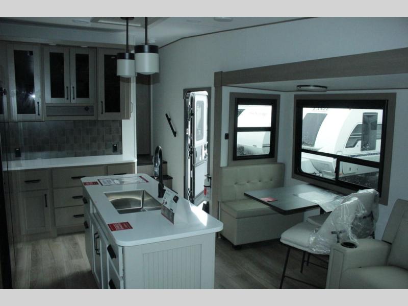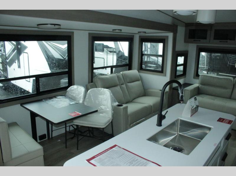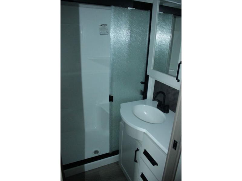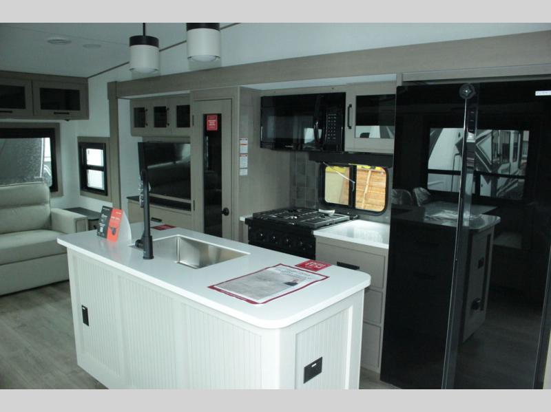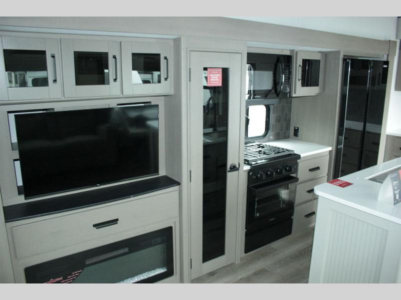 You can enjoy a spacious rear living area in this RV with dual opposing slides offering you entertainment, kitchen amenities, seating and windows for great views! The rear tri-fold sofa also converts into extra sleeping space for an extra guest or two, just like the booth dinette does. Yet you might like to add the swivel dinette option. There are theater seats to enjoy while you place your drinks in the cupholders and watch the entertainment center with a 40" LED HDTV and fireplace. The pantry is big enough to store your favorite snacks, and the kitchen island will make meal prepping easier, plus there is a 16 cu. ft. refrigerator to store any leftovers. The full bathroom has a 30" x 48" fiberglass shower and a linen closet to store your towels. The front private bedroom has a comfortable queen bed slide that can be switched out for the optional king bed, a dresser with overhead cabinets, and a full wall wardrobe that is prepped to add the optional washer and dryer so that you can extend your camping trip with clean clothes!