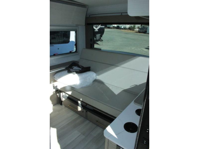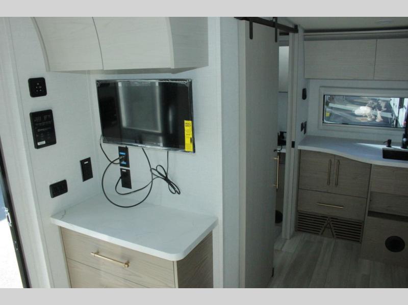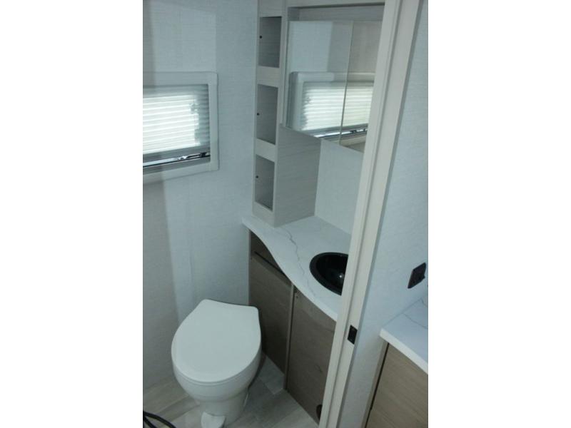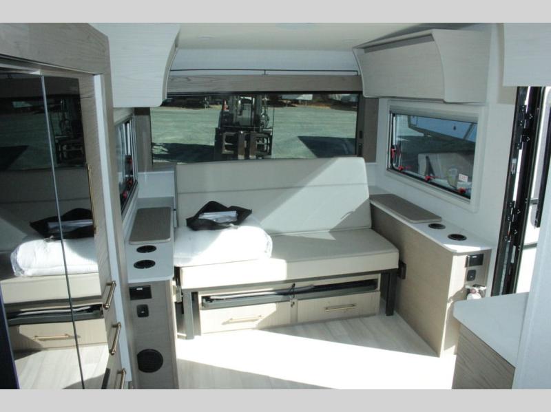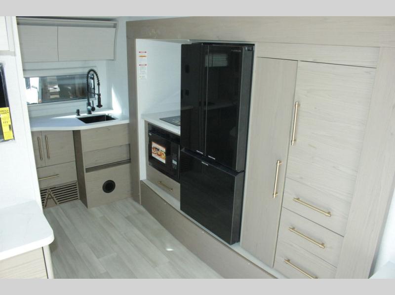 You'll love camping in this spacious and versatile travel trailer. There is a 60" x 76" flip bed up front that you can fold away during the day to relax on the sofa. An induction cooktop and convection microwave within the slide out will let you make meals each day, and you'll also find a wardrobe and pantry here for added storage. The rear corner kitchen includes ample counter space and overhead storage for dishes, spices and more. After a day outdoors, you can clean up in the rear corner bath, complete with a residential walk-in shower, bath skylight, 12V power vent fan plus more!