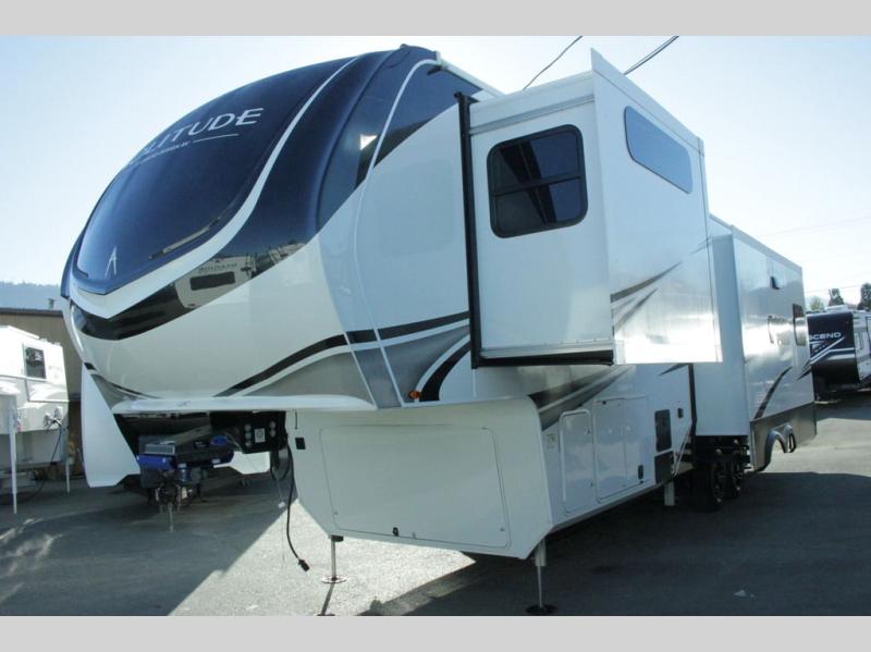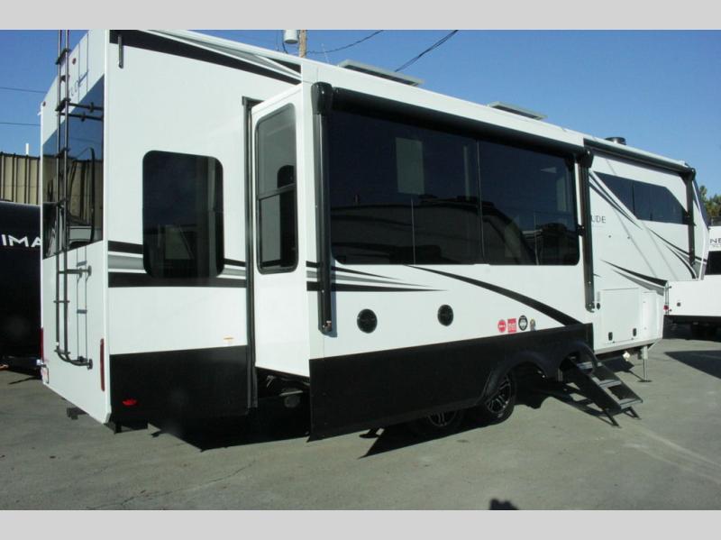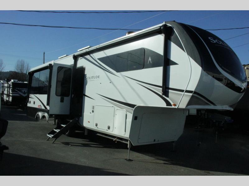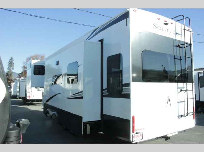 Each Solitude fifth wheel by Grand Design features a 101" wide-body construction, heavy duty 8,000 lb. axles, frameless tinted windows, and high-gloss gel coat sidewalls. You can camp year around thanks to the Weather-Tek Package that includes a 35K BTU high-capacity furnace, an all-in-one enclosed and heated utility center, and a fully enclosed underbelly with heated tanks and storage. Inside, you'll love the premium roller shades, hardwood cabinet doors, solid surface countertops, plus residential finishes throughout to make you truly feel at home. Each model also includes a MORryde CRE3000 suspension system, self adjusting brakes, and a MORryde pin box that will provide smooth towing from home to campground. Affordable luxury is possible with the Solitude fifth wheels; choose yours today!