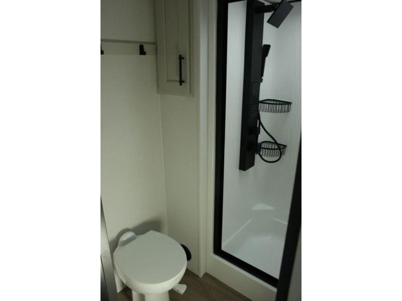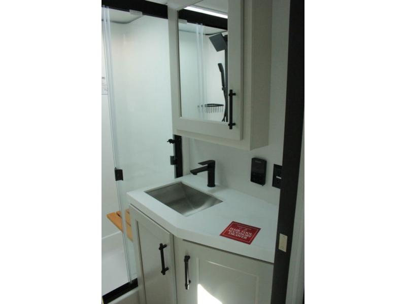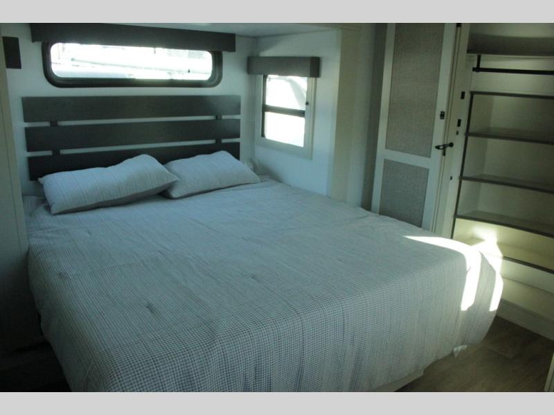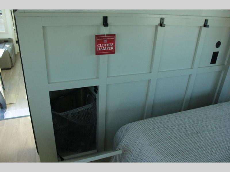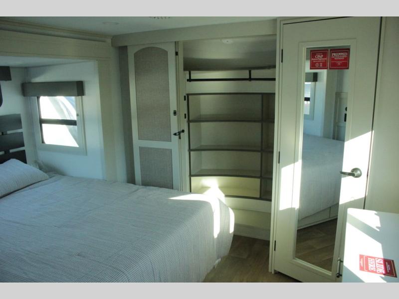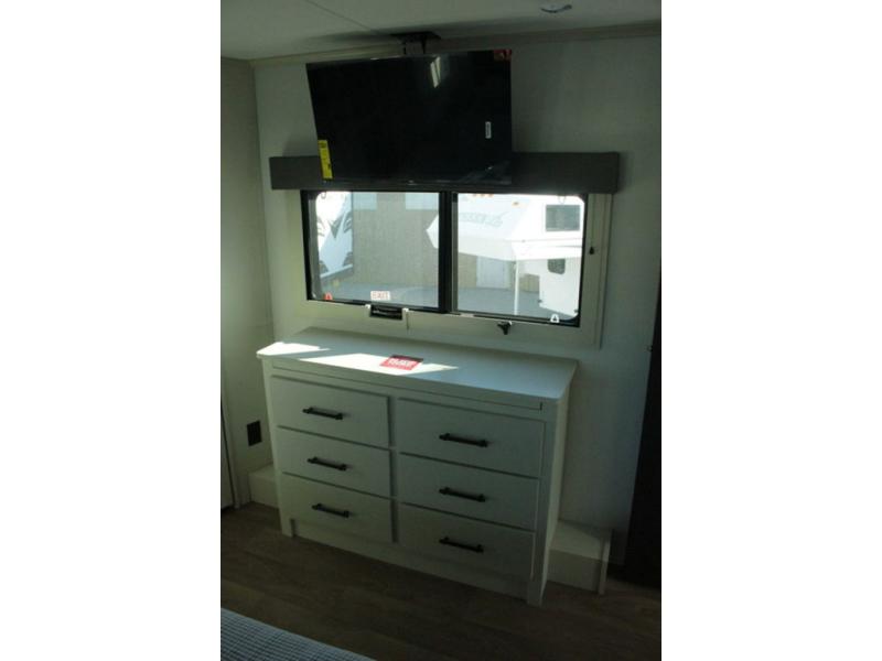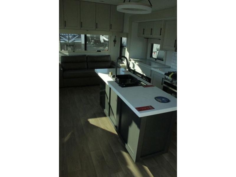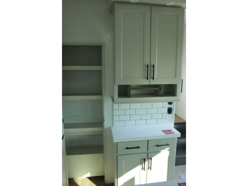 Traveling for long periods at a time is made easy with this gourmet kitchen that can feed your entire group a holiday meal! The professional-grade stainless steel cooktop with a built-in oven, microwave, 12V 20 cu. ft. refrigerator, and a kitchen island offers everything you will need to enjoy cooking for your family and guests. There is abundant storage throughout multiple overhead cabinets, a kitchen pantry and hutch, a bath linen cabinet for your towels, and in the front master bedroom which features a large closet. In the bedroom there is also a queen bed slide for added space to sleep comfortable at night, or you may choose an optional king bed if you enjoy more space. You will also find a closet with washer/dryer prep, large wardrobe, a clothes hamper plus a slide top dresser. Two nice awnings will provide outdoor living space keeping you protected from the sun and rain, and you can add an optional pull-out kitchen to enjoy convenient cooking outdoors as well.