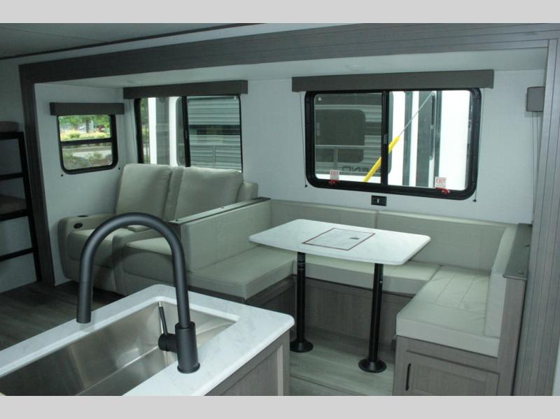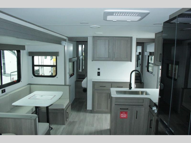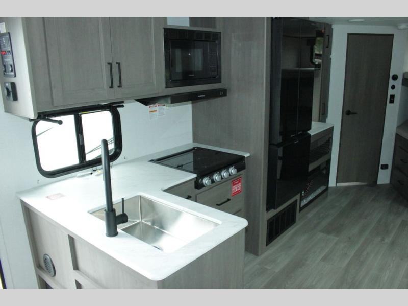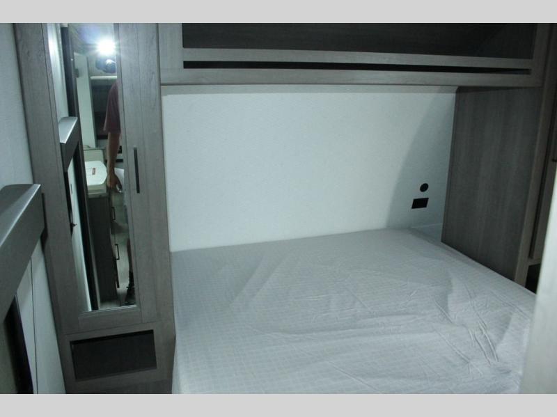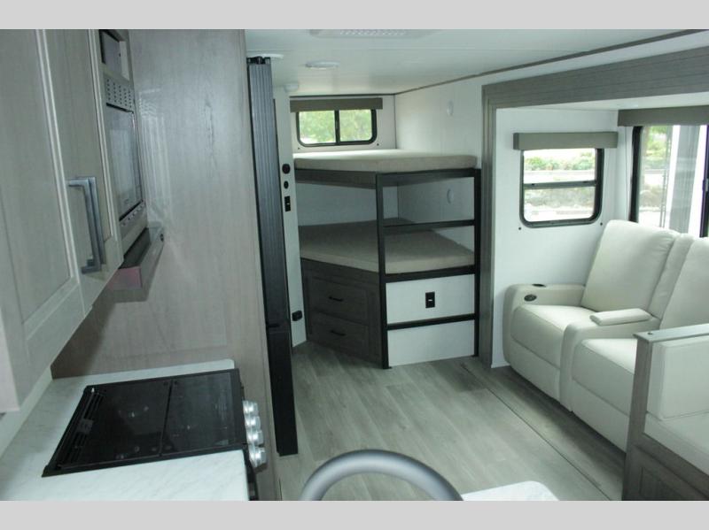 Get ready to take your travels to new heights with our incredible luxury travel trailer! The front bedroom has a queen bed, wardrobe, and overhead cabinets for all your favorite belongings, the perfect place to relax and recharge after a long day of adventure. The living room/kitchen combined area is equipped with a U-shaped dinette, three-burner cooktop, microwave, refrigerator, and pantry. The full bathroom is spacious and complete with a linen closet for added convenience. And with double-sized bunk beds featuring curtains and under-bunk storage, the kids will have their cozy retreat. But the adventure doesn't stop there! Outside, you'll find an exterior griddle with a 1.7 refrigerator, perfect for cooking up a storm in the great outdoors. And with a massive 19’ awning, you'll have plenty of shade and protection from the elements, plus, with two entry/exit doors and pass-through storage, you'll have easy access to the trailer and all your gear.
