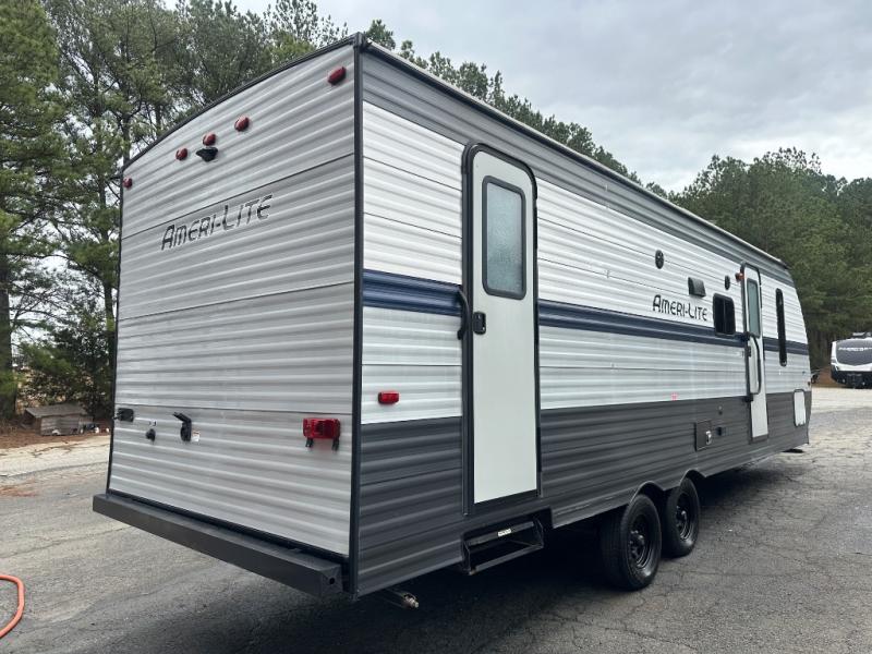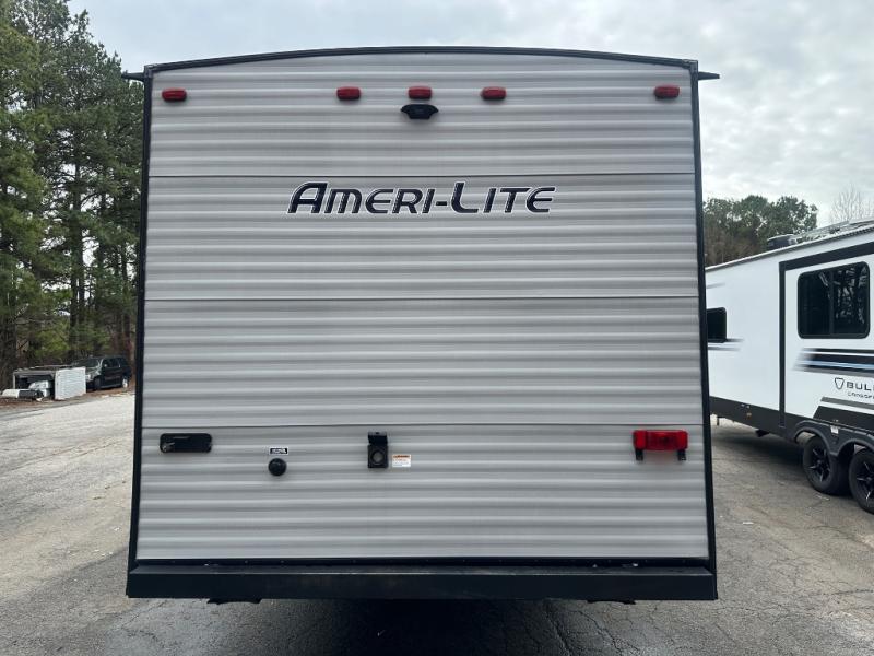 The Ameri-Lite Ultra Lite travel trailers by Gulf Stream are the perfect RV for families wanting to start their camping lifestyle, but not break the bank. These lightweight units are built with a diamond plate lower front, a one-piece synthetic vinyl roof, and a uni-body construction with steel hurricane straps tying the walls to the floor for added durability. The front power hitch jack and four stabilizer jacks will make set-up hassle-free once you arrive at the campground, and you can put out the electric awning to rest in the shade when you're done. Each model includes convenient amenities, like the 13,500 BTU A/C, the tankless water heater, a central control panel, and multiple USB ports for your tablet, phone, and camera! The inside is designed to make you feel at home with radiant LED lighting, designer kitchen backsplash, pleated privacy shades, craft-made cabinetry, plus many more features. Start your RV lifestyle with an affordable, lightweight Ameri-Lite Ultra Lite travel trailer today!